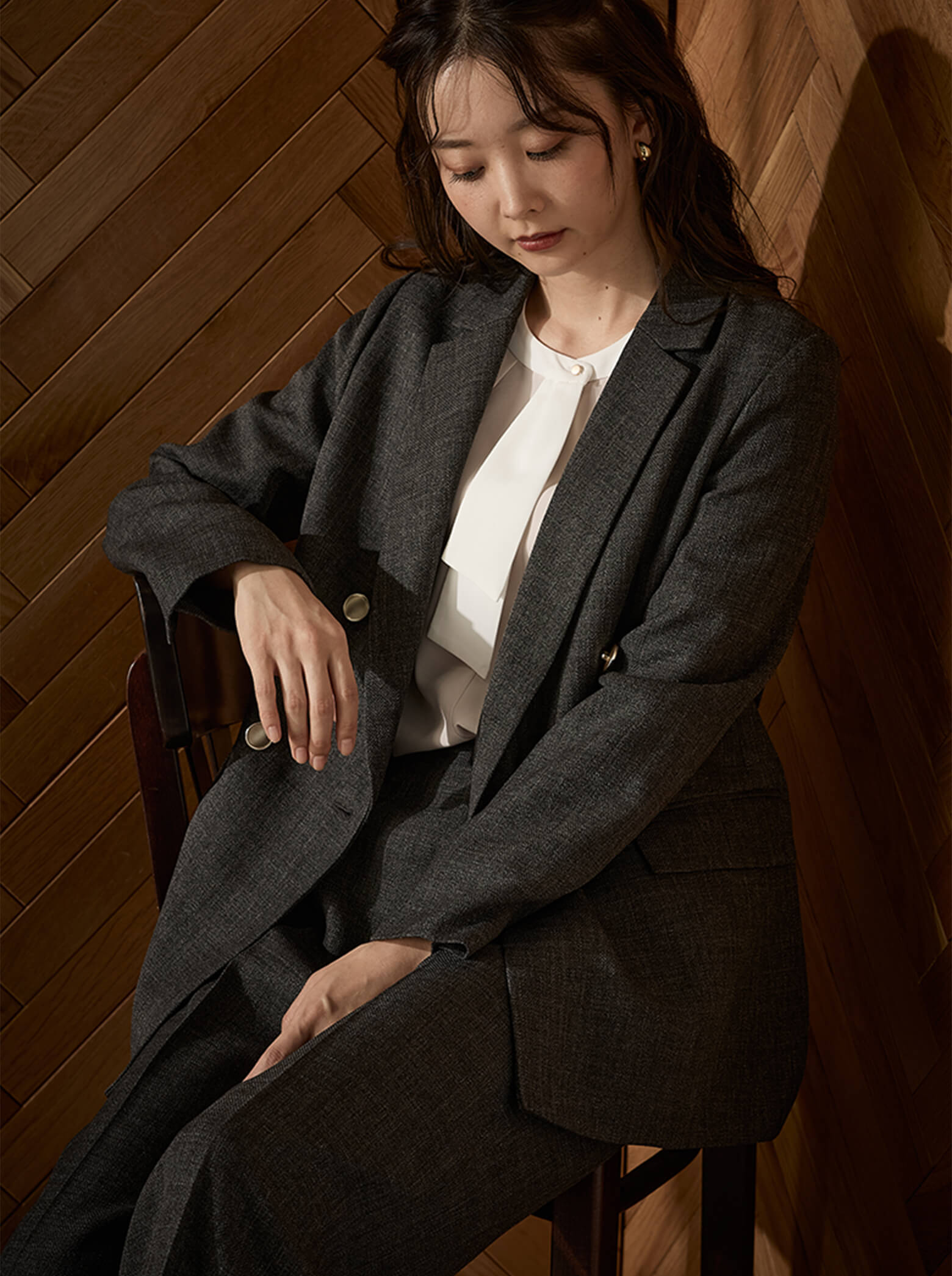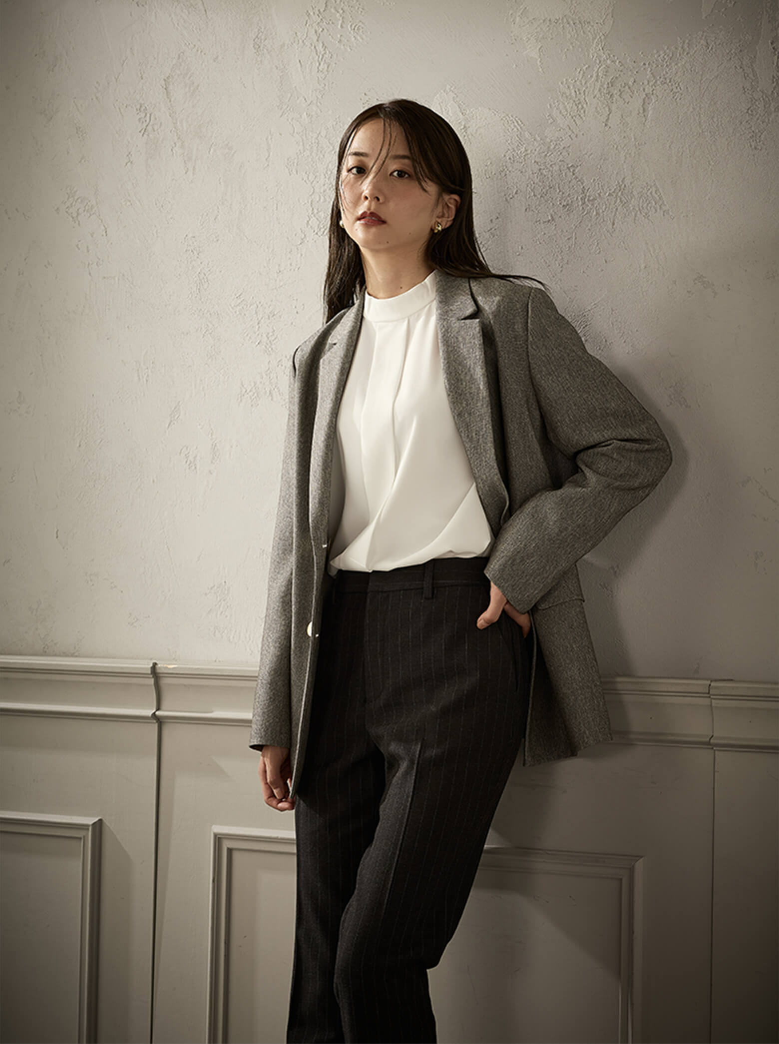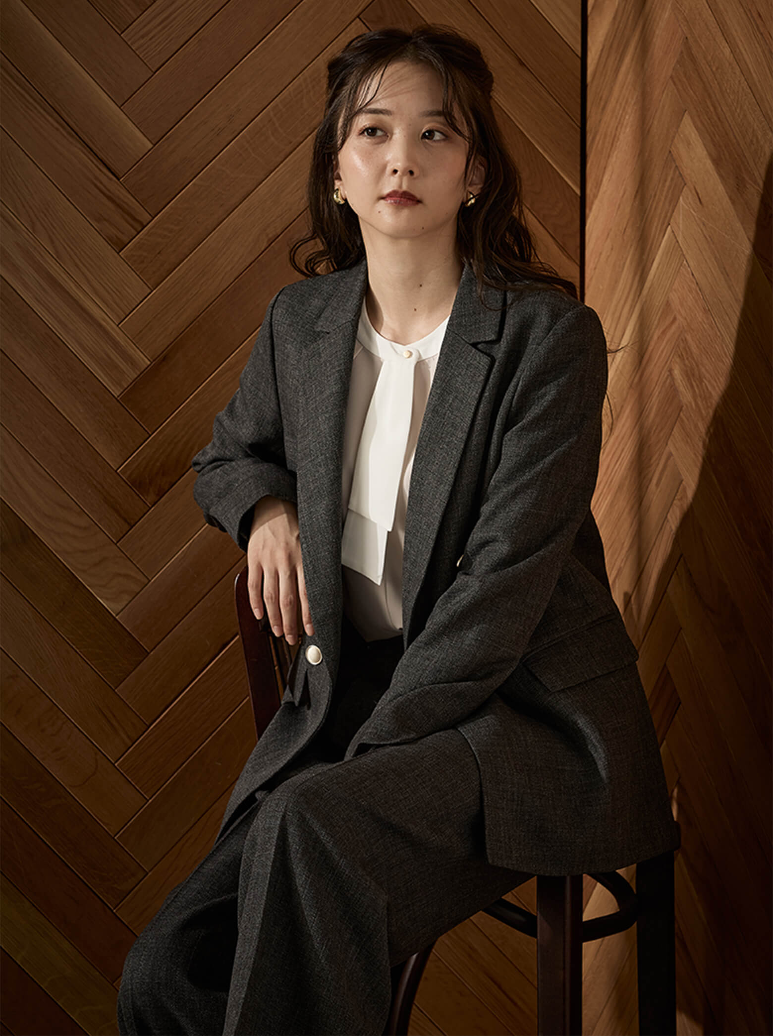 淡いピンクのボウタイブラウスが持つ華やかさがミックスマッチ。
