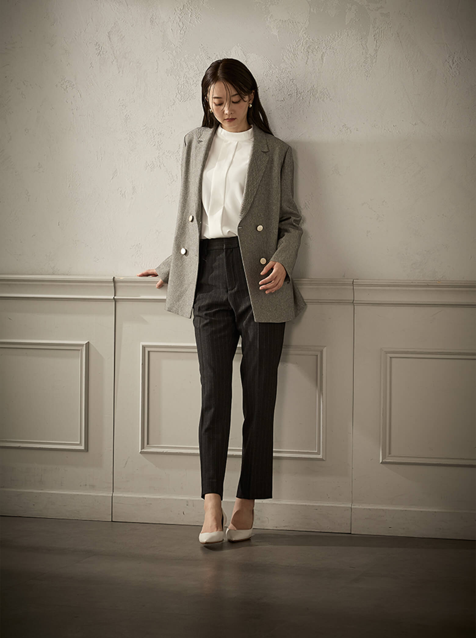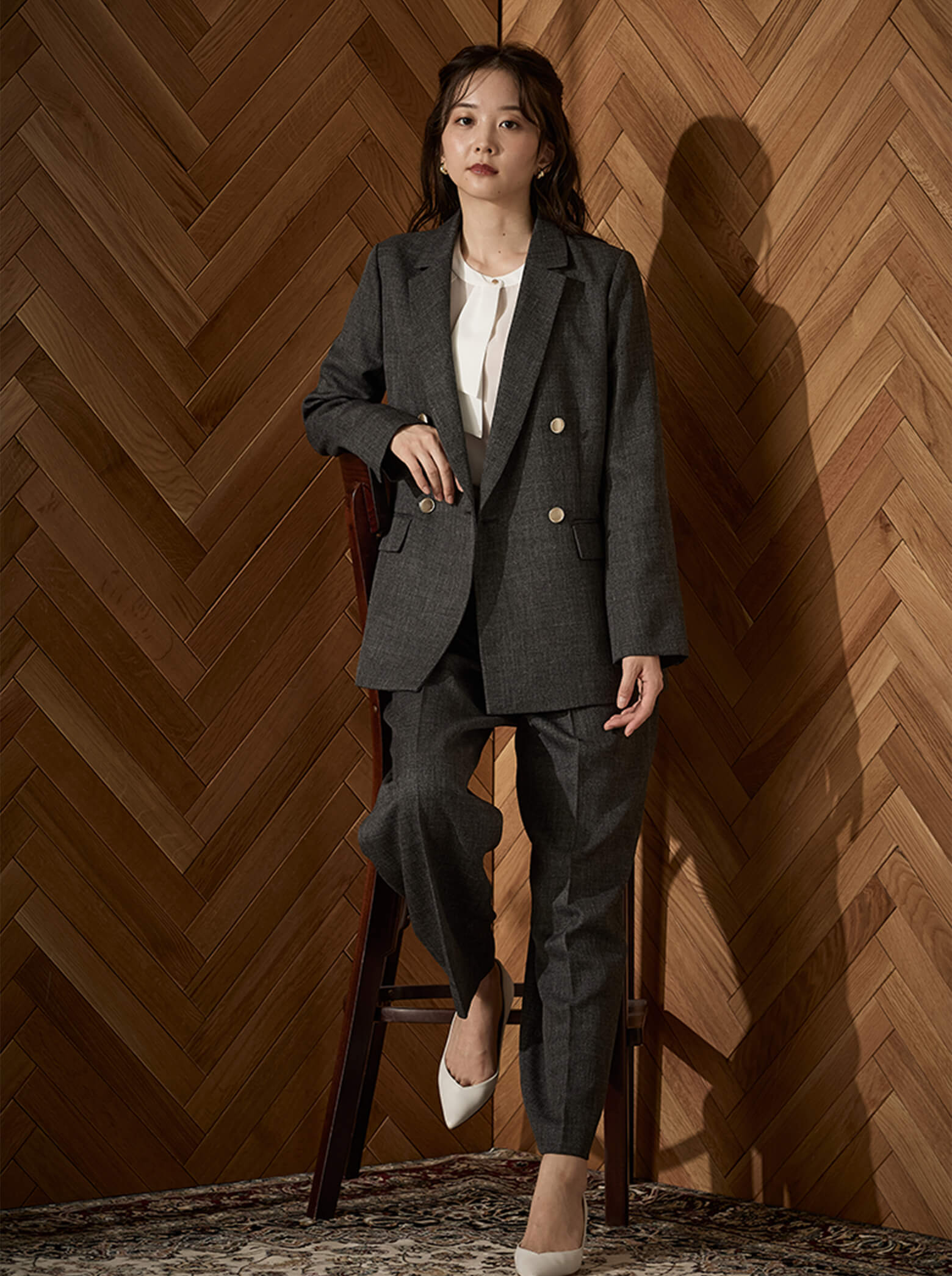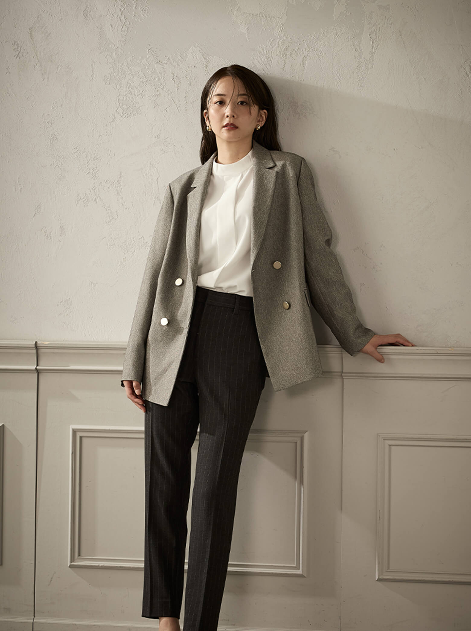 淡いピンクのボウタイブラウスが持つ華やかさがミックスマッチ。