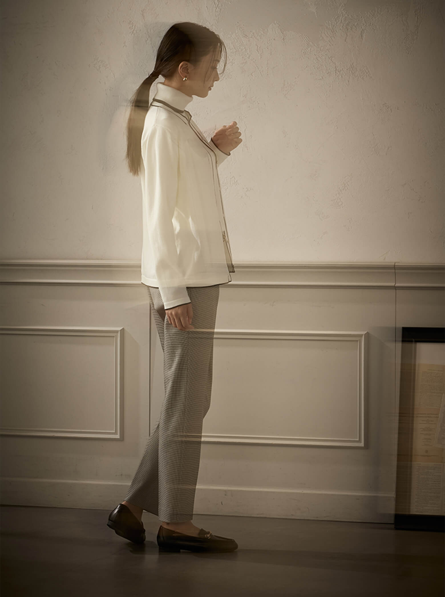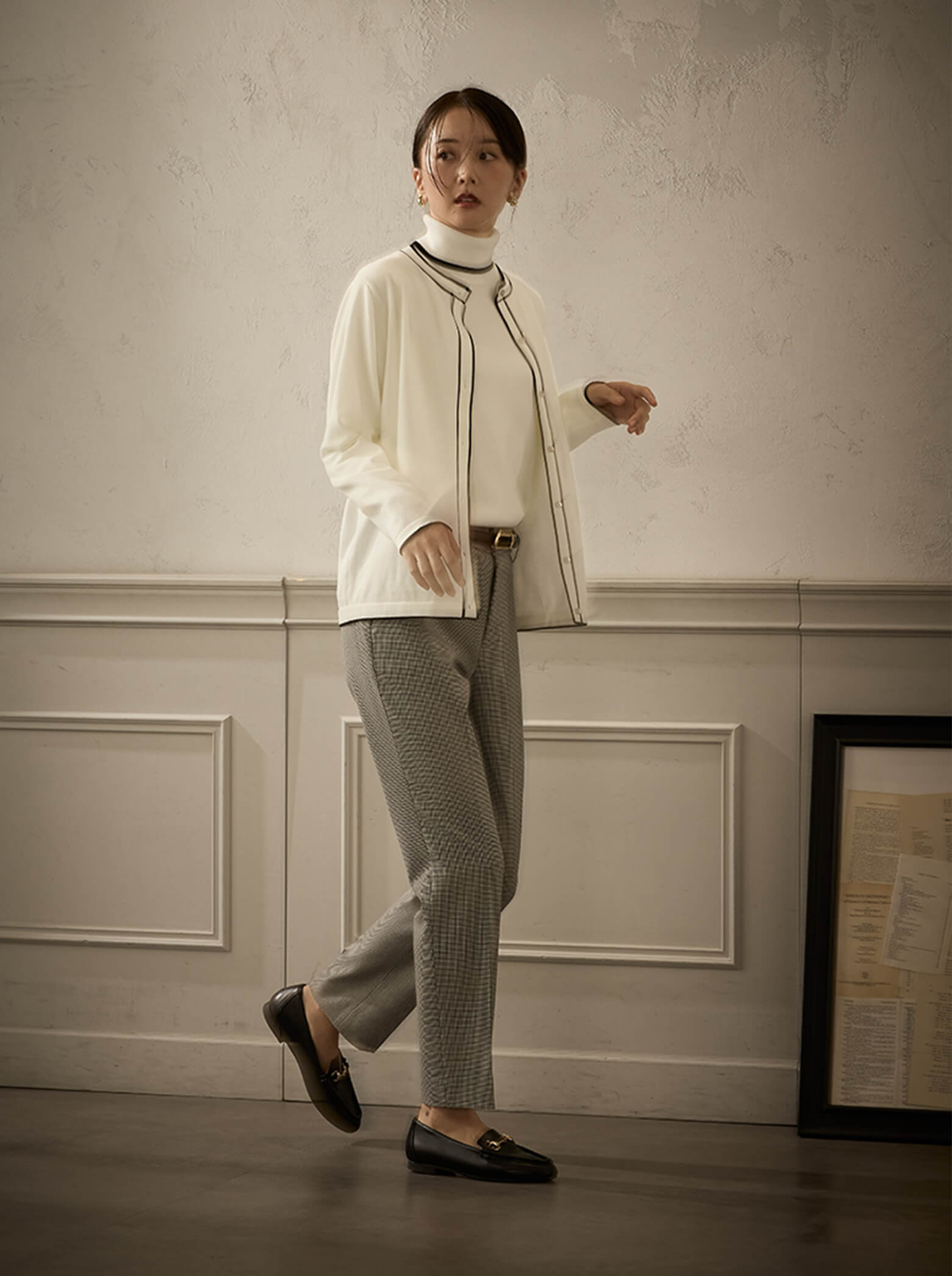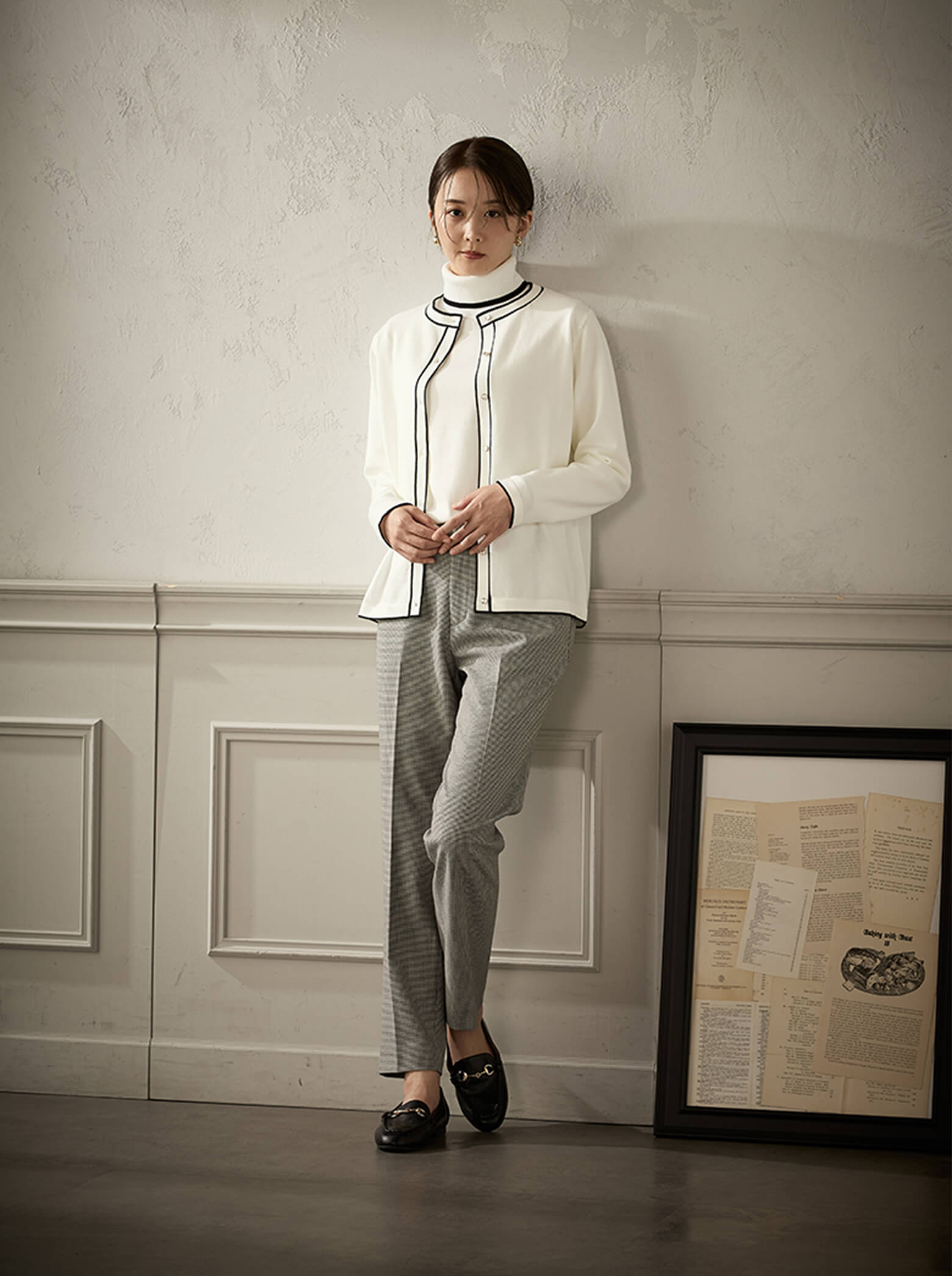 トラッドなパイピングを効かせたニットをアンサンブルとして。