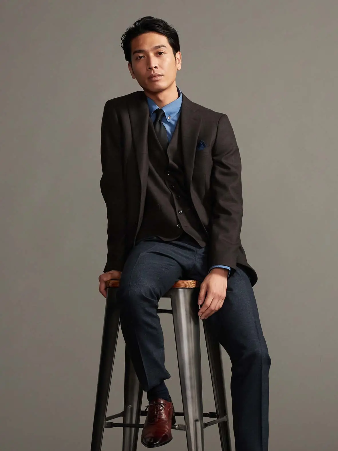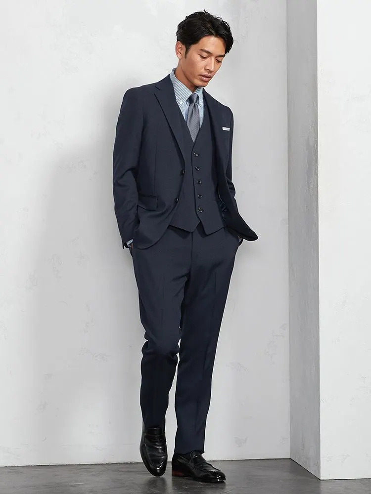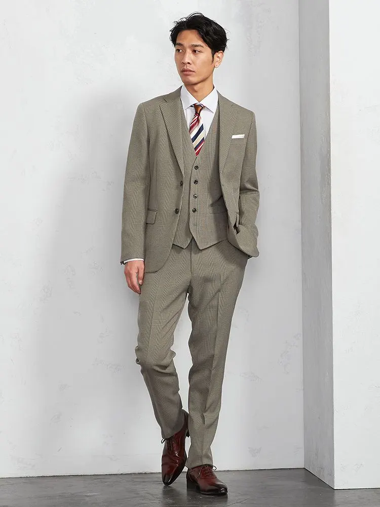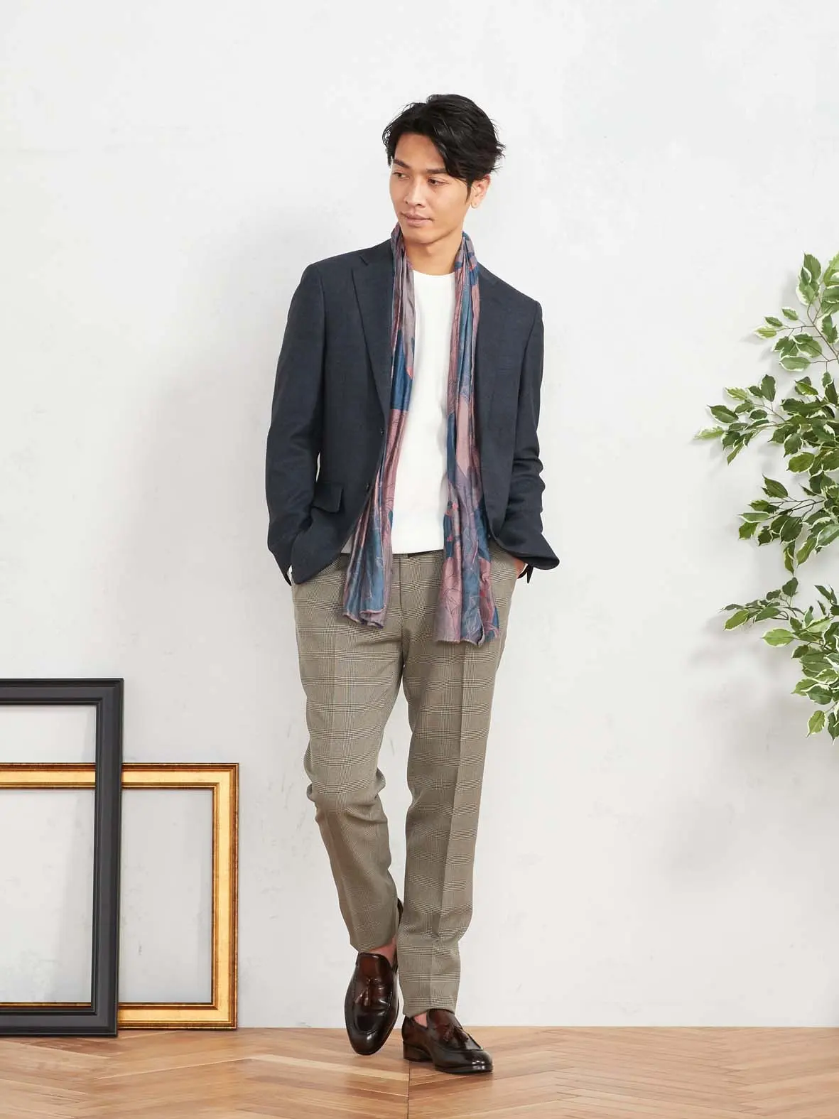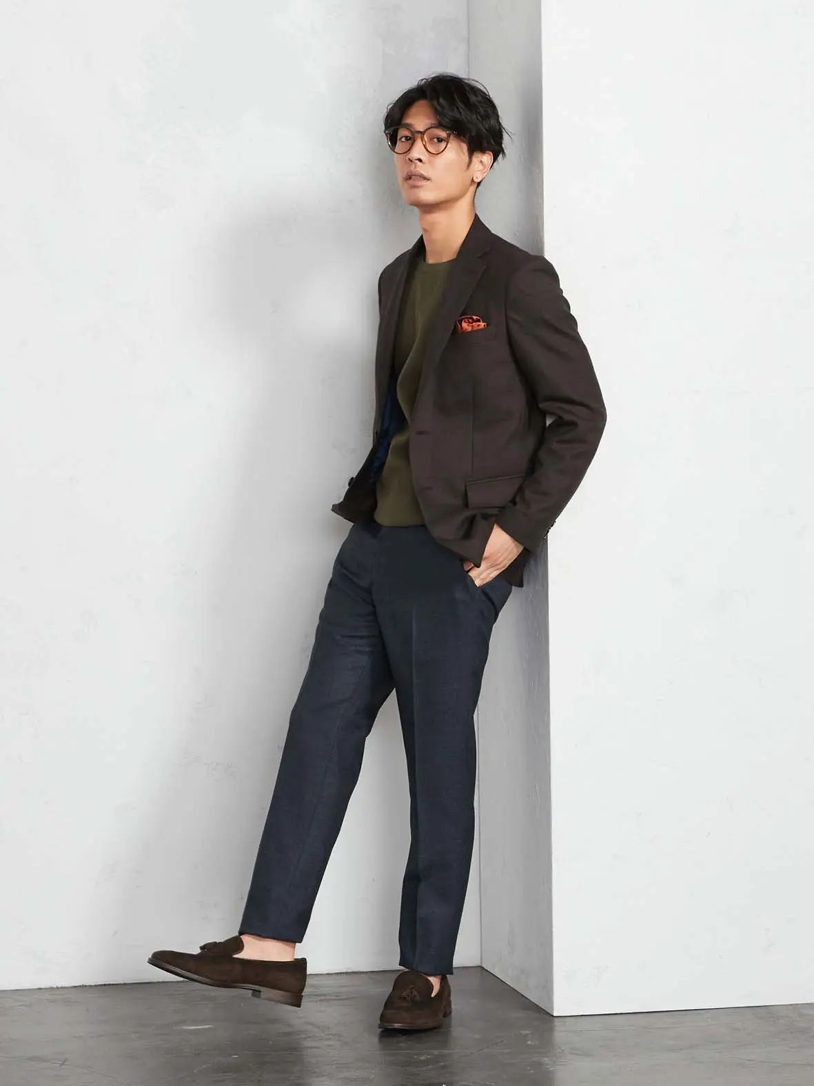 上下共生地のセットアップだけでなく、上下別素材やジャケパンスタイルも可能。