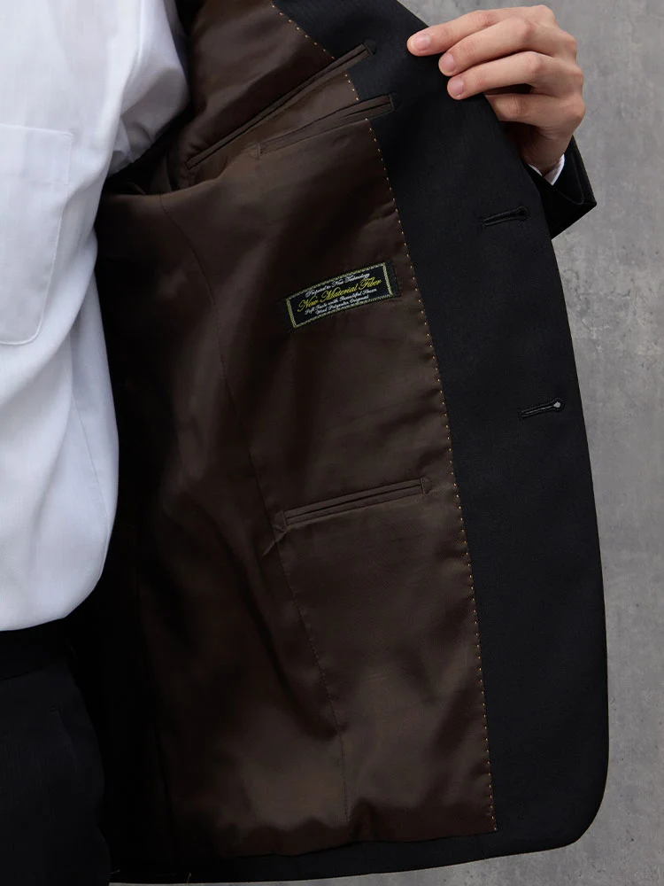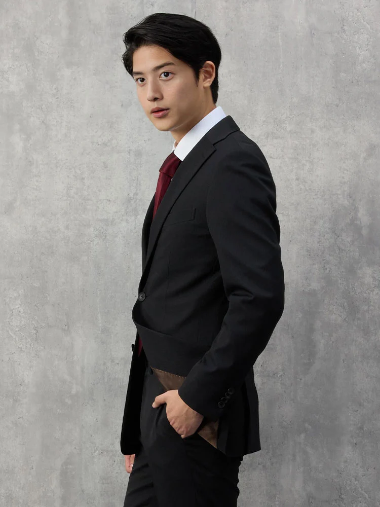 艶感のある風合いに浮き立つようなコードシャドーや、ウッド調のボタンが映えるスーツ。