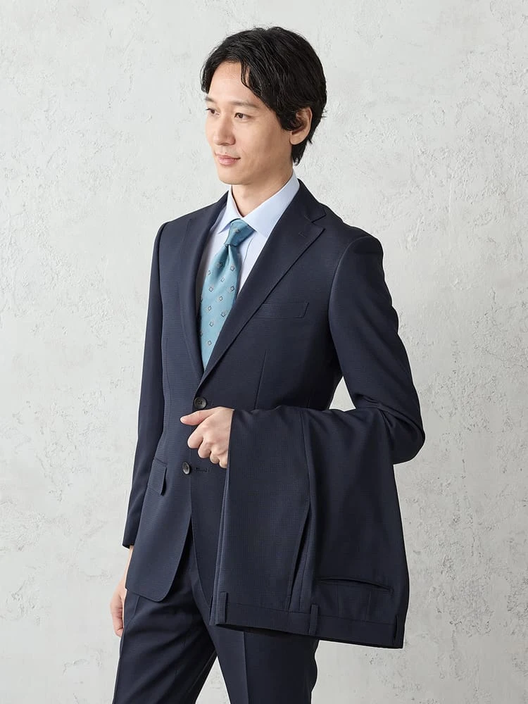 伸縮性や形態回復に優れた「帝人」の機能生地「ソロテックス?」を採用した、ミニチェック柄のジャケット。
