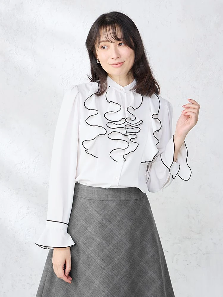配色パイピングフリルブラウス【dazzlin×P.S.FA】ホワイト/グレー