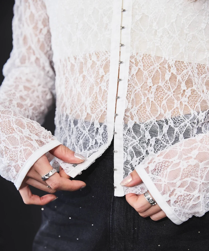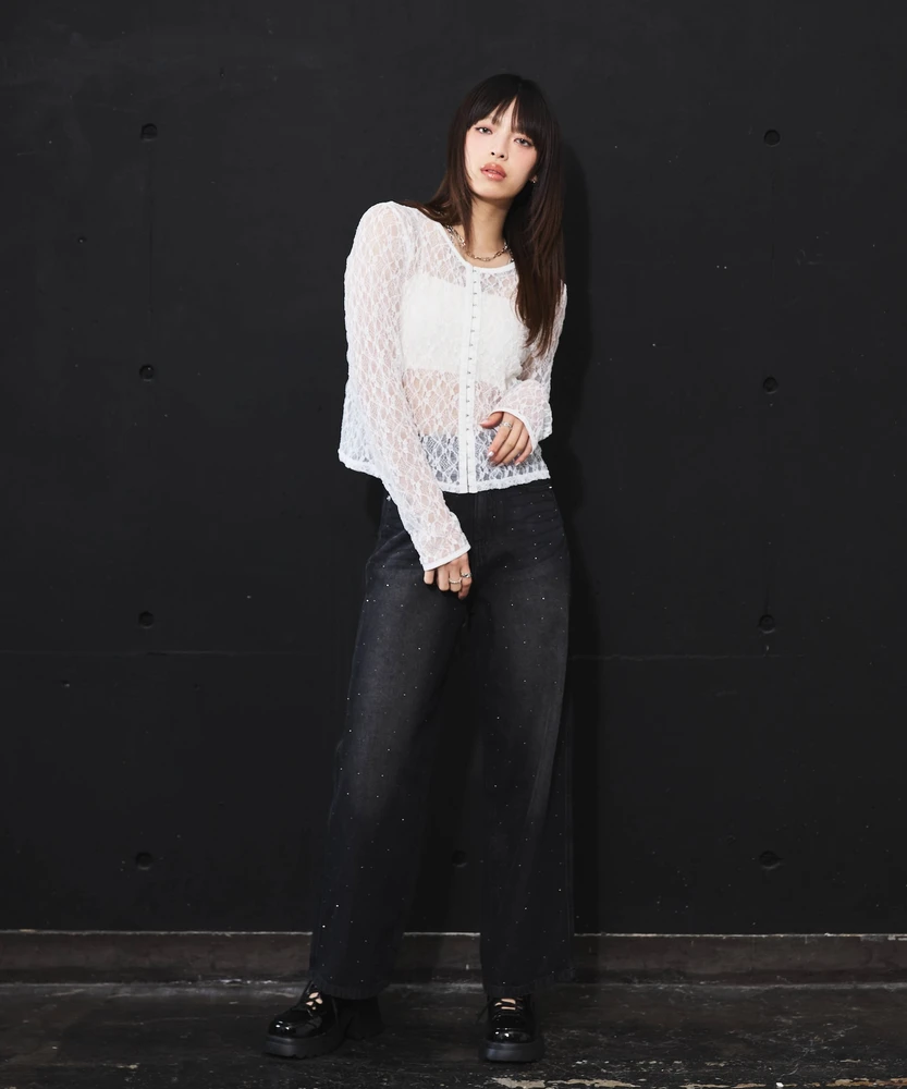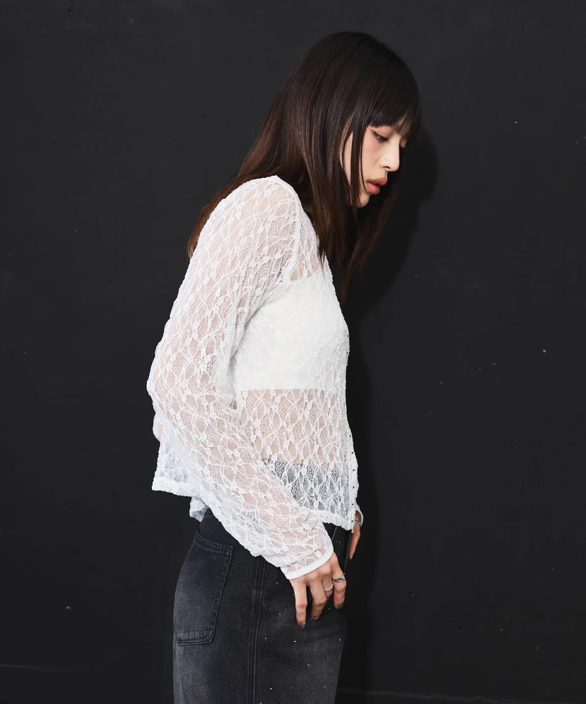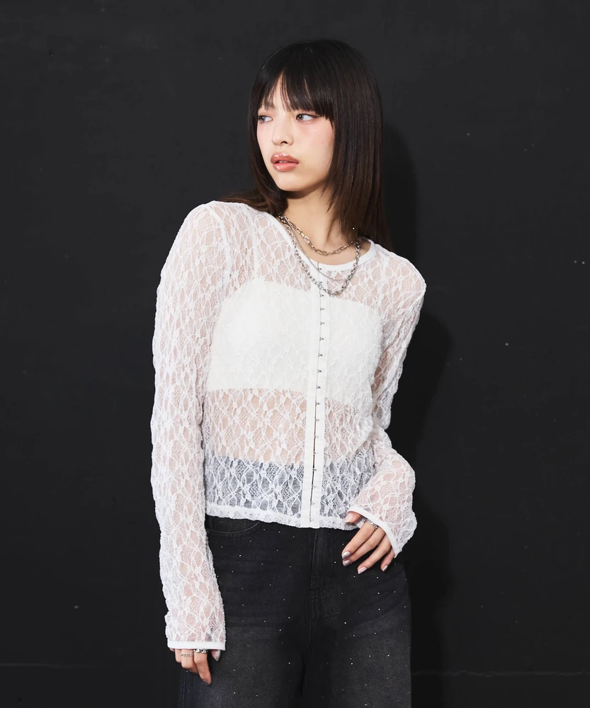 レースの透け感がフェミニンで上品な印象を与える一方で、ホックのディテールがモードなアクセントとなり、さまざまなコーディネートに使いやすいアイテムです。
