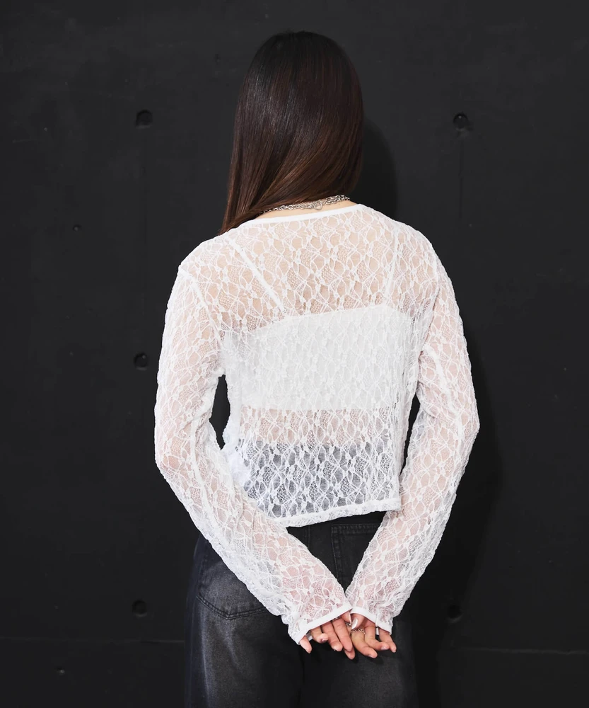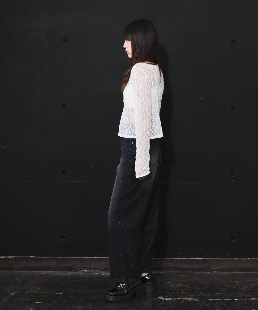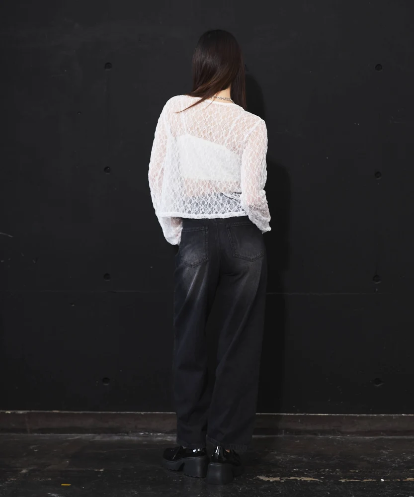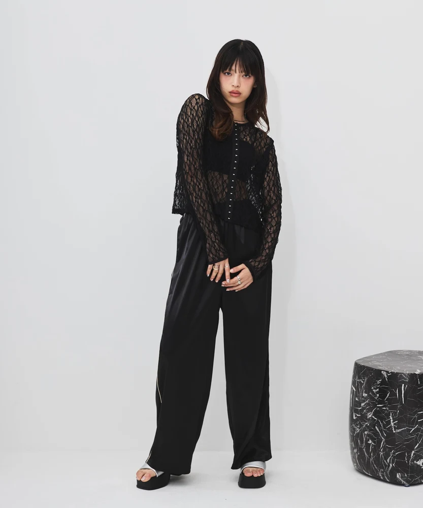 レースの透け感がフェミニンで上品な印象を与える一方で、ホックのディテールがモードなアクセントとなり、さまざまなコーディネートに使いやすいアイテムです。