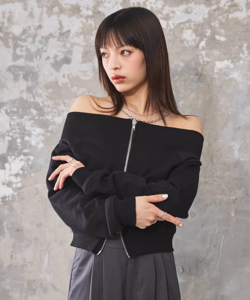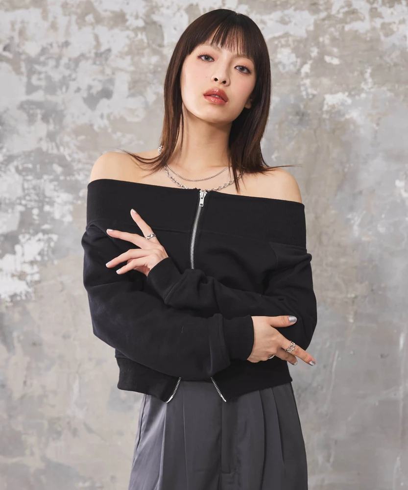モダンで大胆なフロントジップオフショルプルオーバー。