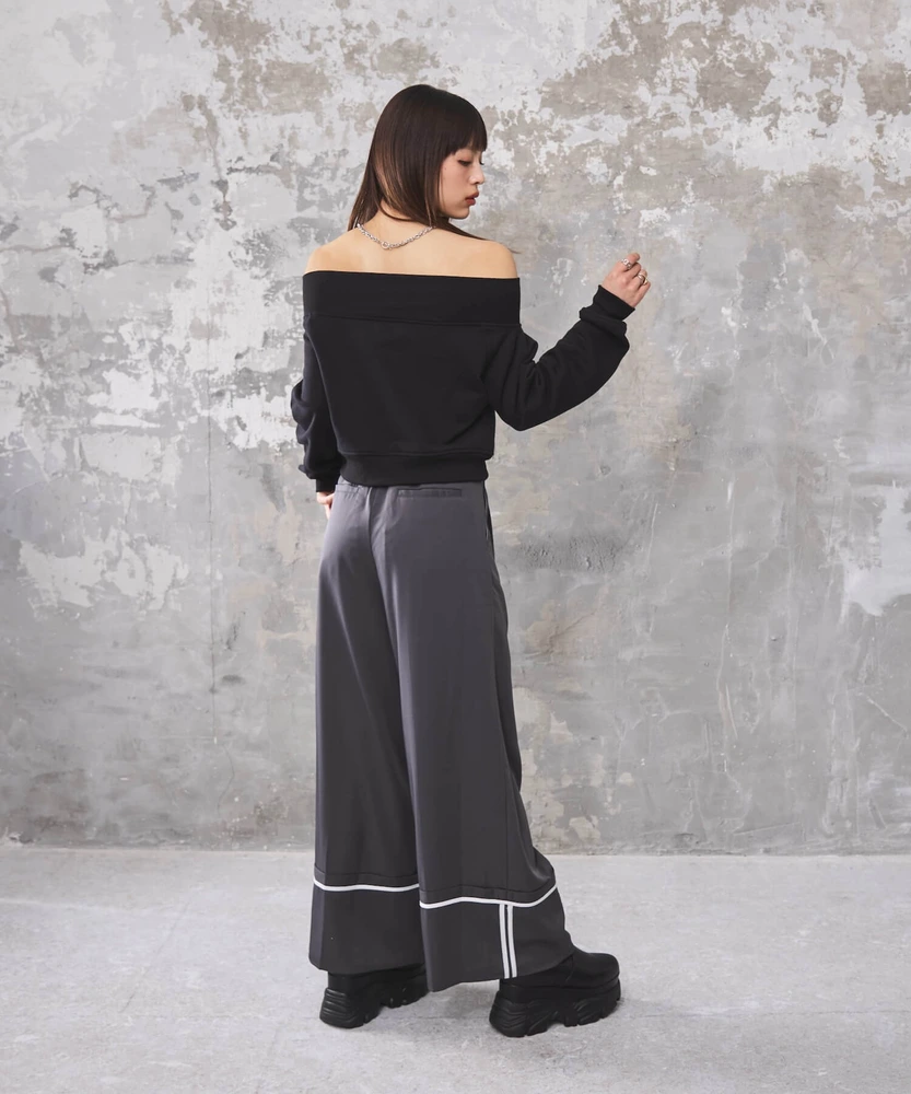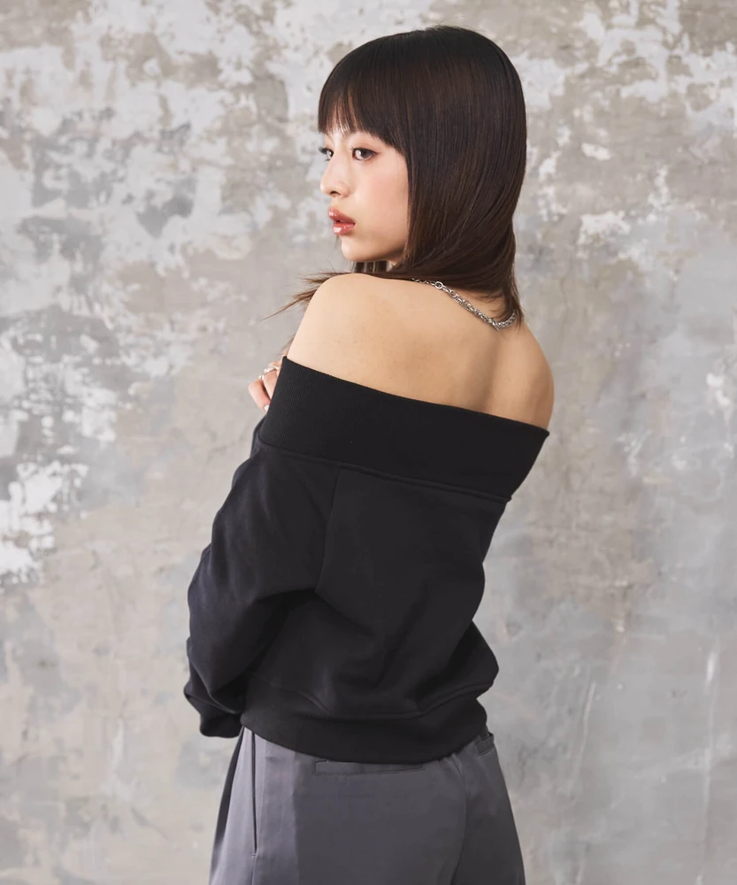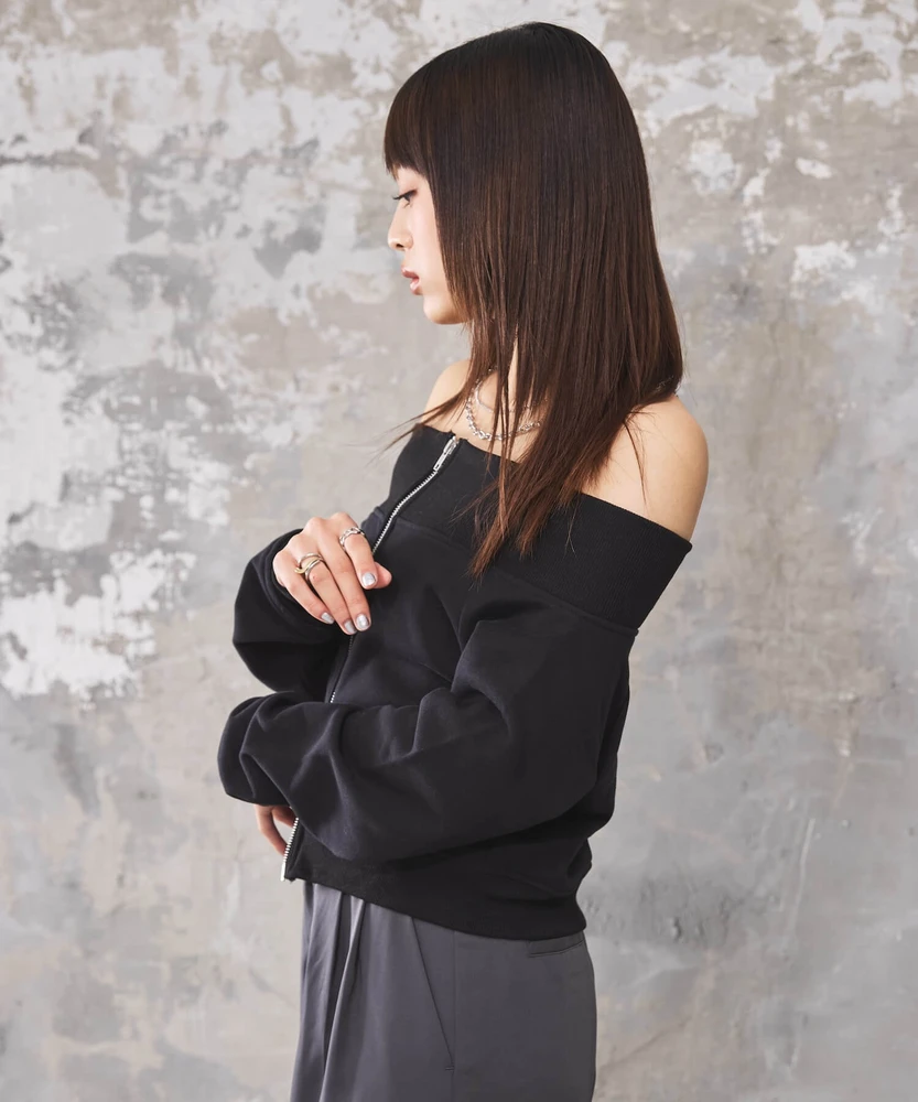フロントジップオフショルプルオーバーは、シンプルながらも大胆なデザインが印象的なアイテムです。