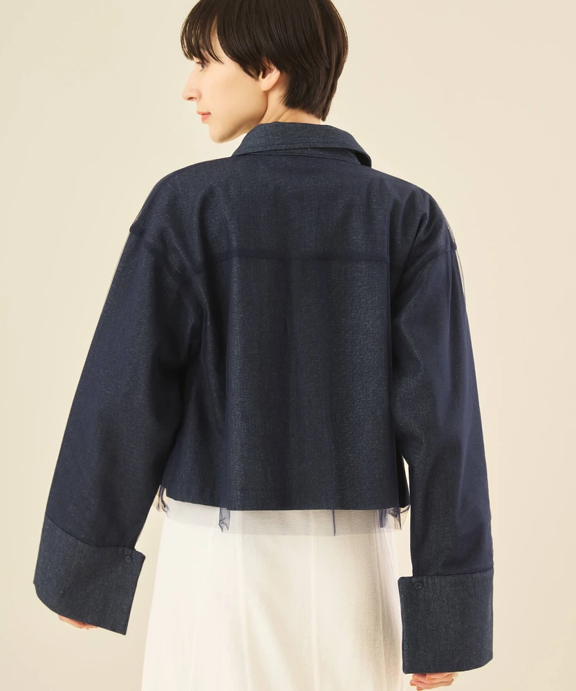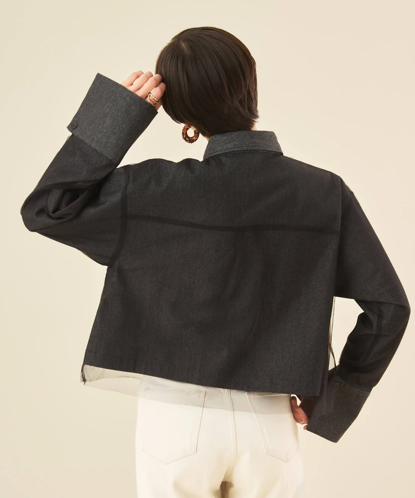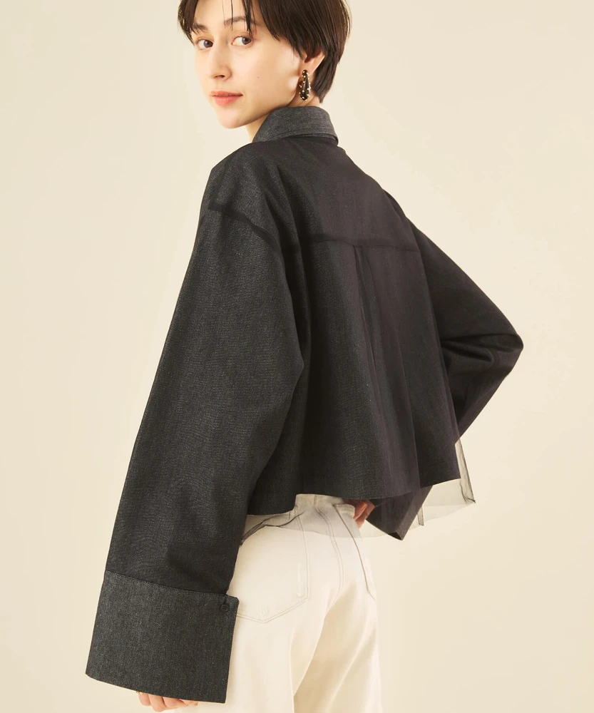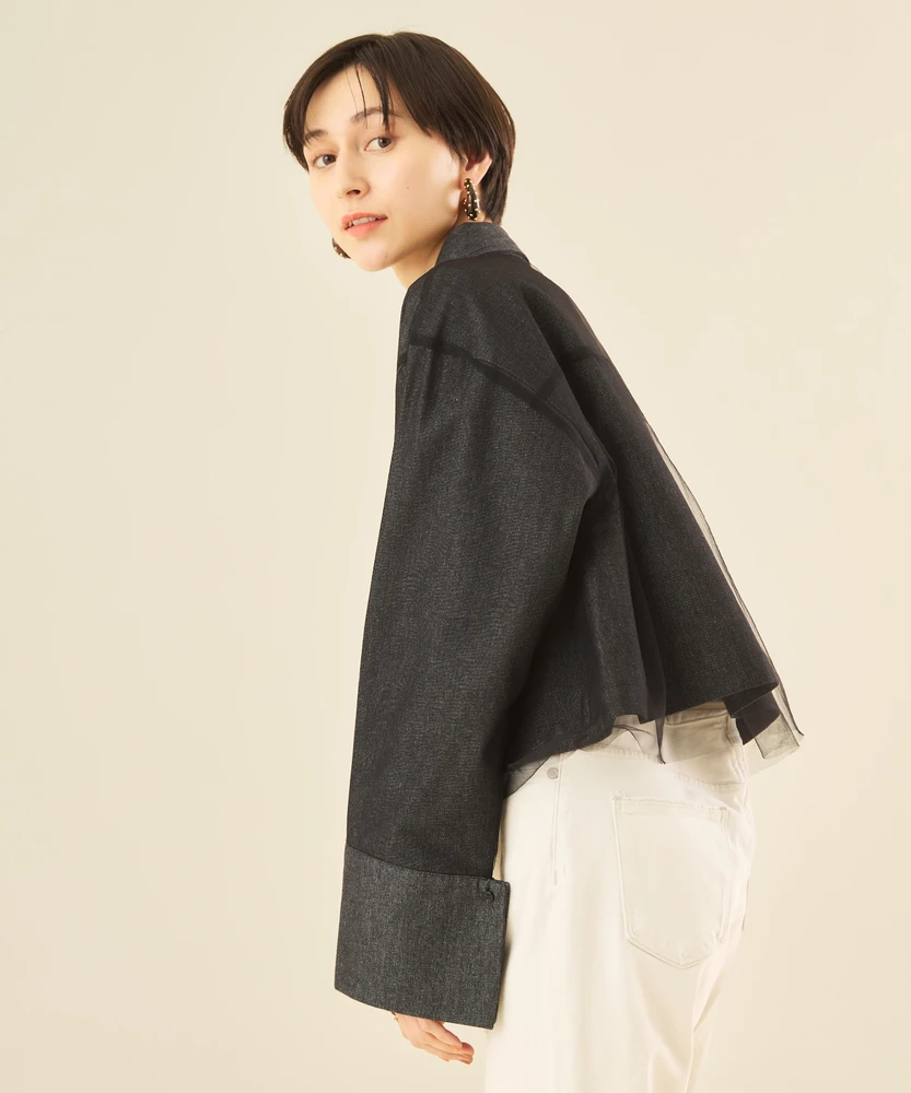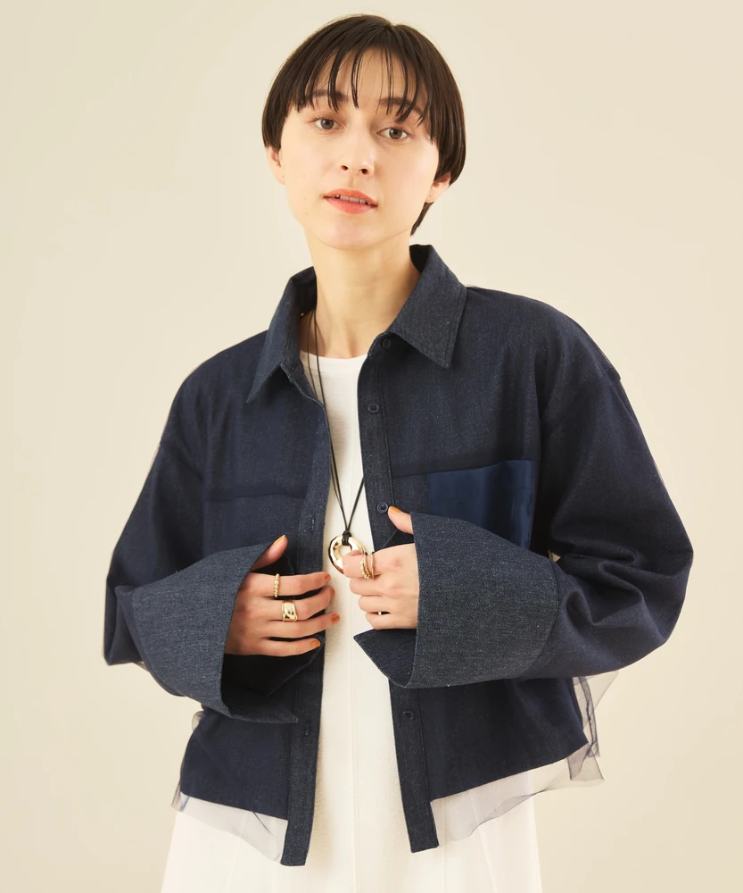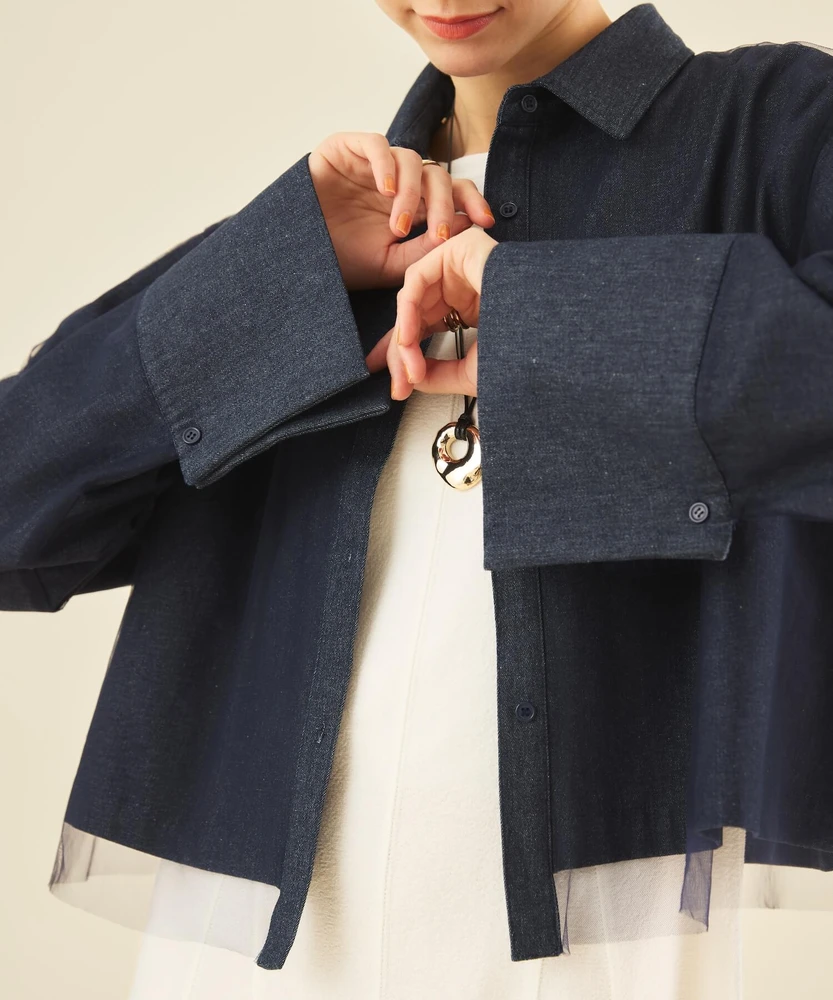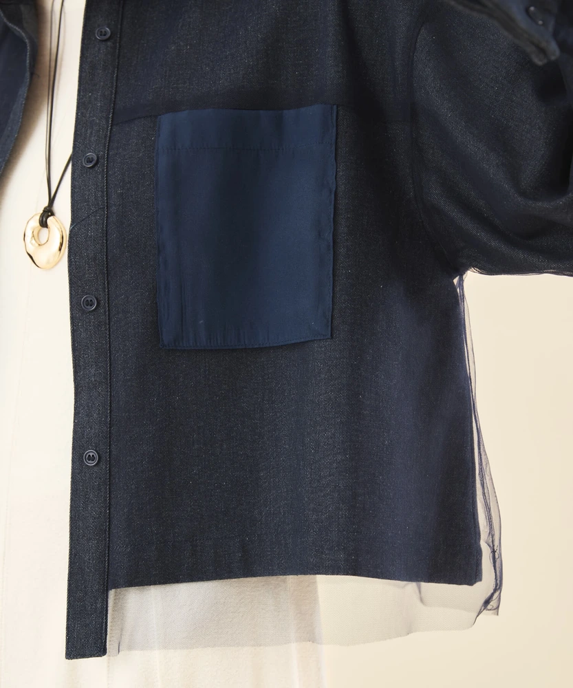 チュールをレイヤードしたデニムシャツで、羽織るだけで華やかなトレンド感を演出
