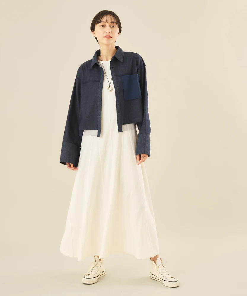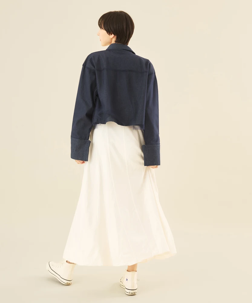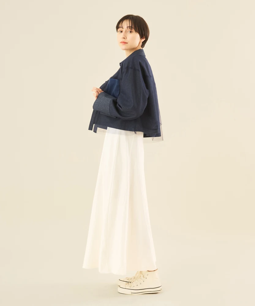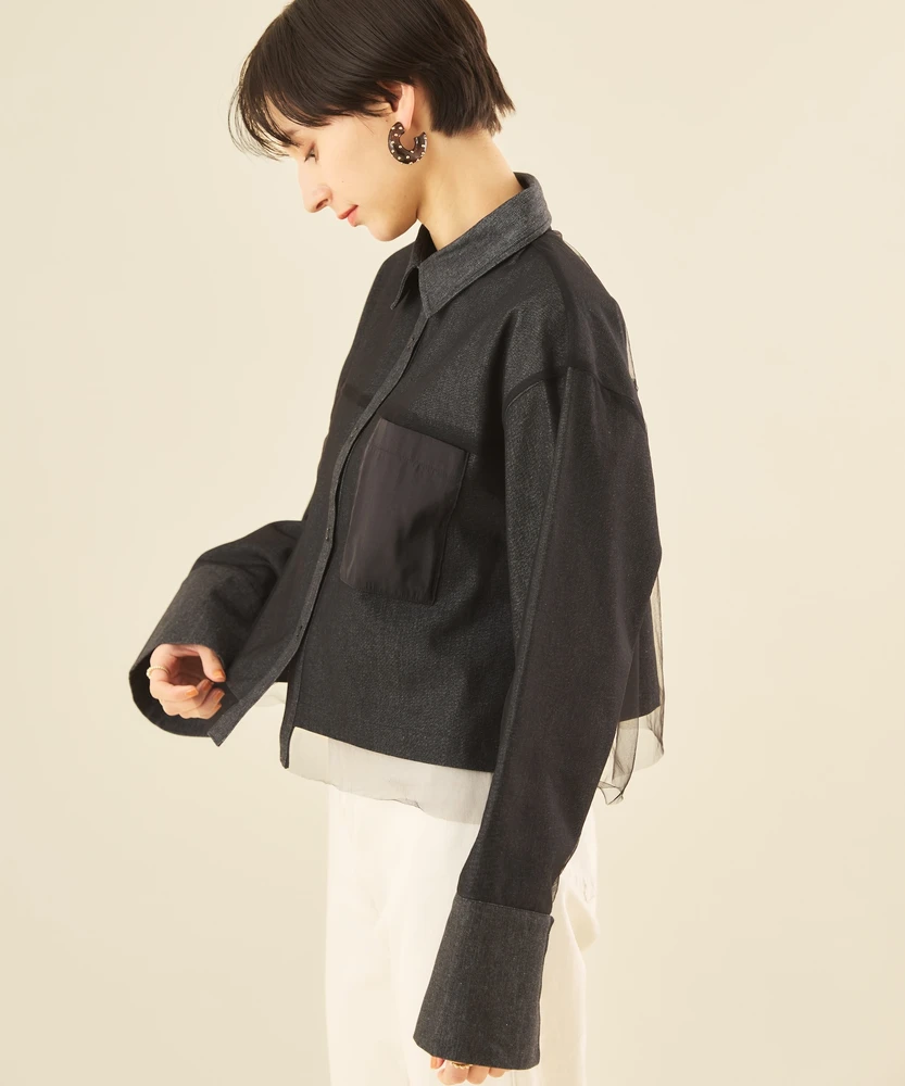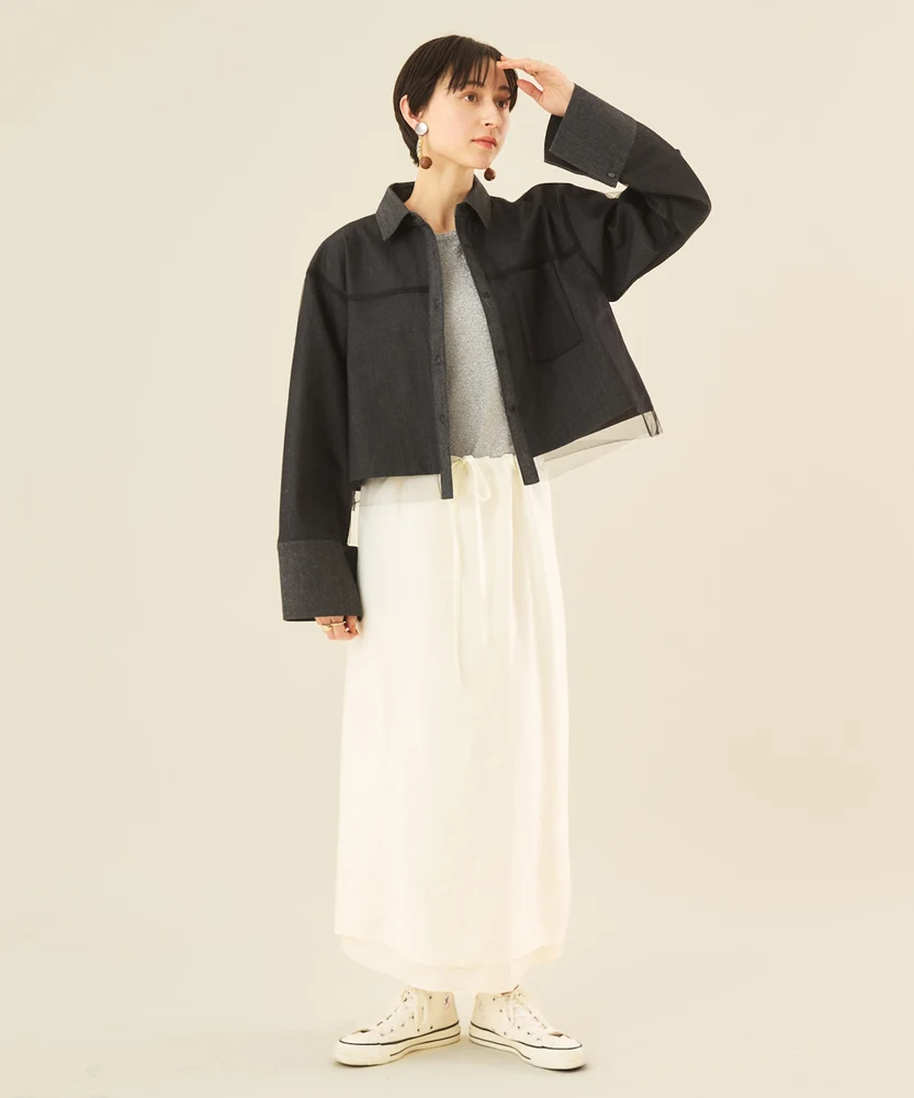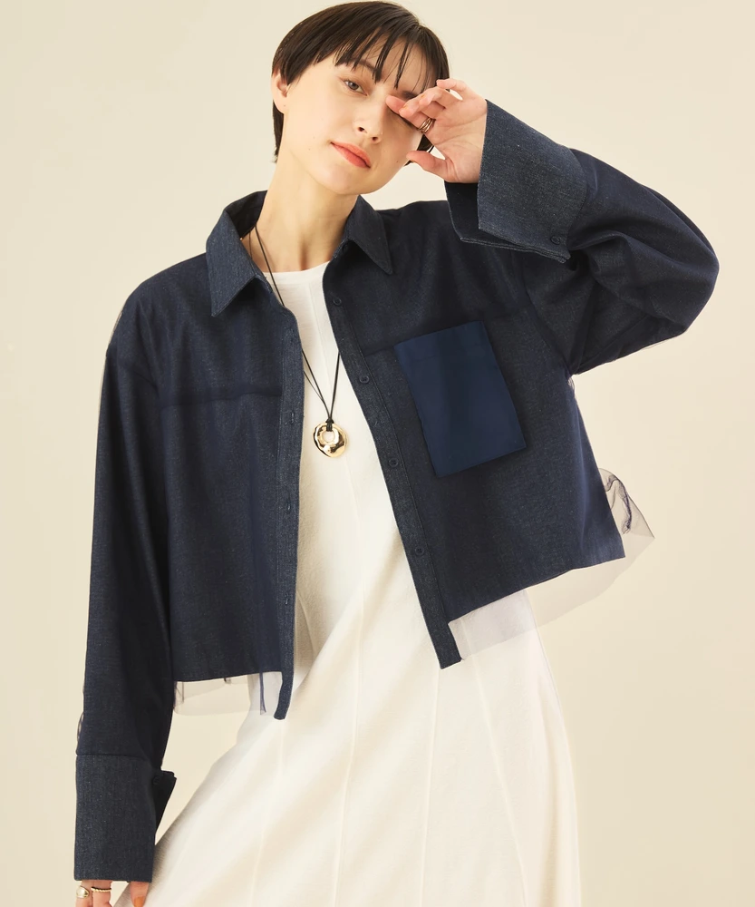 張り感のあるデニムシャツにチュールをレイヤードさせた、トレンド感のある素材見えが今っぽさ満点!