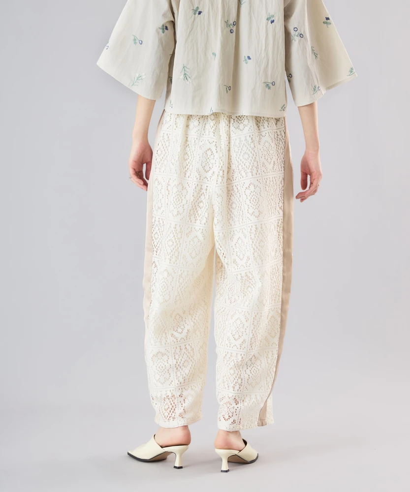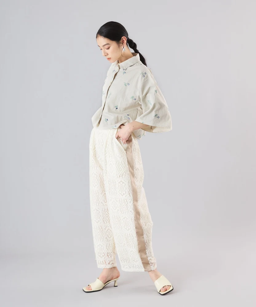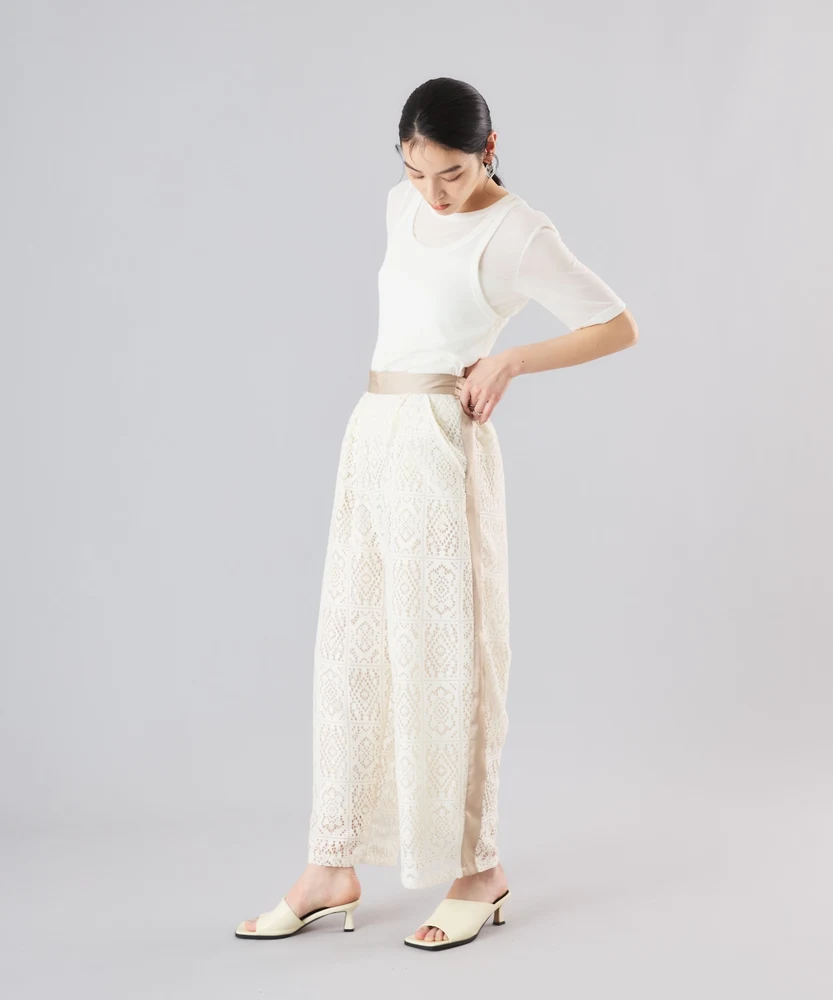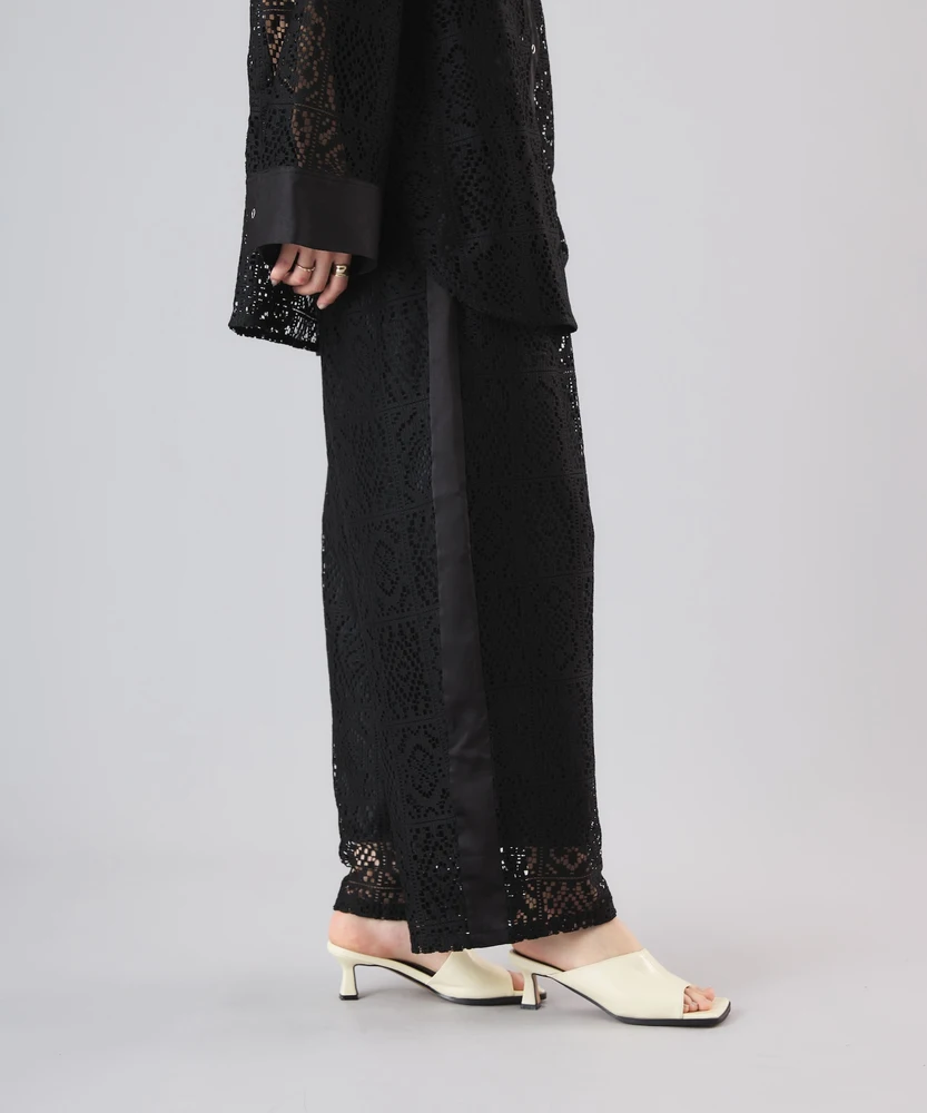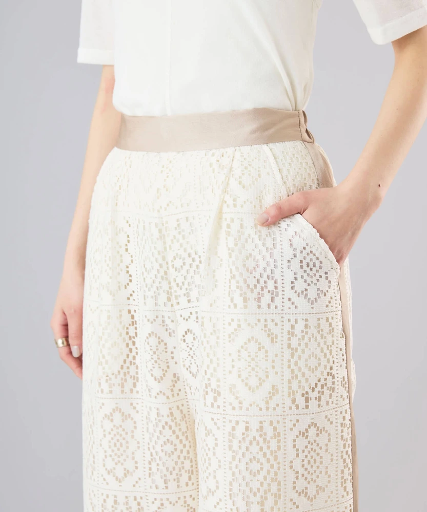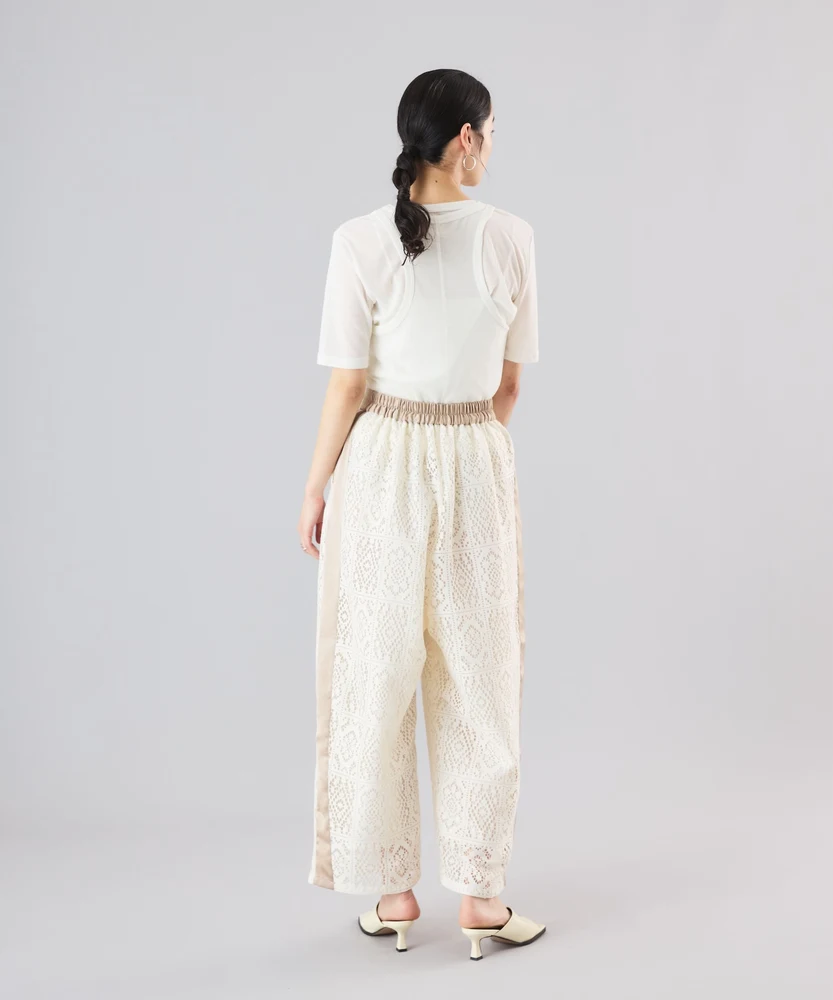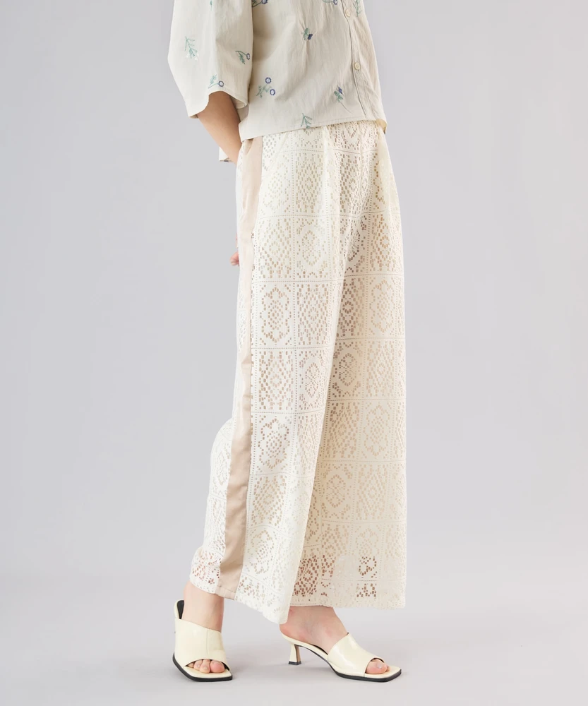 クラシカルなレース柄に、サテン素材のアクセントを効かせたレディライクパンツ