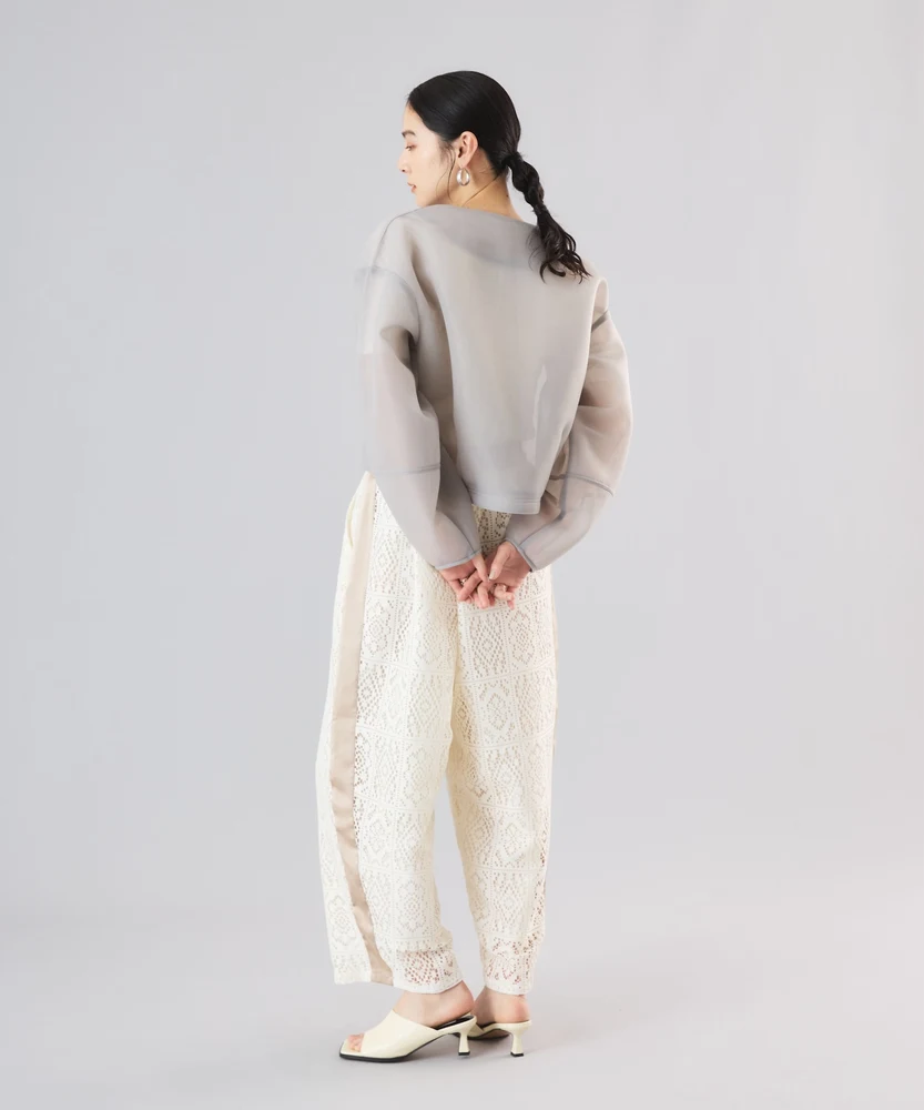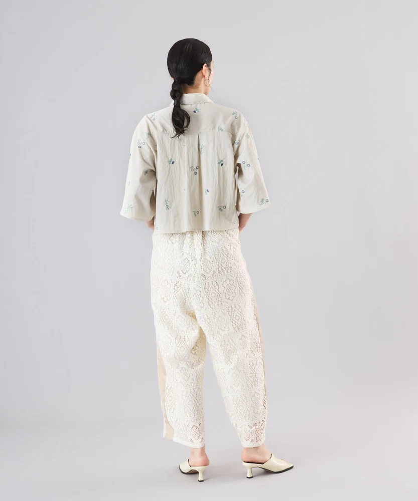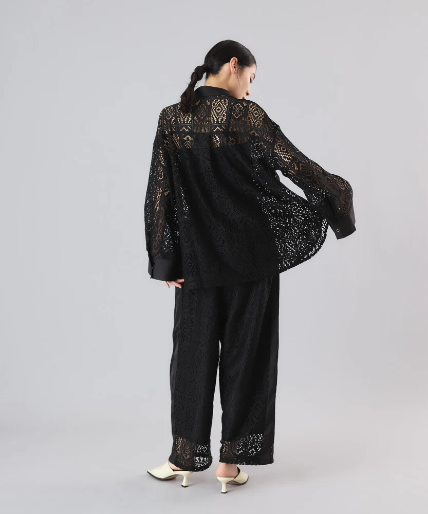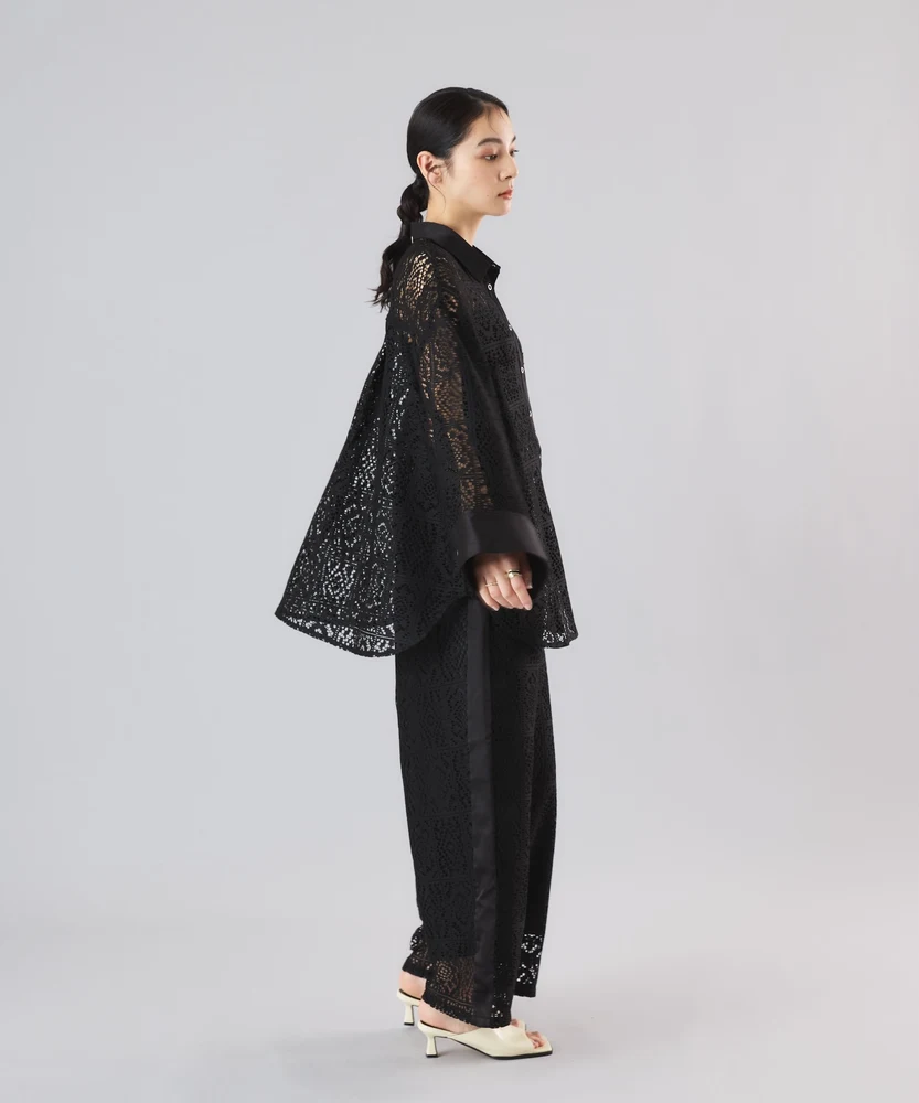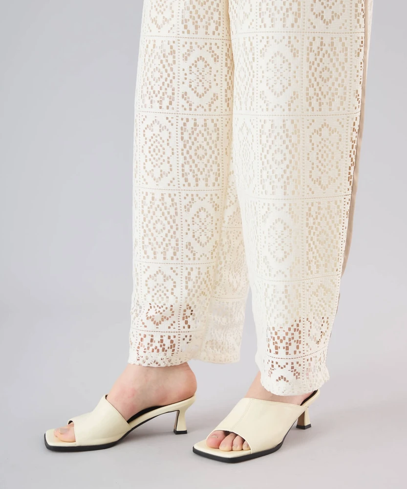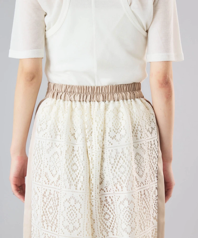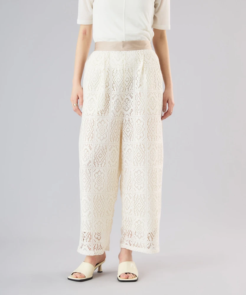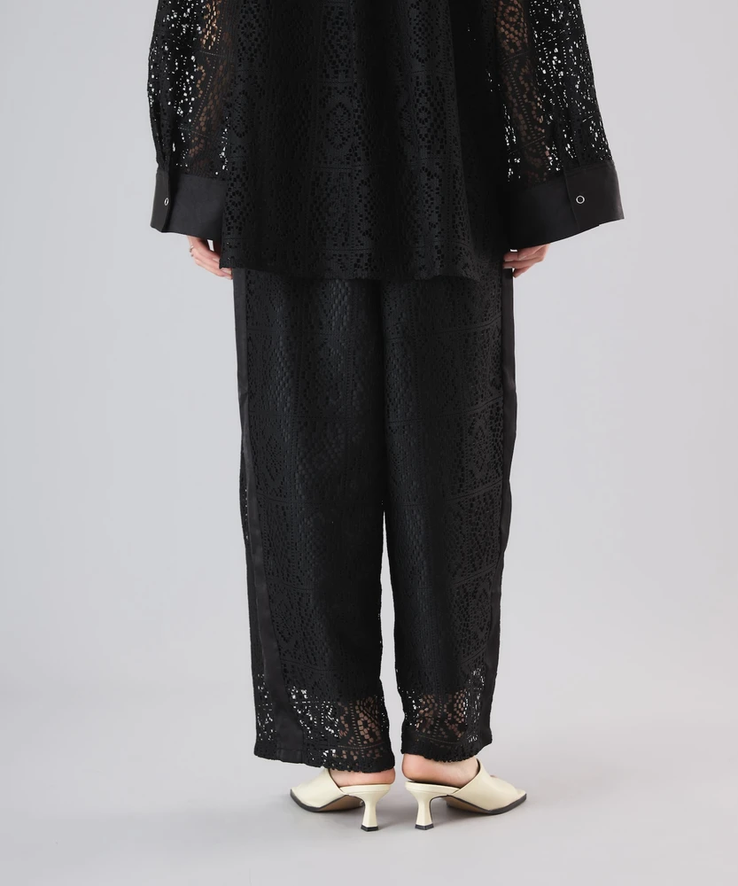 クラシカルなレース柄に、サテン素材のアクセントを効かせたレディライクパンツ