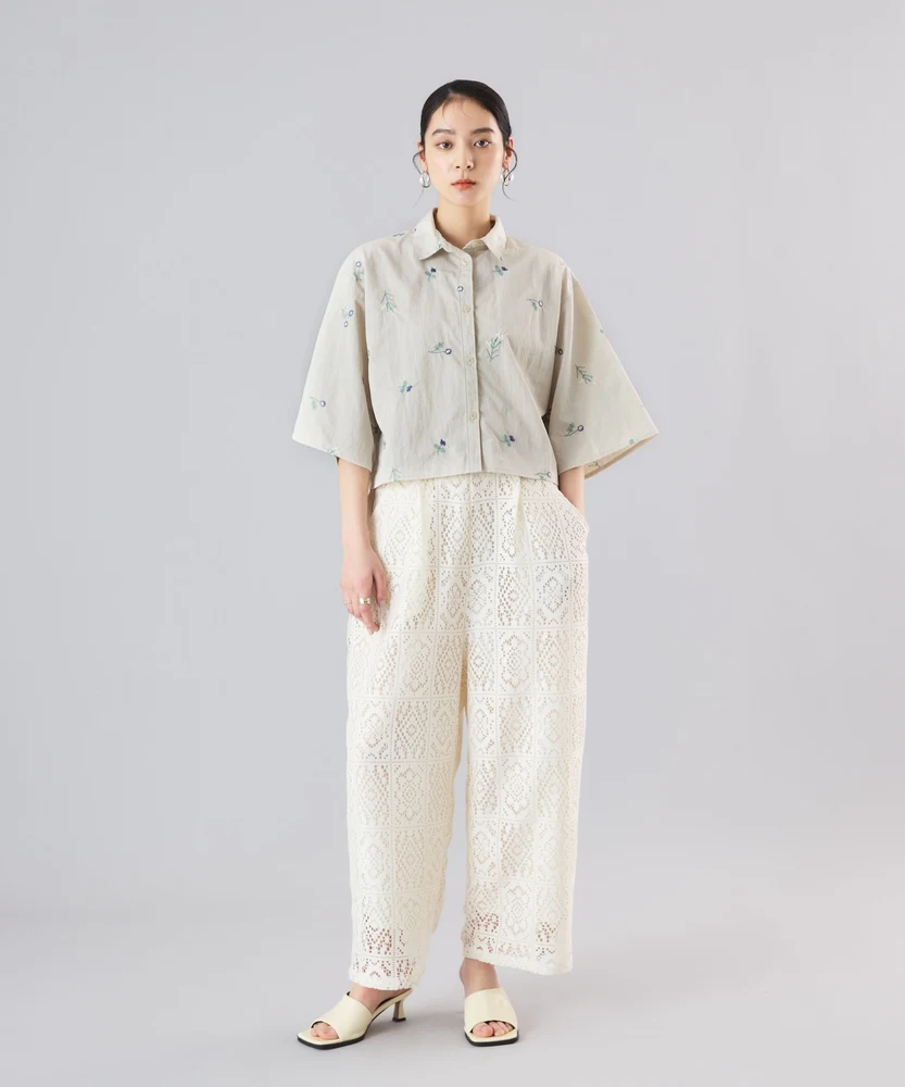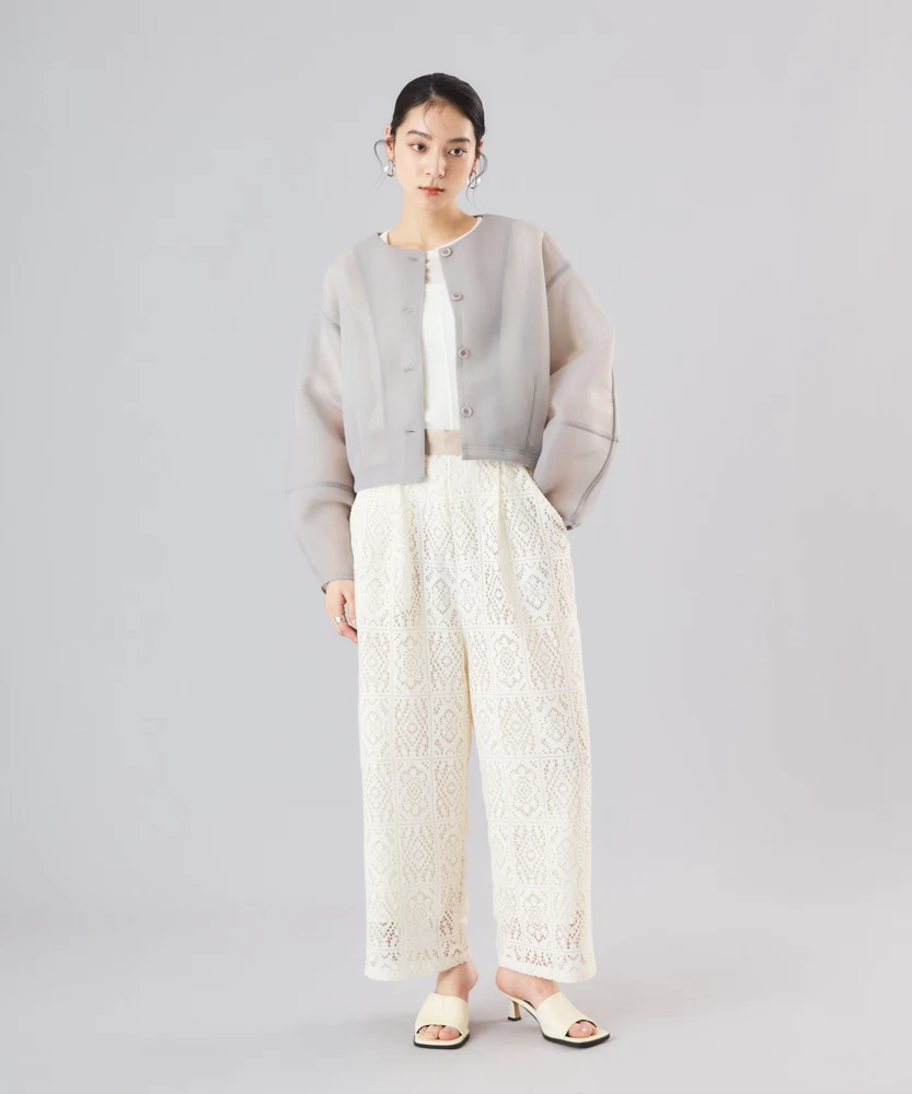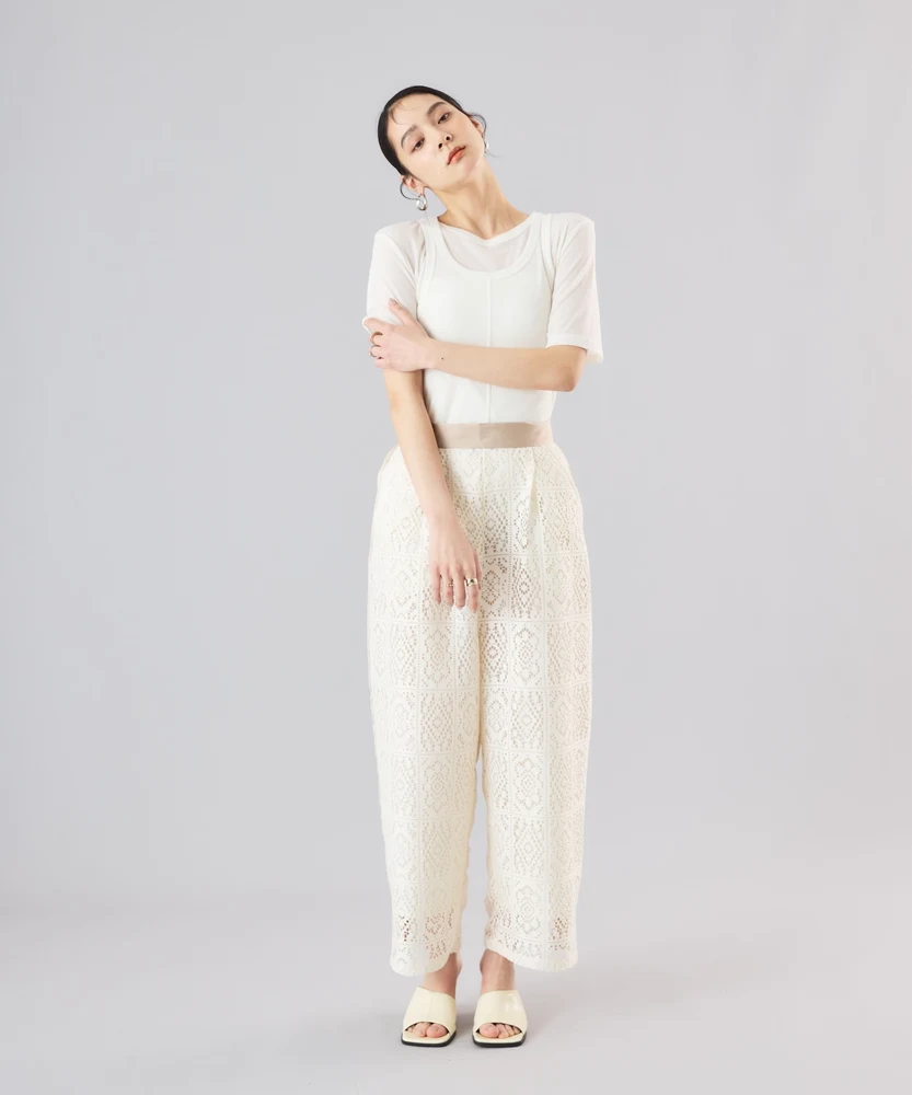 レースの美しさを引き立てながら大人の余裕を感じさせるスタイルに。軽やかで春夏にぴったりの着こなし。