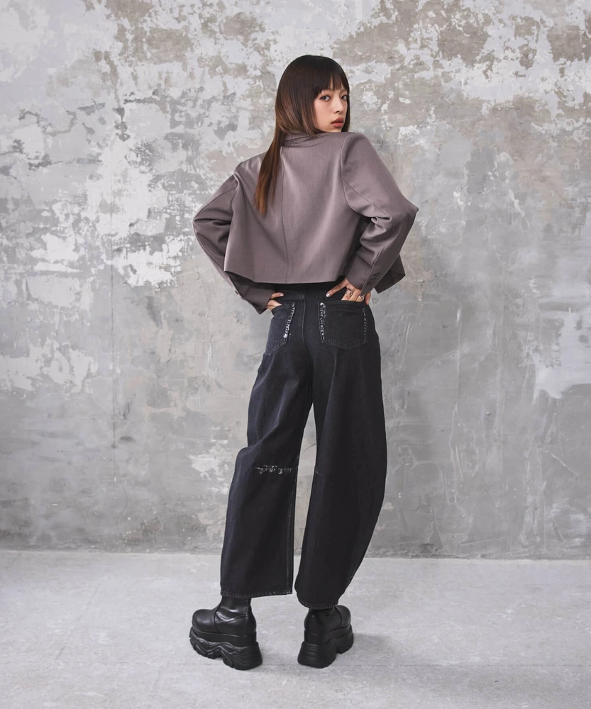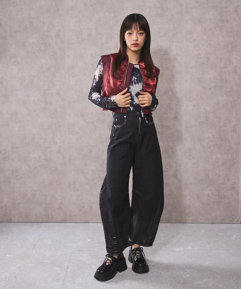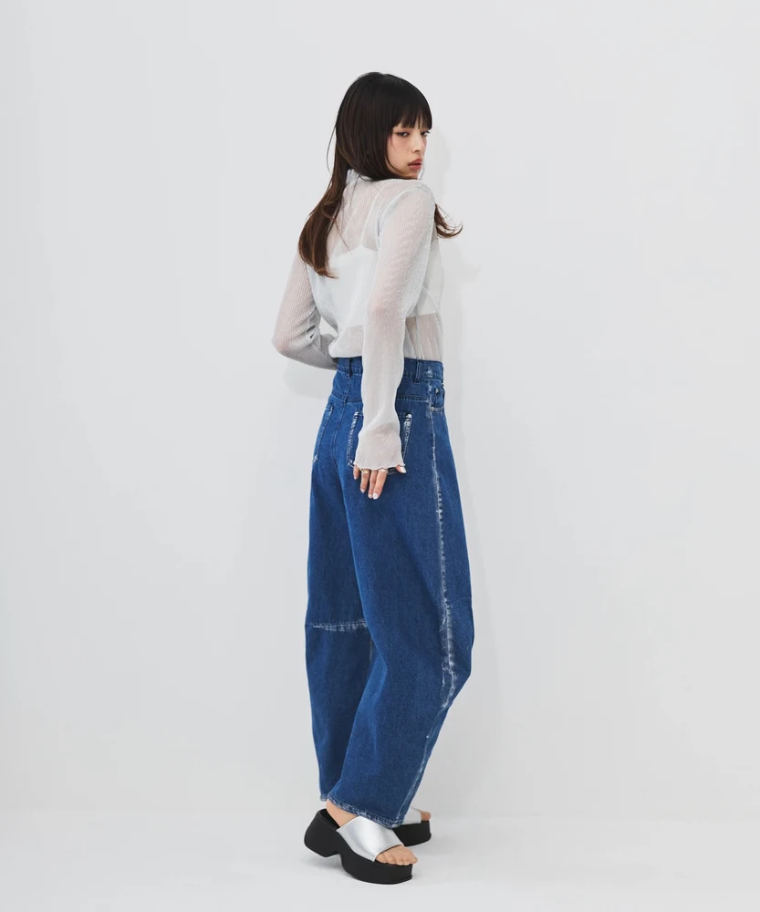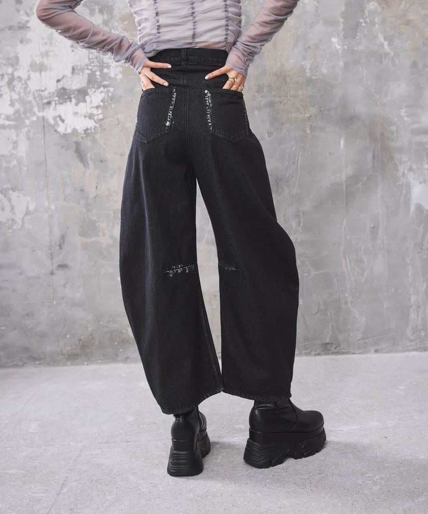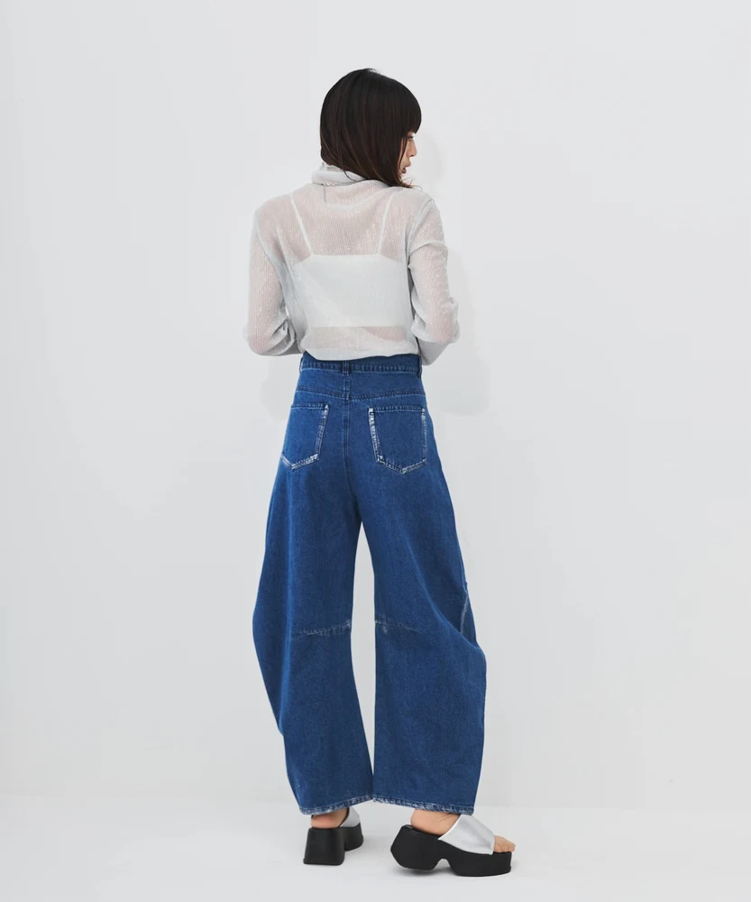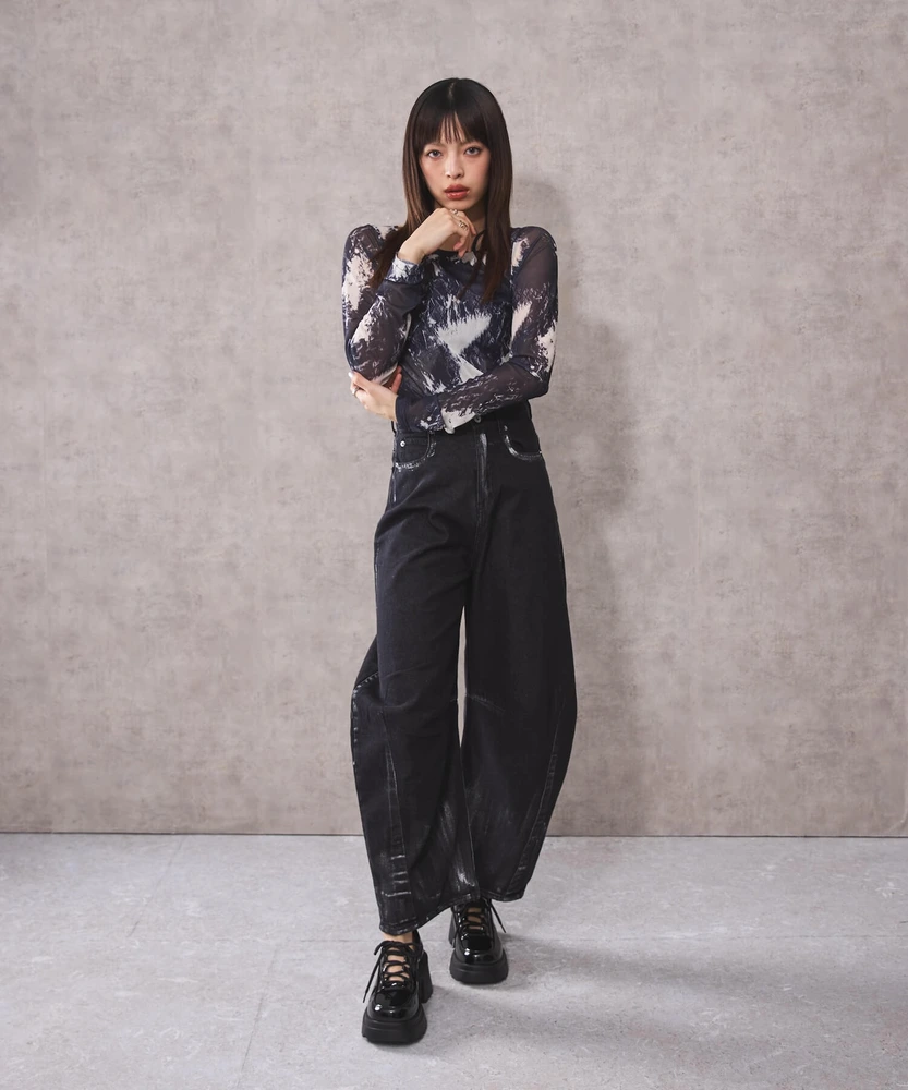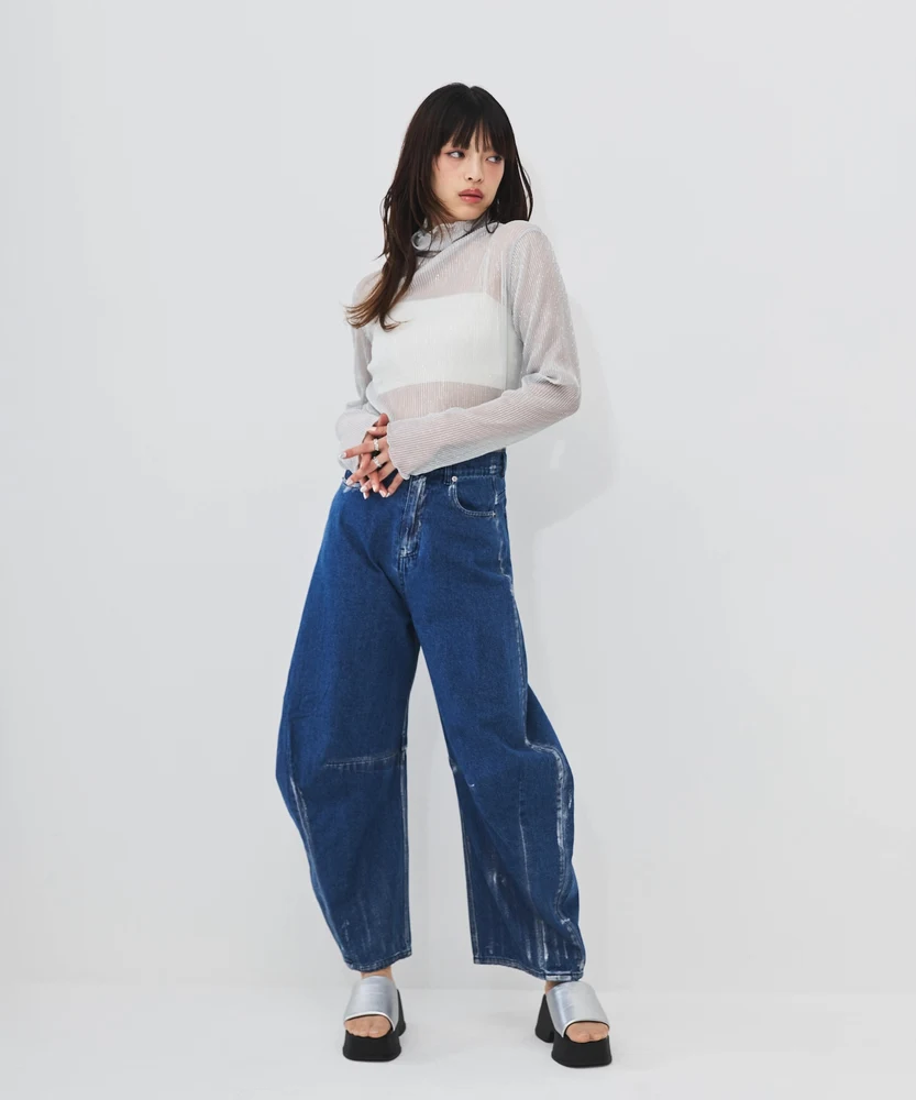 立体的なシルエットが特徴のカーブデニムラメプリントカーブデニムは、ゆるやかなカーブラインがリラックス感とモードな雰囲気を両立させたデニムパンツです。
