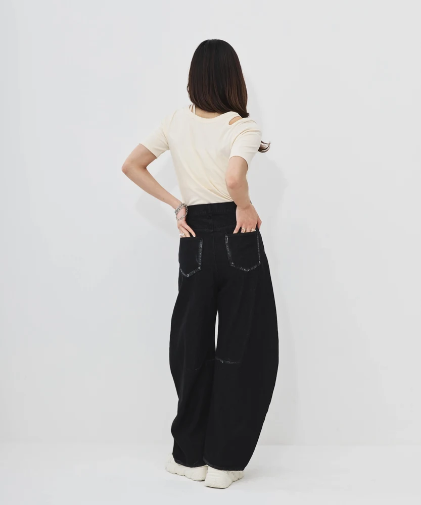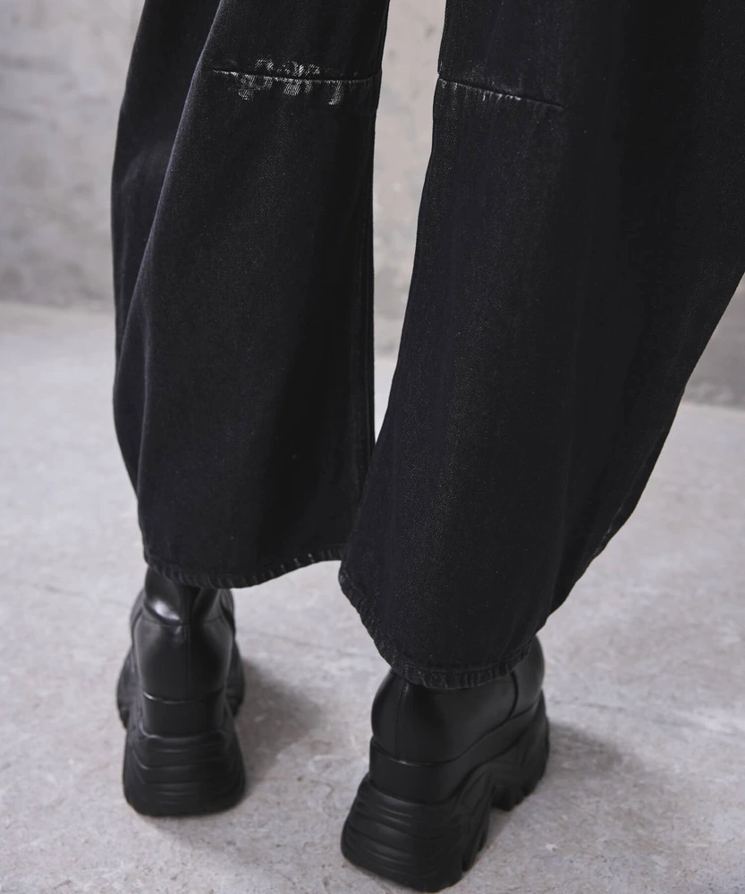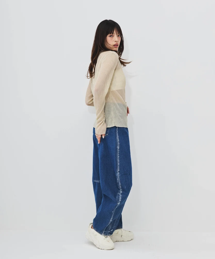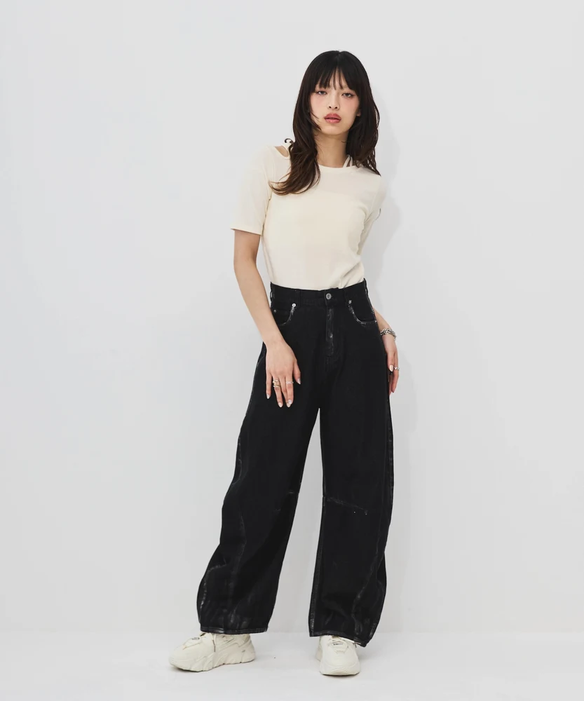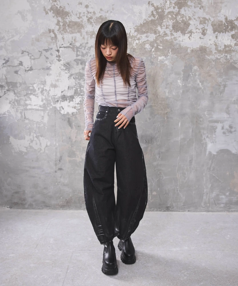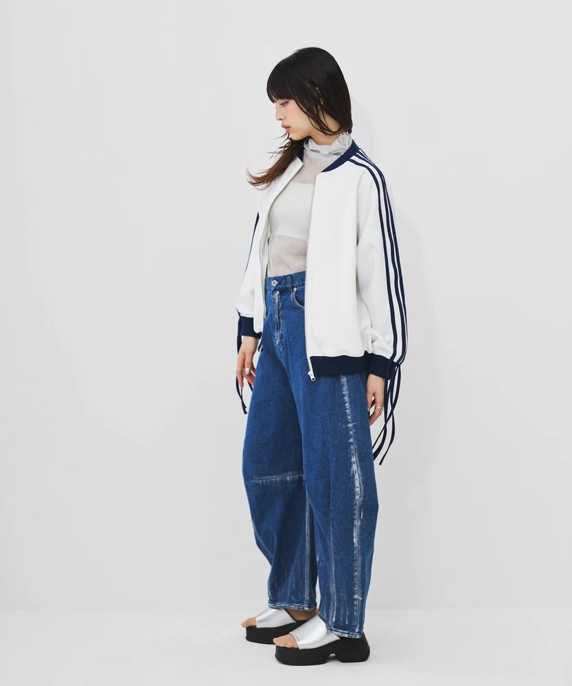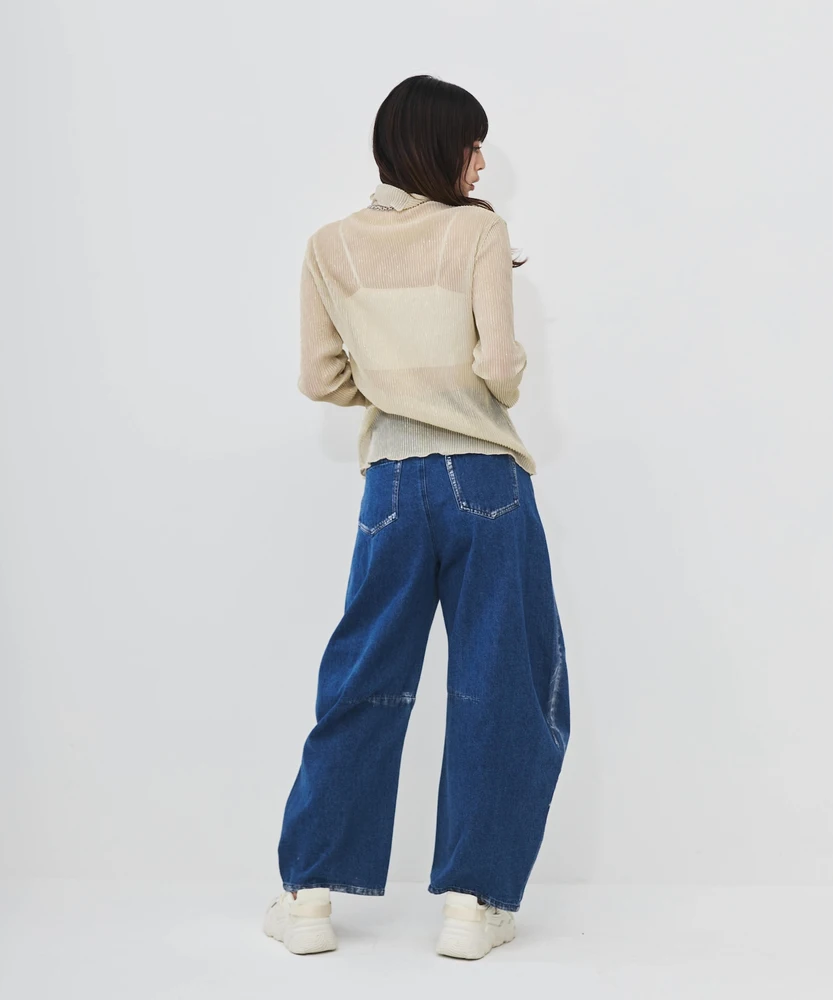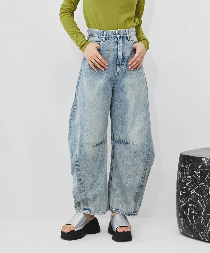 立体的なシルエットが特徴のカーブデニムラメプリントカーブデニムは、ゆるやかなカーブラインがリラックス感とモードな雰囲気を両立させたデニムパンツです。