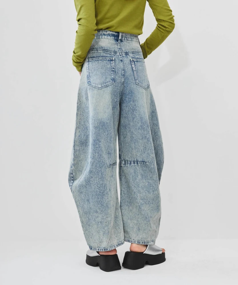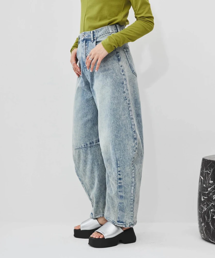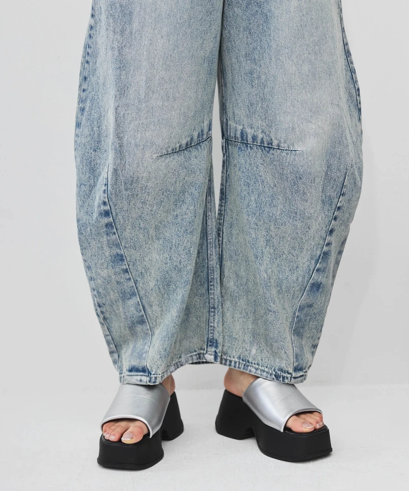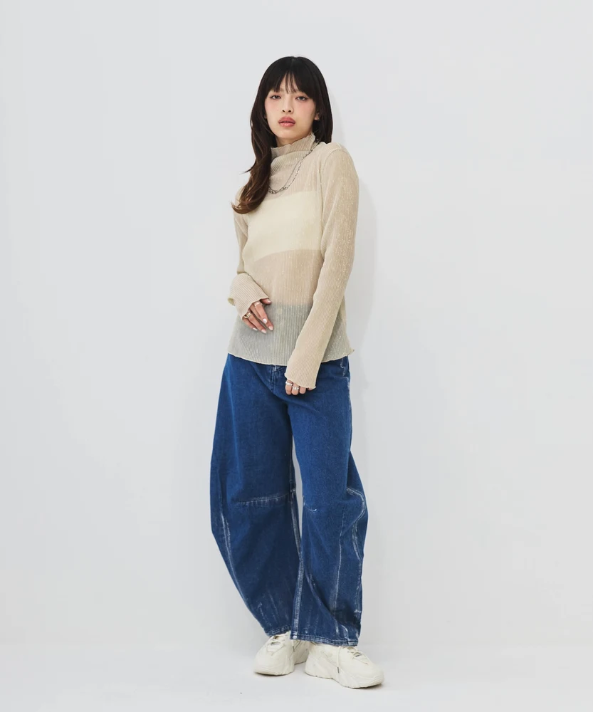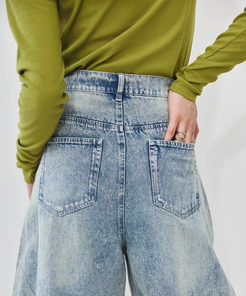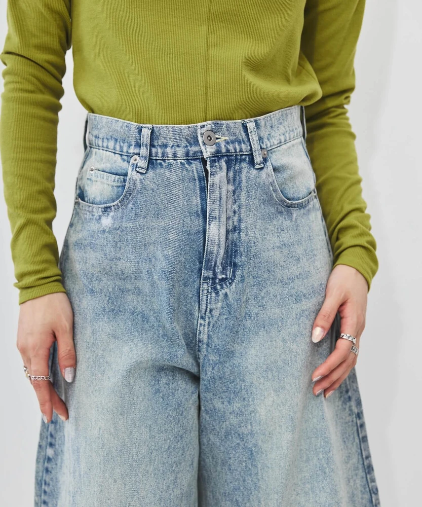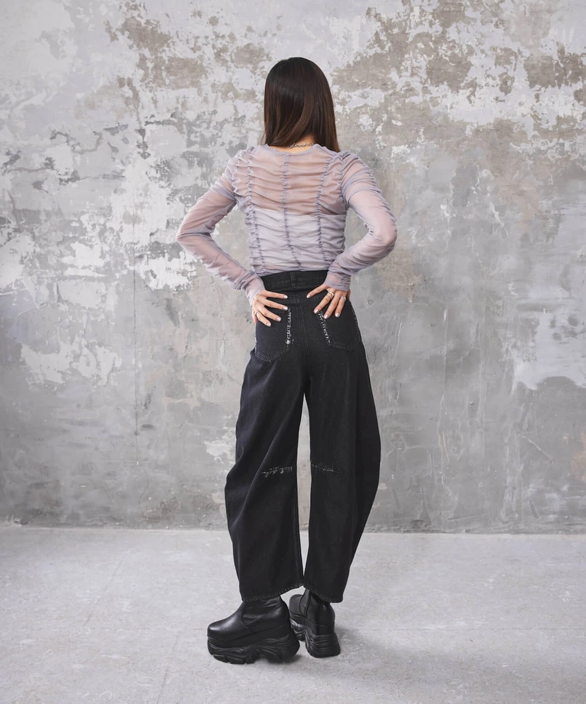 立体的なシルエットが特徴のカーブデニムラメプリントカーブデニムは、ゆるやかなカーブラインがリラックス感とモードな雰囲気を両立させたデニムパンツです。