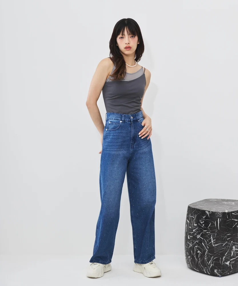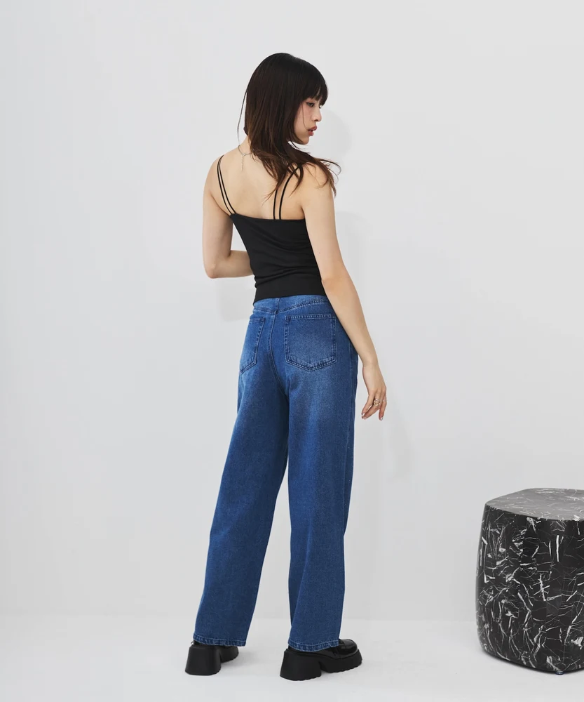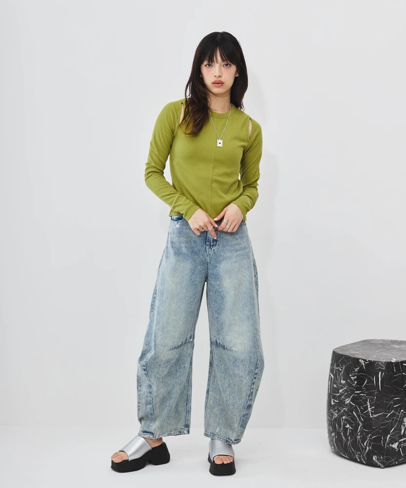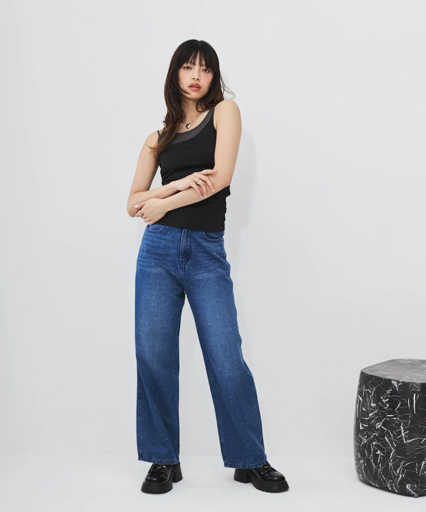 シンプルな白いクロップトップやタンクトップと合わせ、デニムのリラックス感を活かしたカジュアルスタイルに。