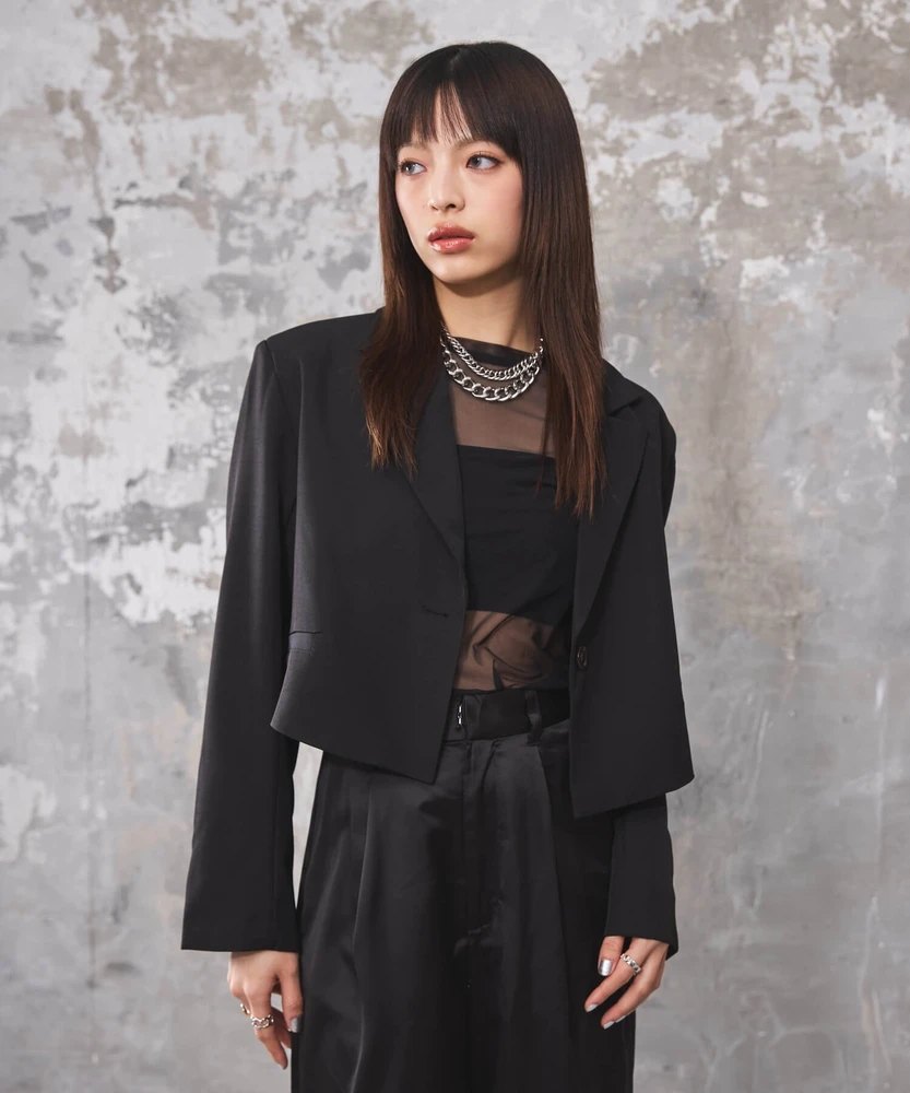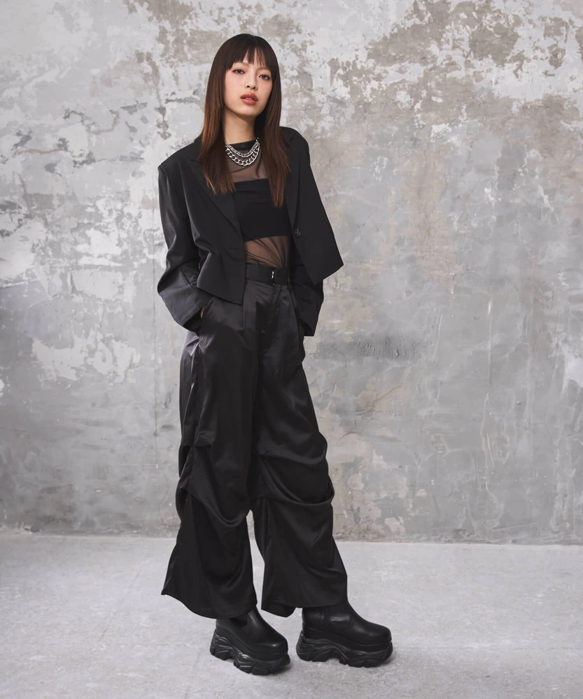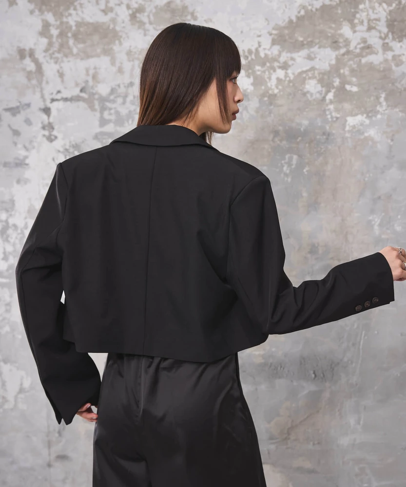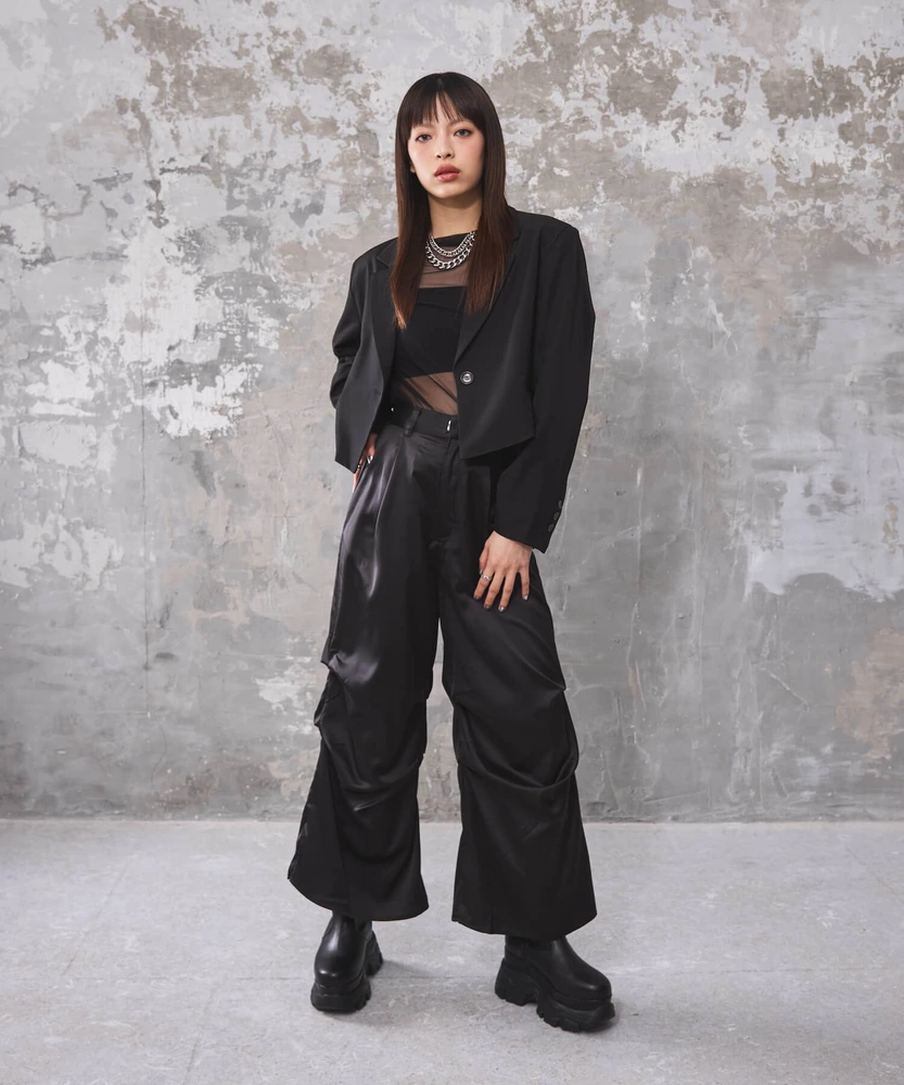 なお、このショート丈ジャケットのグレーは同素材のタック入りワイドパンツとセットアップとしても着用可能です。