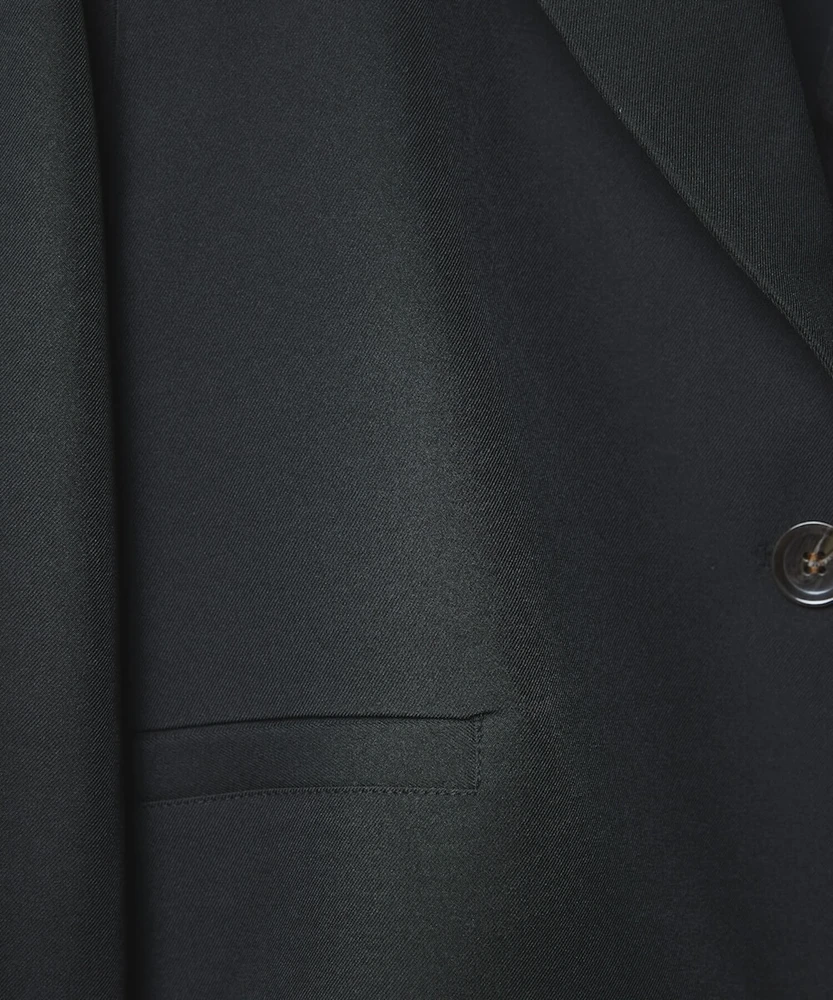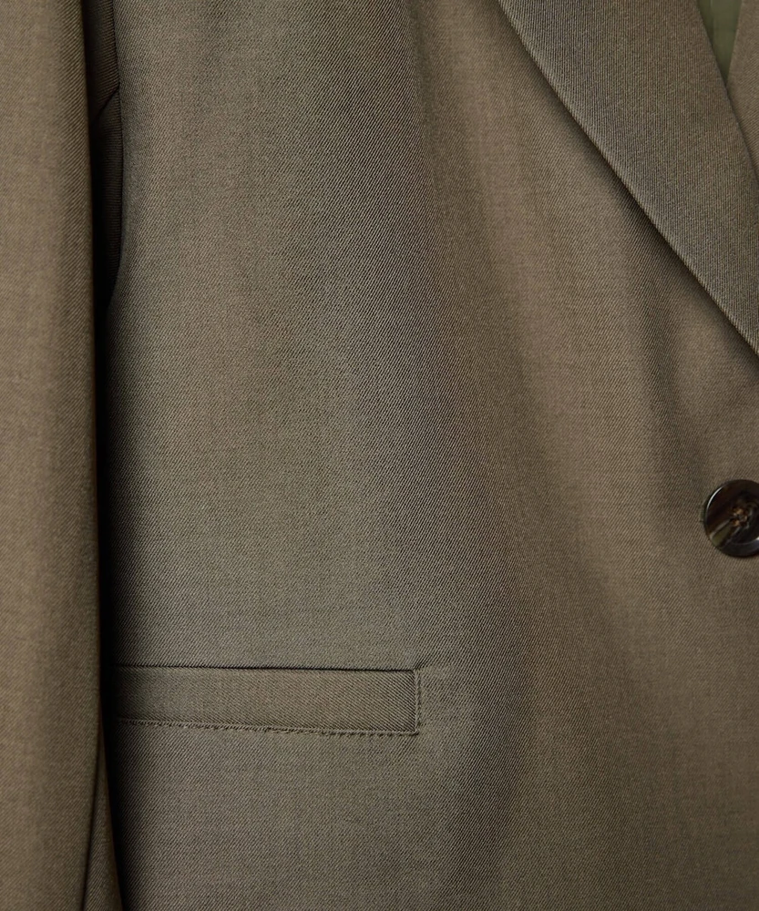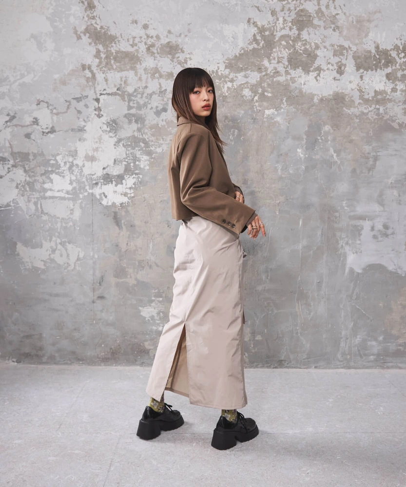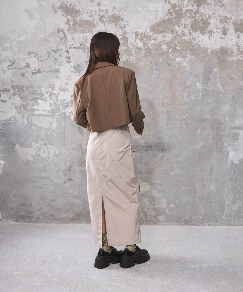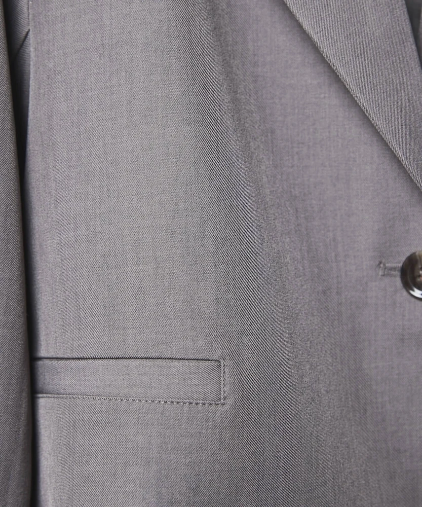 なお、このショート丈ジャケットのグレーは同素材のタック入りワイドパンツとセットアップとしても着用可能です。