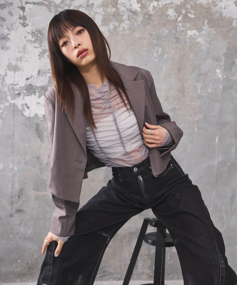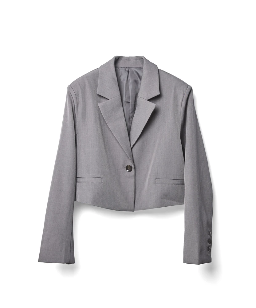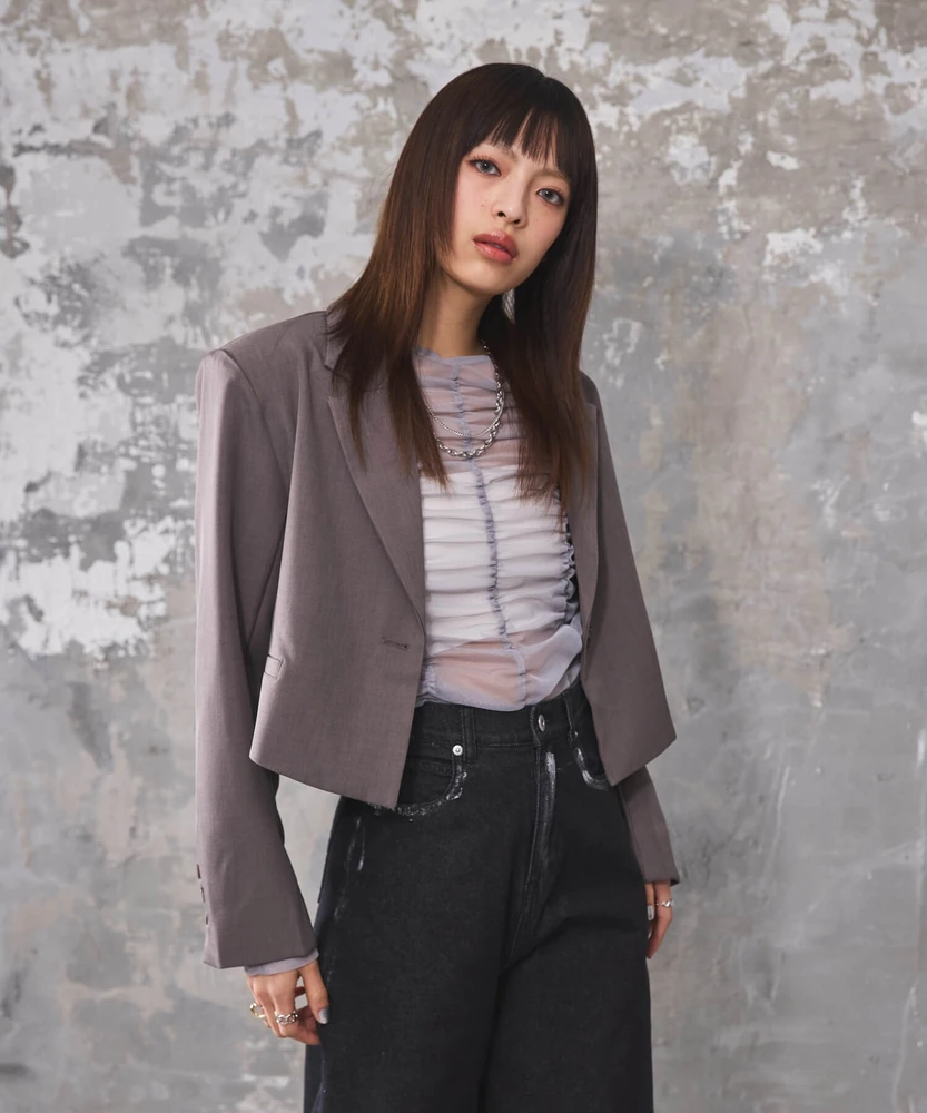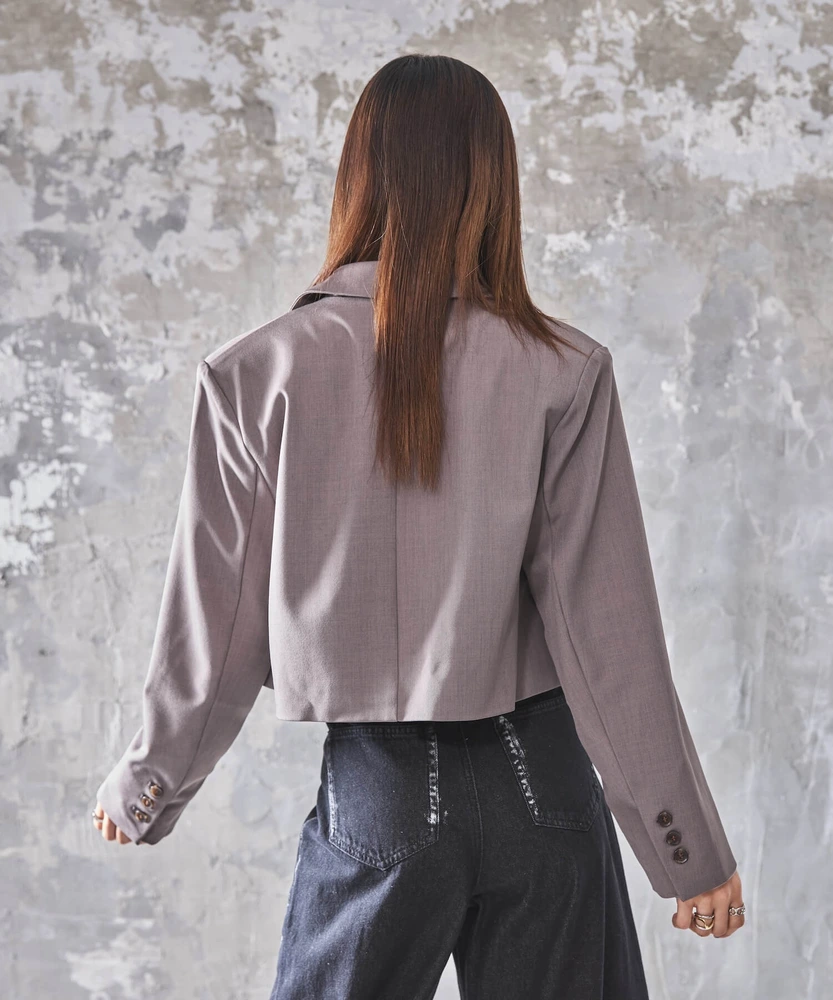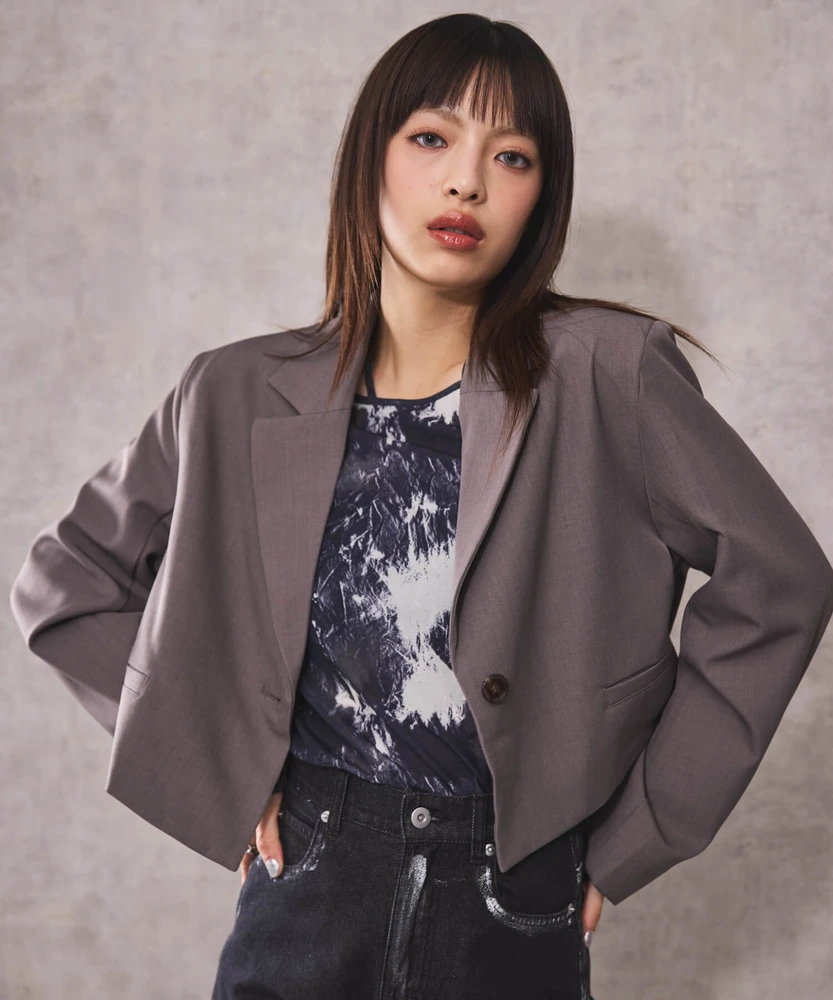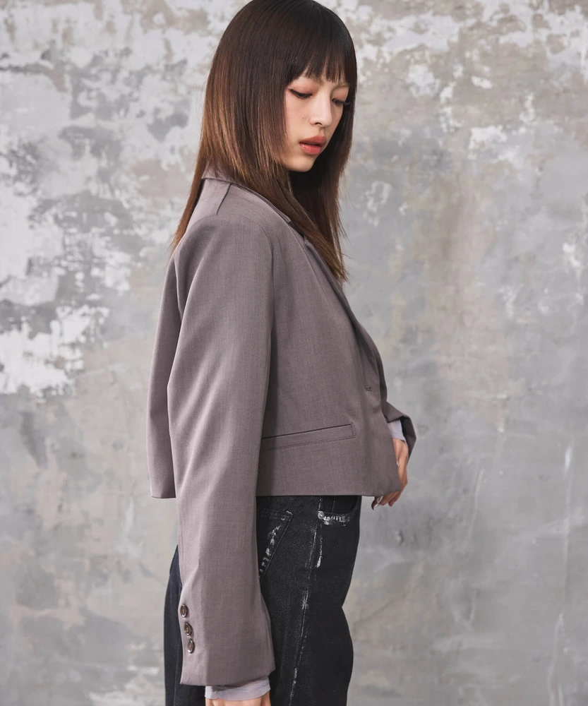 グレーのショート丈ジャケットを用いたこれらのモード系スタイリングをお楽しみください。