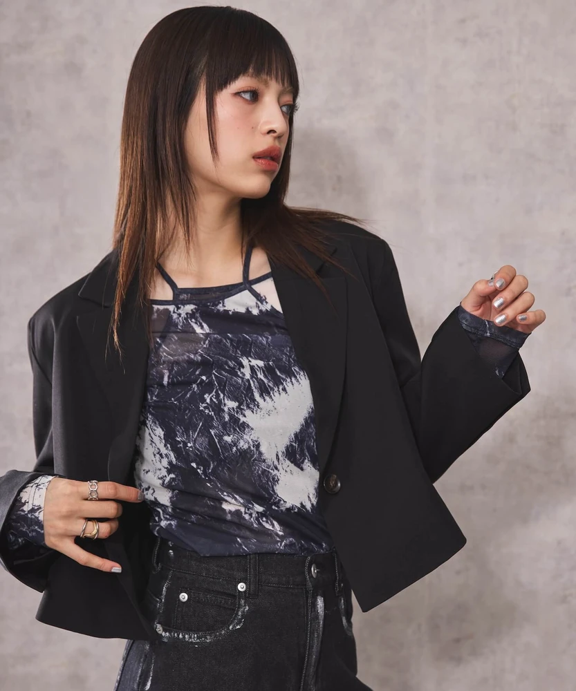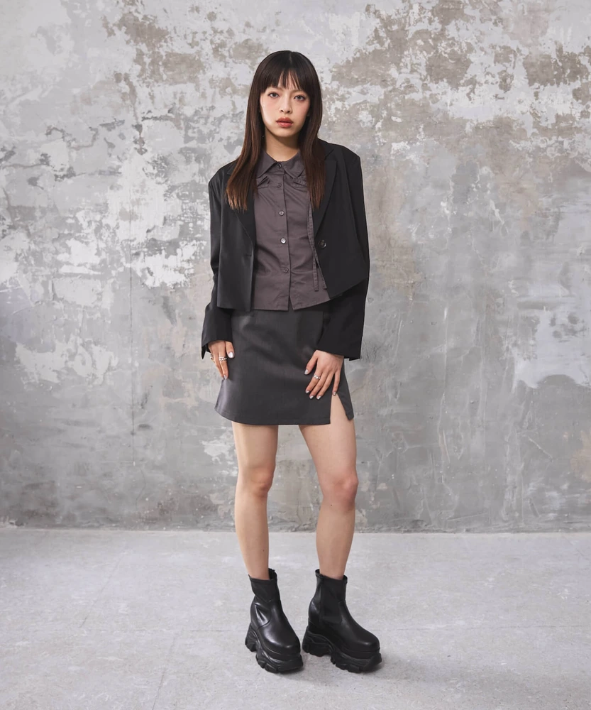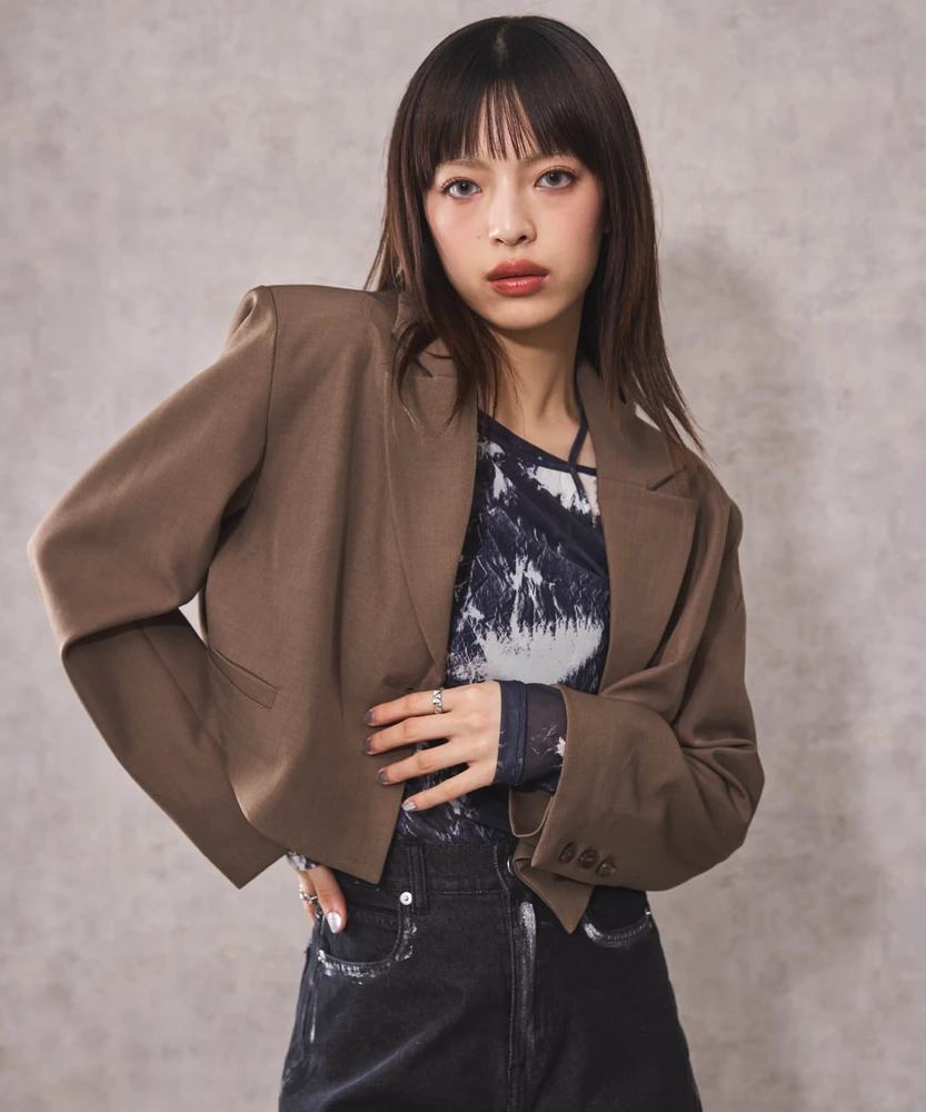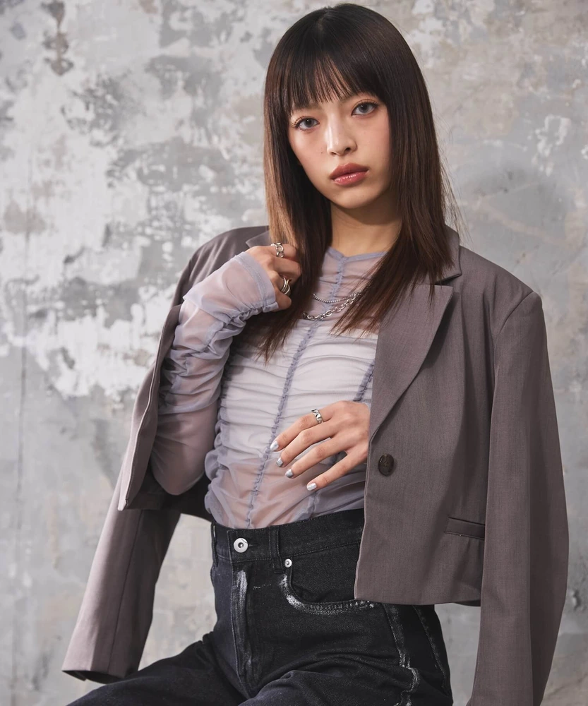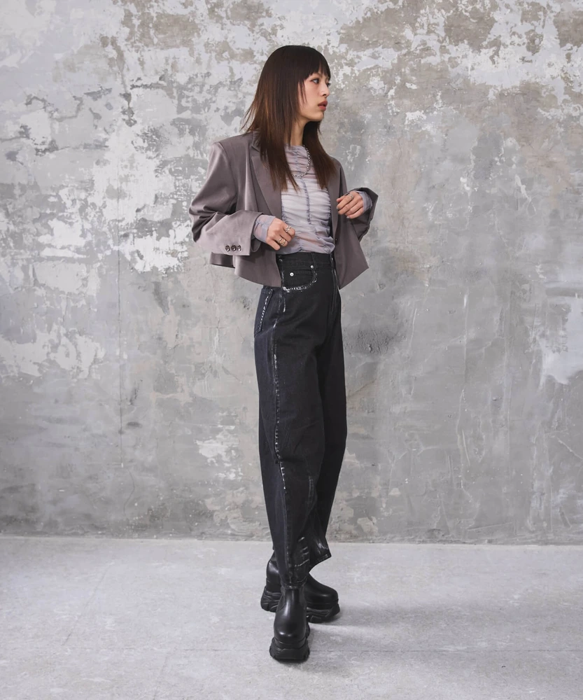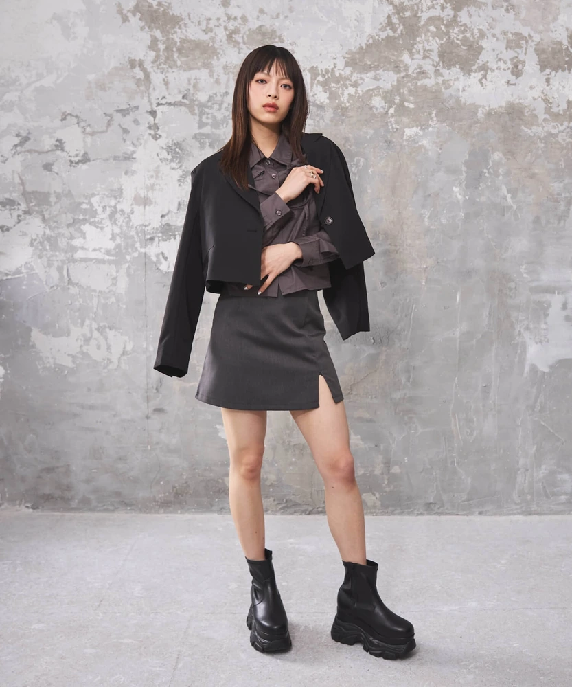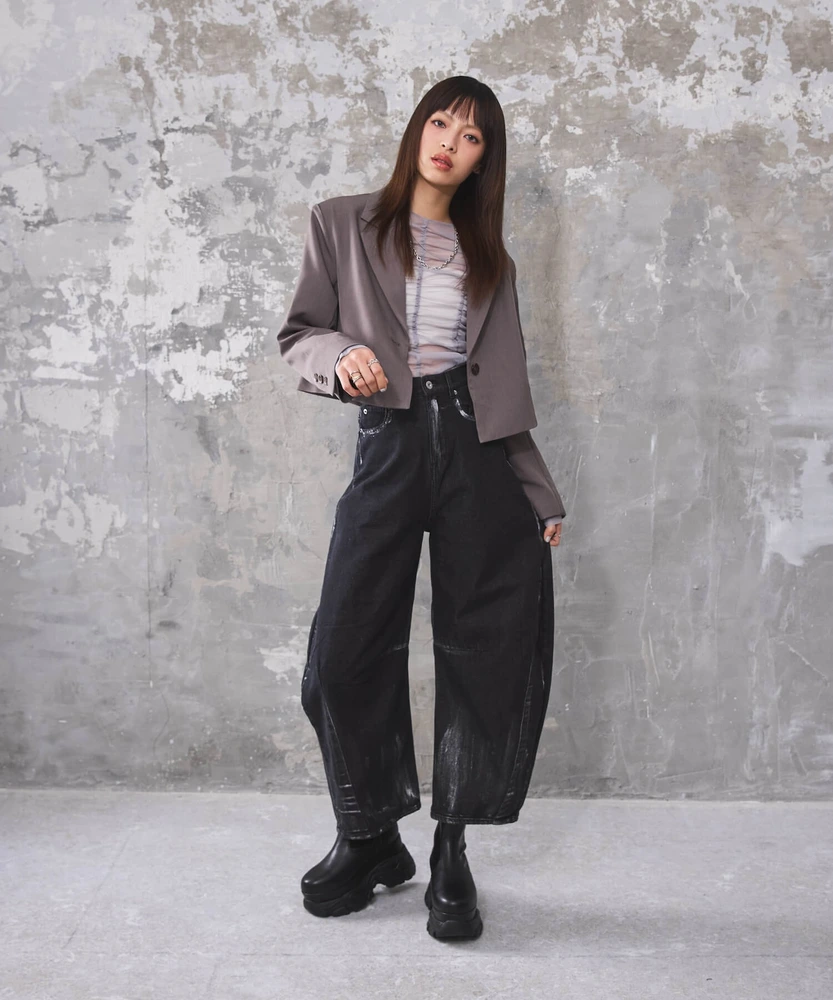 グレーのショート丈ジャケットを用いたこれらのモード系スタイリングをお楽しみください。