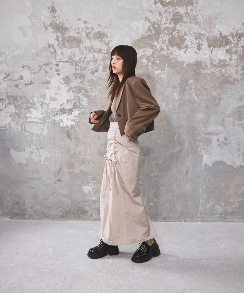 ショート丈ジャケットにフリルブラウスを合わせ、ボトムスにはプリーツスカートやシルクスカートを選びます。