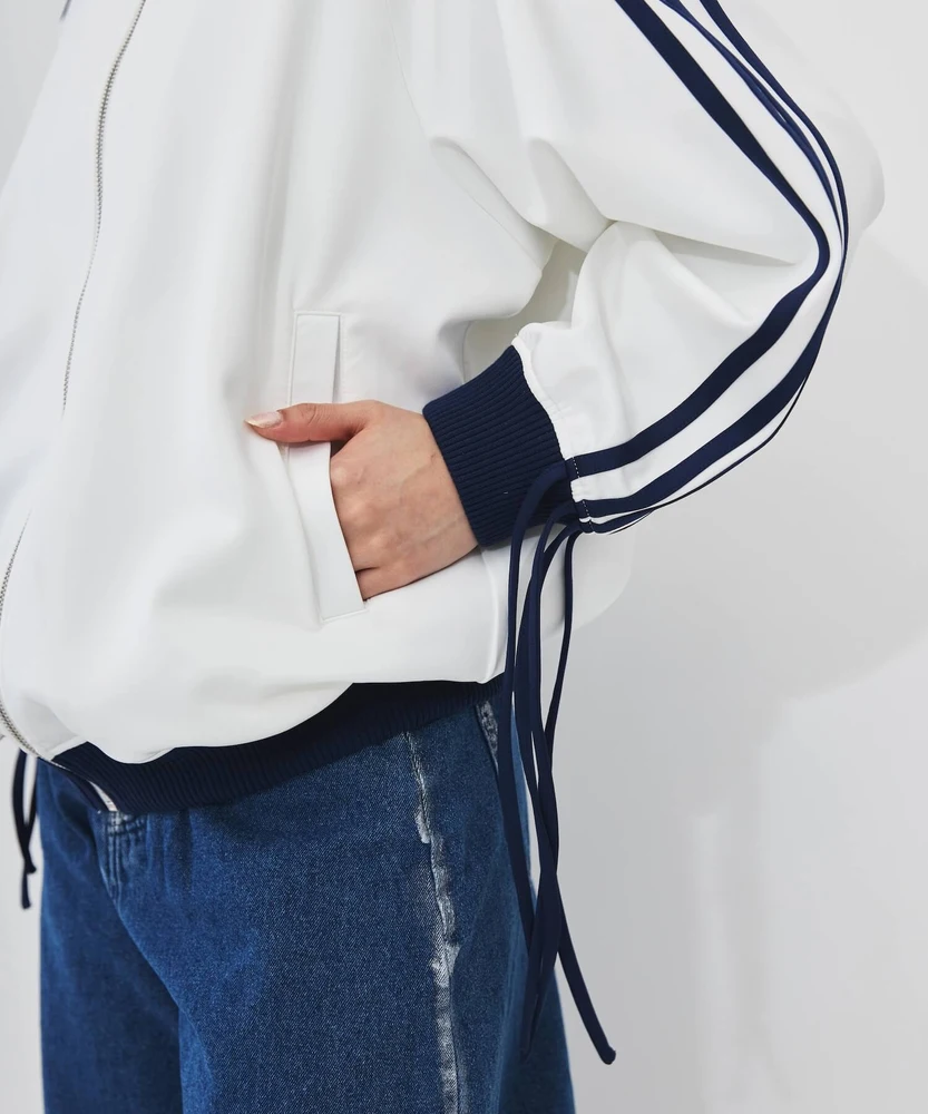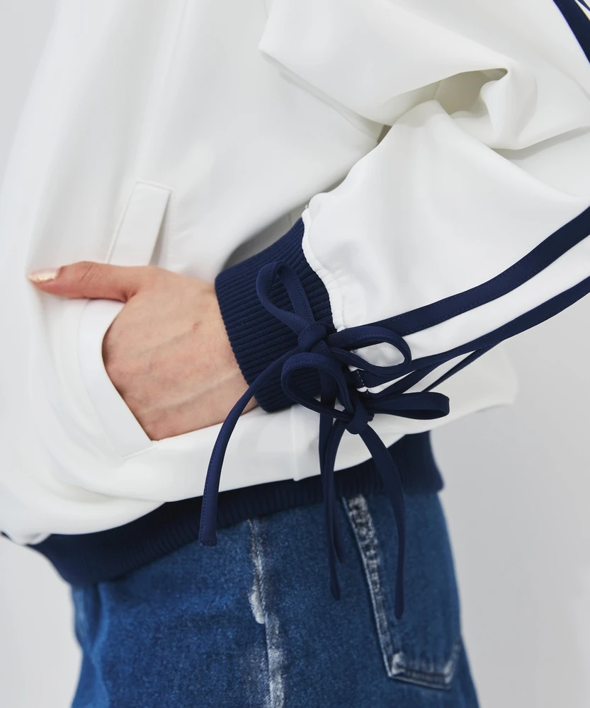 袖リボン: 袖口のリボンが、カジュアルでスポーティなジャケットに女性らしさをプラスします。