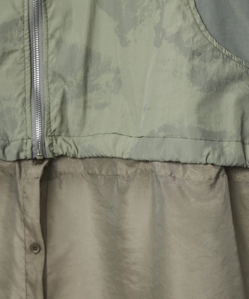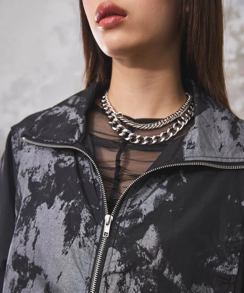 このレイヤードブルゾンは、シアーシャツを重ね着しているようなデザインが特徴で、