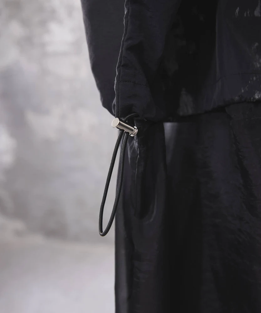 オーガンジーを外してシンプルなブルゾンとして着用し、無地のタートルネックとスリムパンツを組み合わせて都会的なスタイルに。