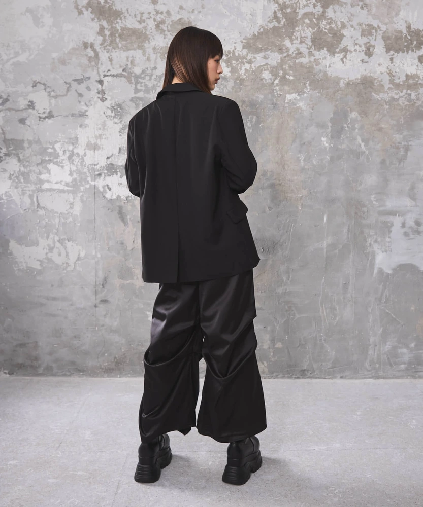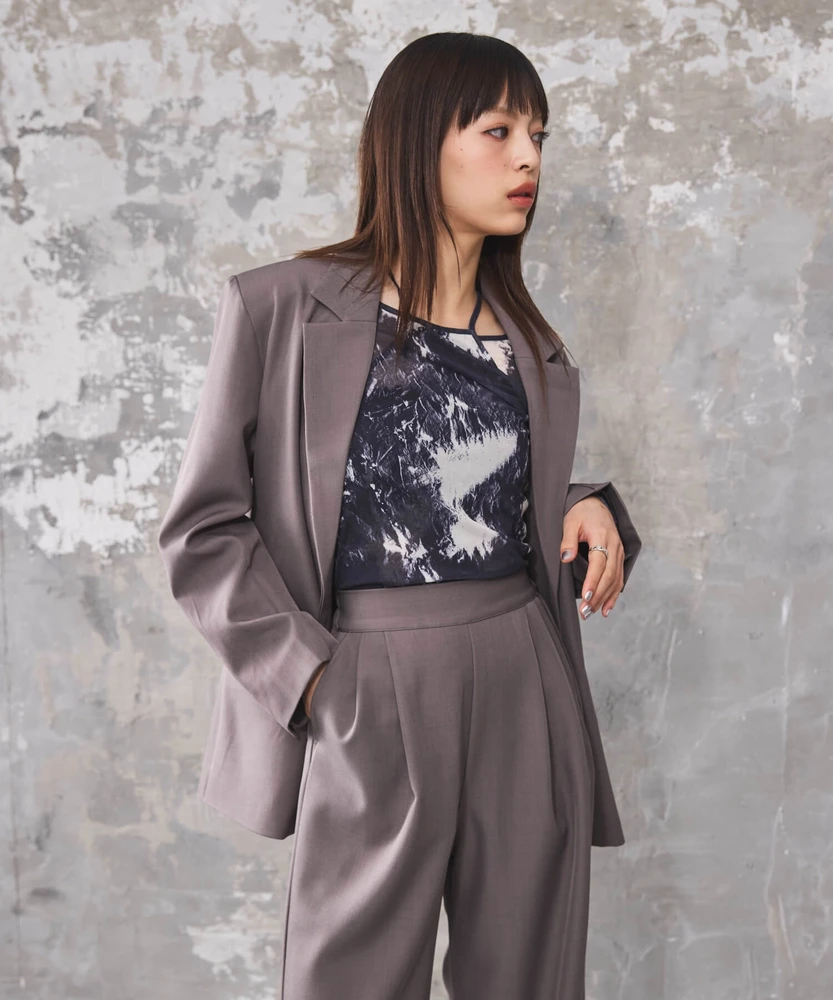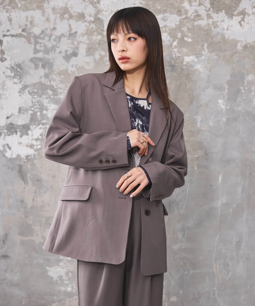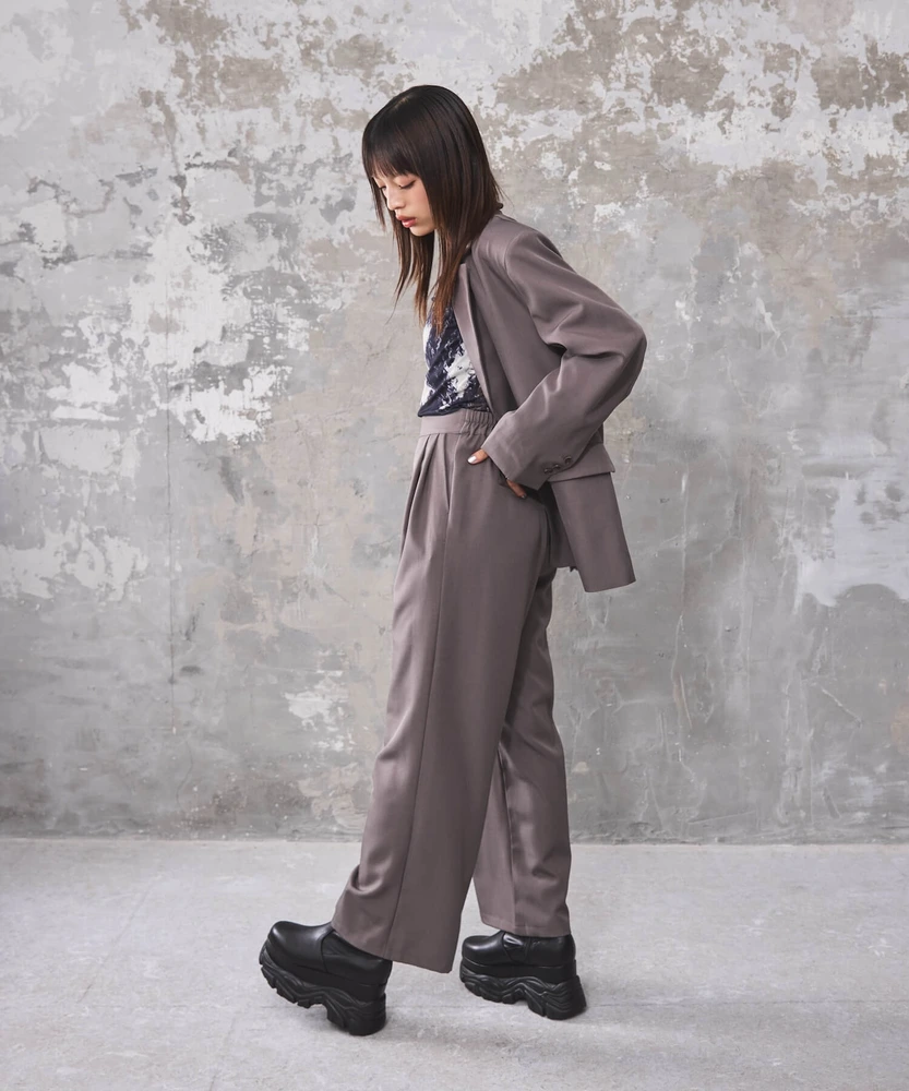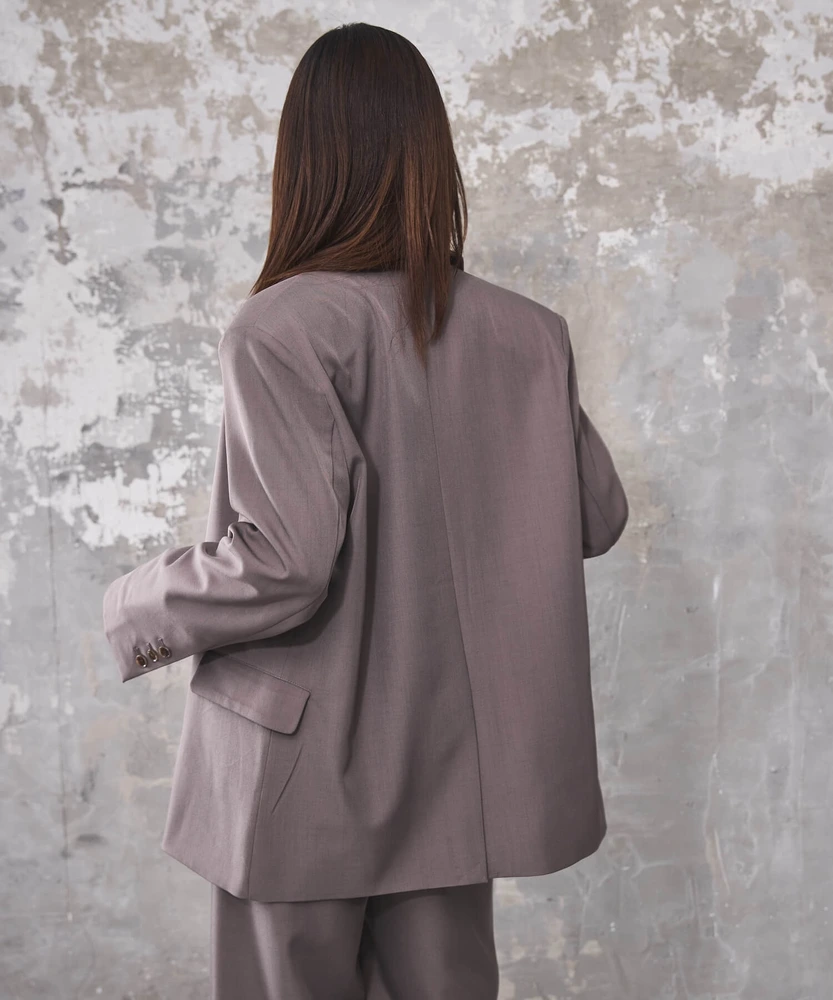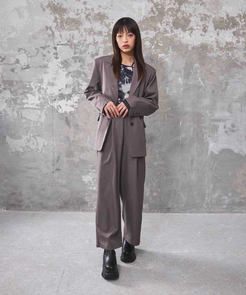 このオーバーサイズジャケットは、グレーのみ同素材のタック入りワイドパンツとセットアップスタイルとしても着用可能です。