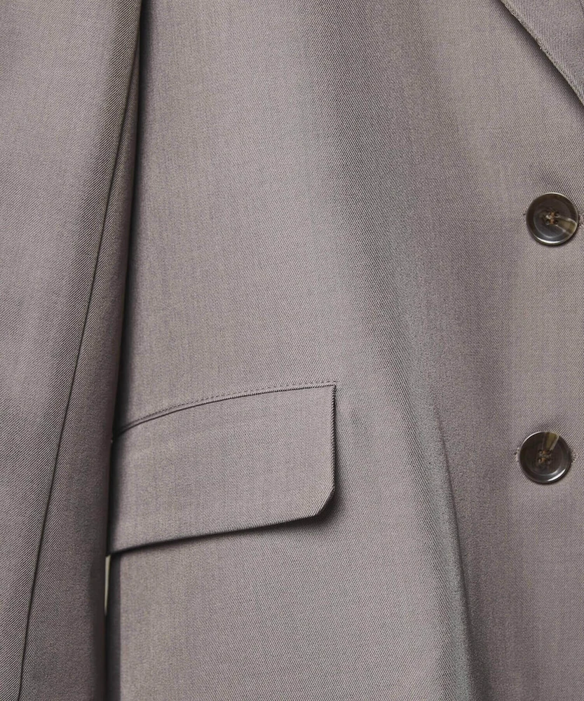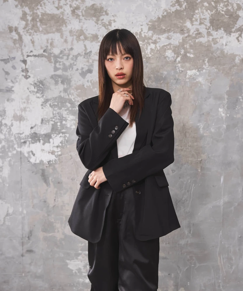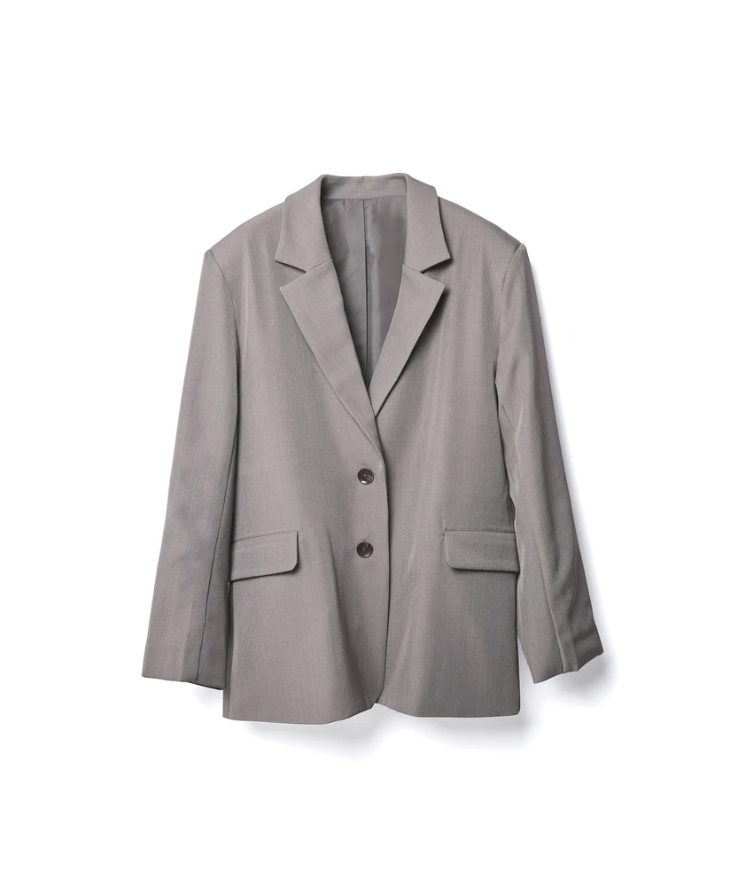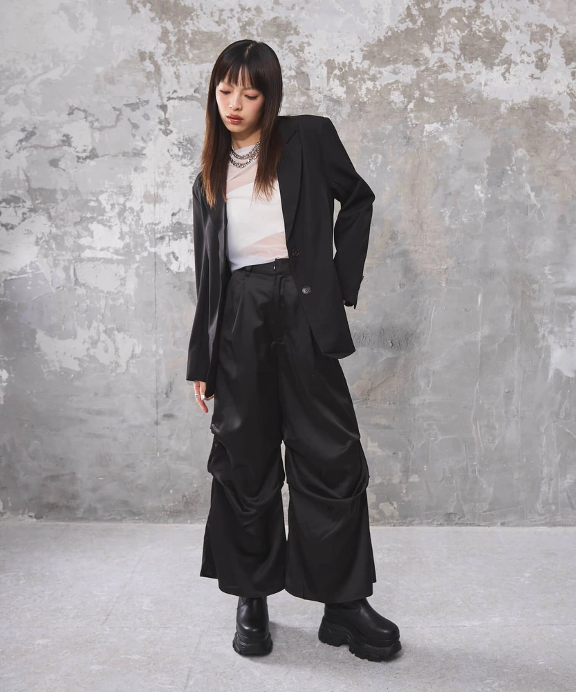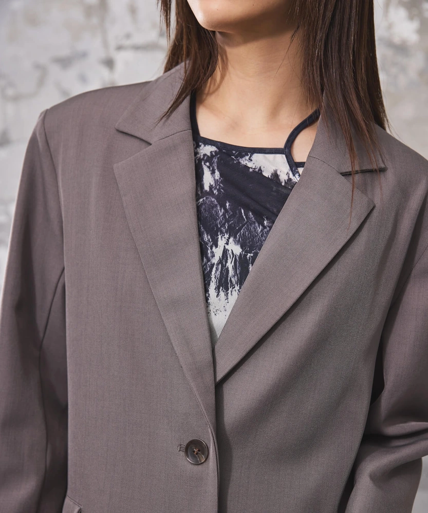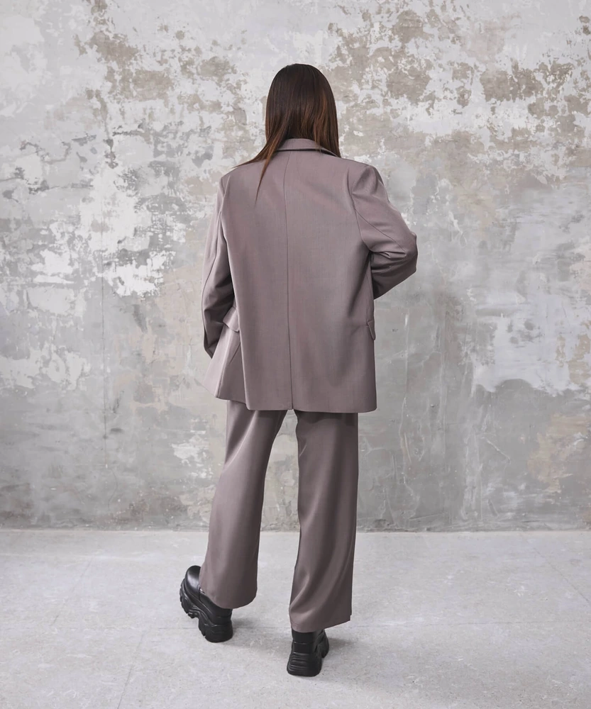 このオーバーサイズジャケットは、グレーのみ同素材のタック入りワイドパンツとセットアップスタイルとしても着用可能です。