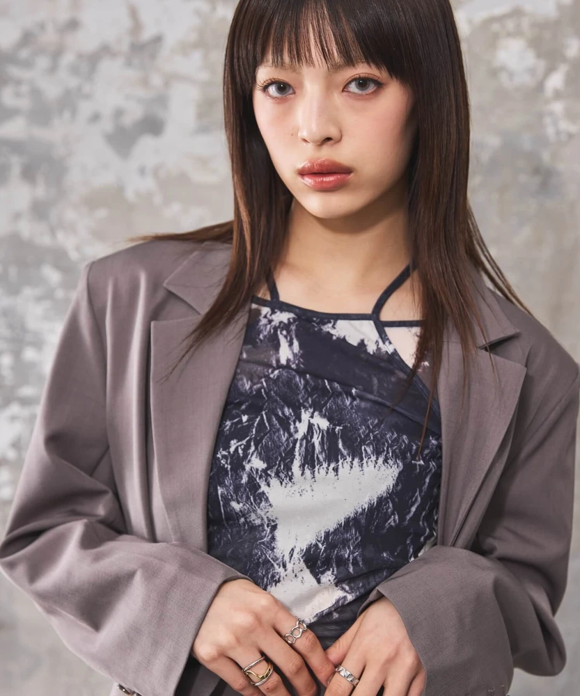 アート風のプリントトップスをジャケットの下に合わせ、タック入りワイドパンツでシルエットに動きを出します。