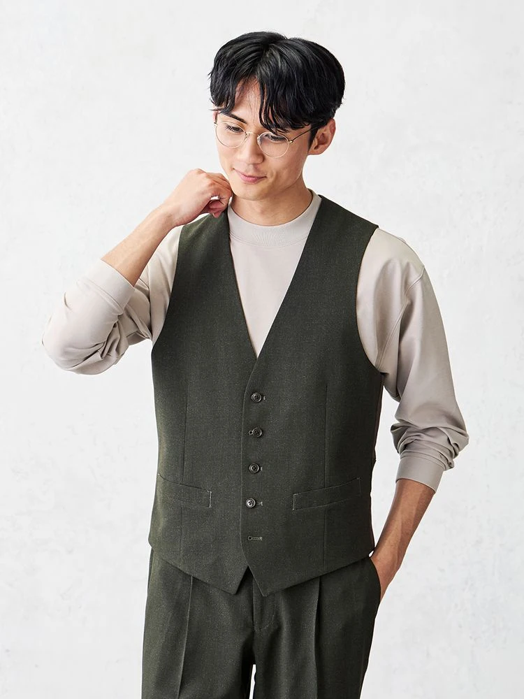 別売りの同じ素材ジャケットとパンツとセットで着られる、3ピースのベスト。
