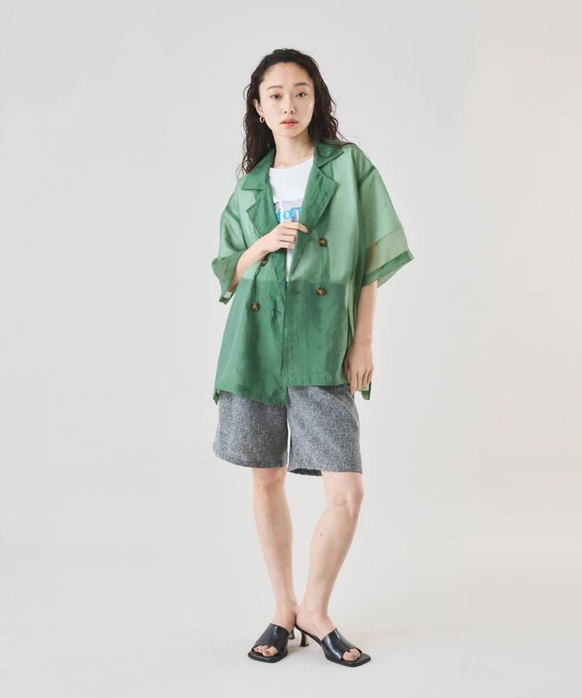 ・シアーシャツを羽織ってトップスとパンツの異素材合わせを楽しむのもおすすめ