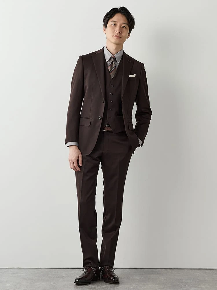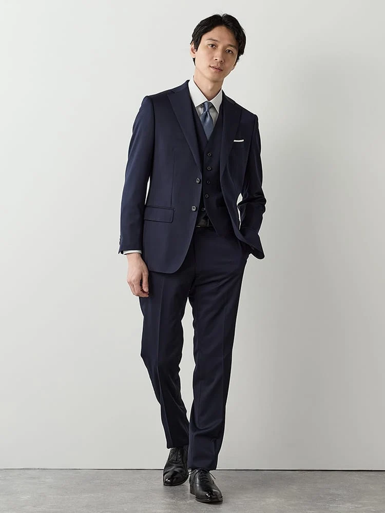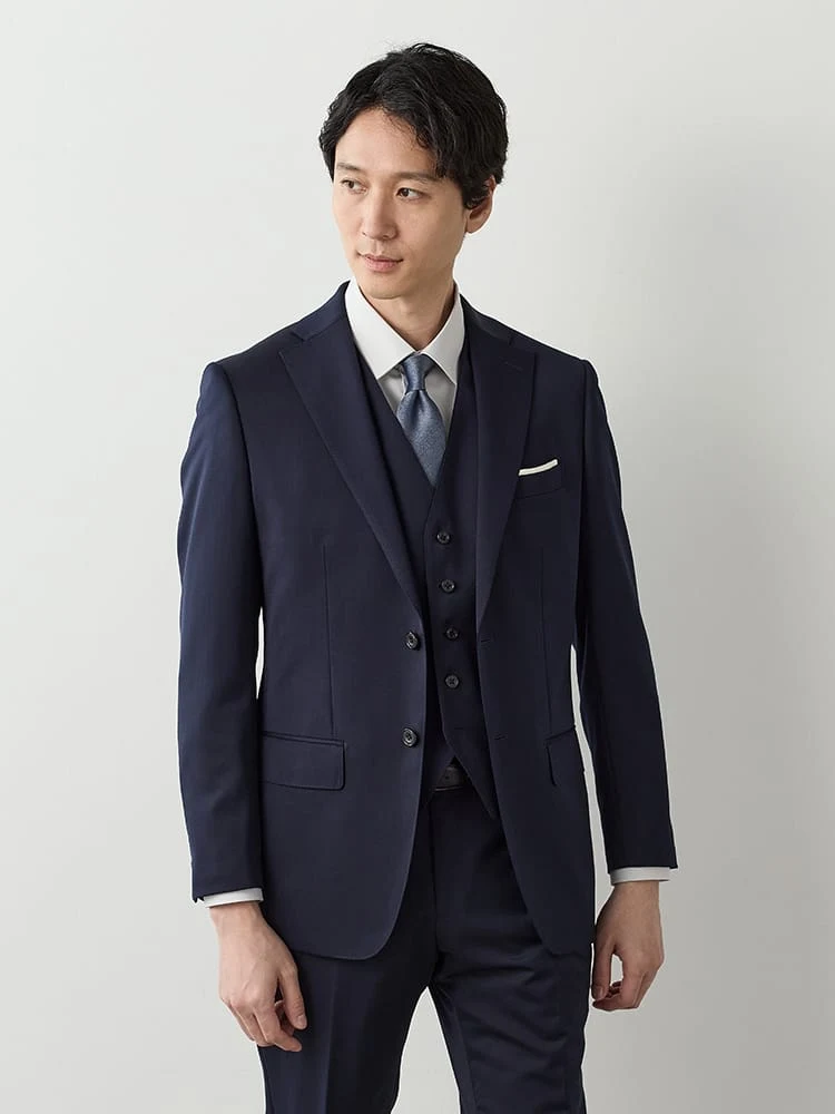 3シーズン、様々なシーンで着用可能な無地の3ピーススーツ。