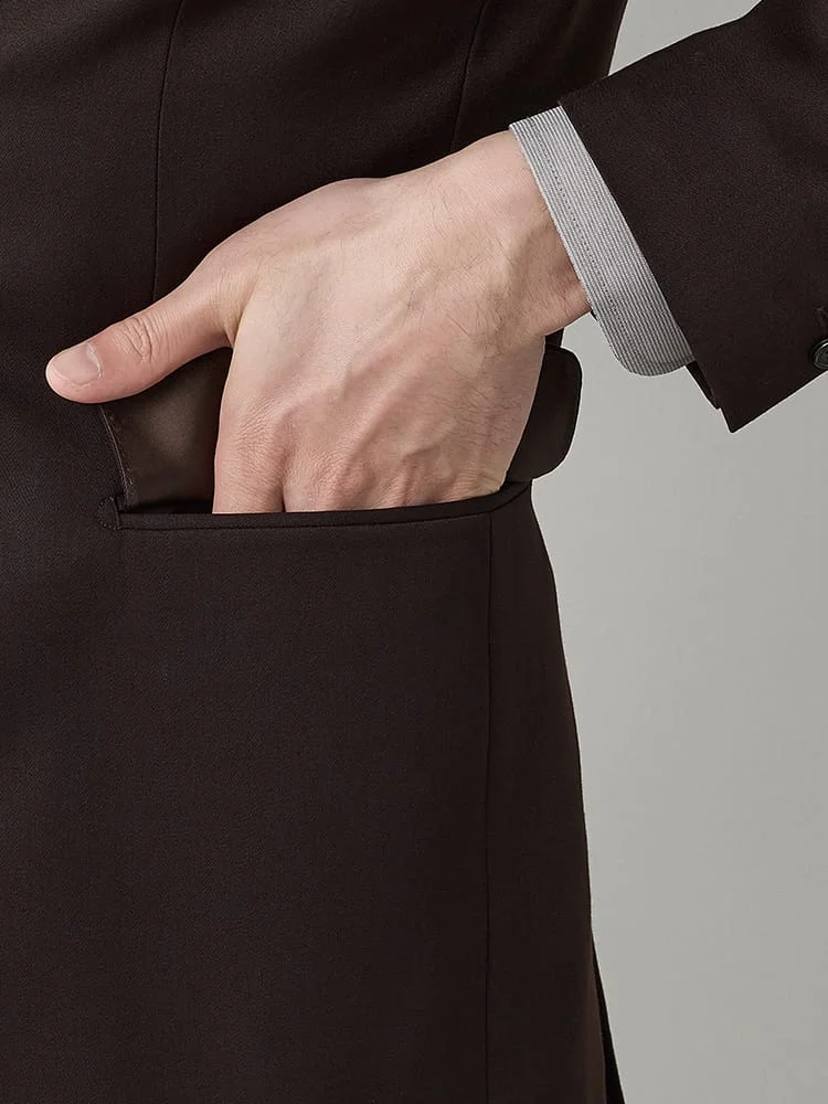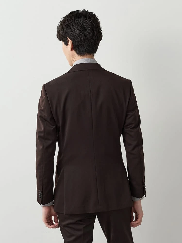 ジャケットはサイドベンツや開き見せ切羽、背抜き仕立てを採用し、チェンジポケットを省くことでスッキリとしたデザインに。