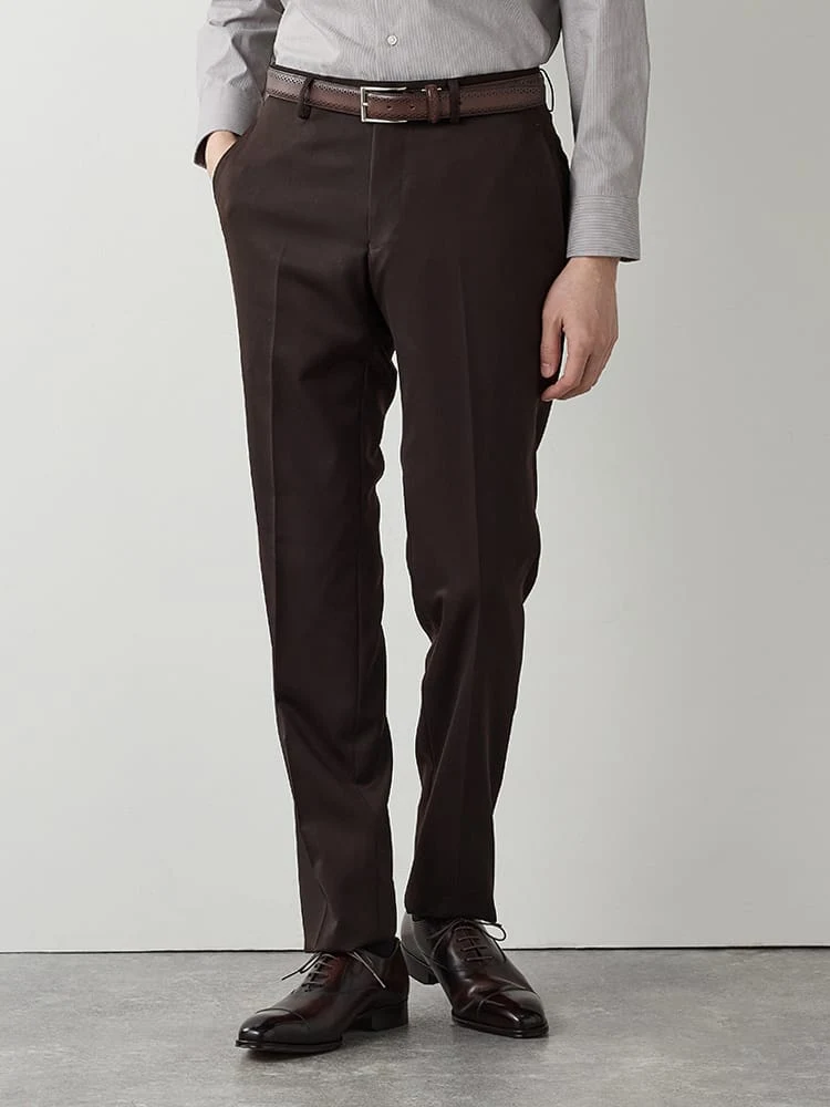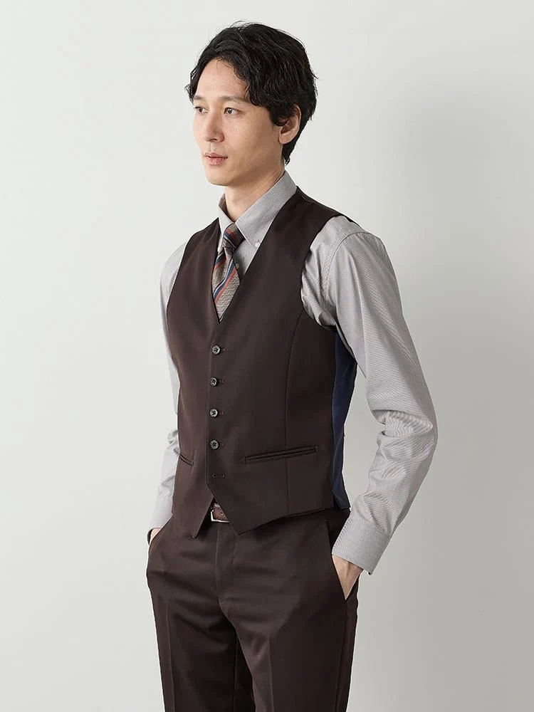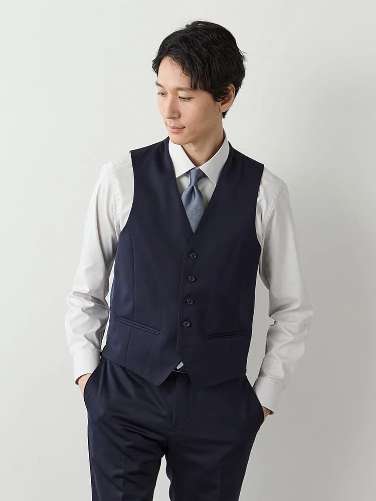 端正な2ボタンジャケット、ノータックスラックス、ベストをセットにしています。