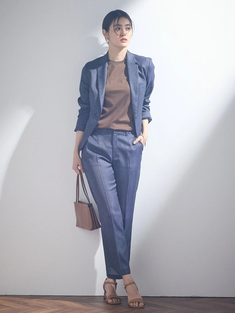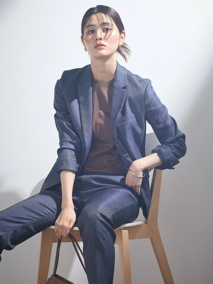 デニム生地でスーツを仕立て、カジュアルながらもきちんと感のある表情に仕上げました。