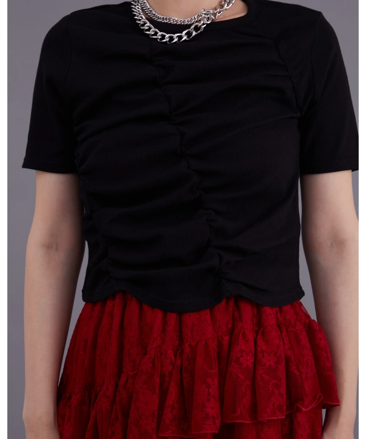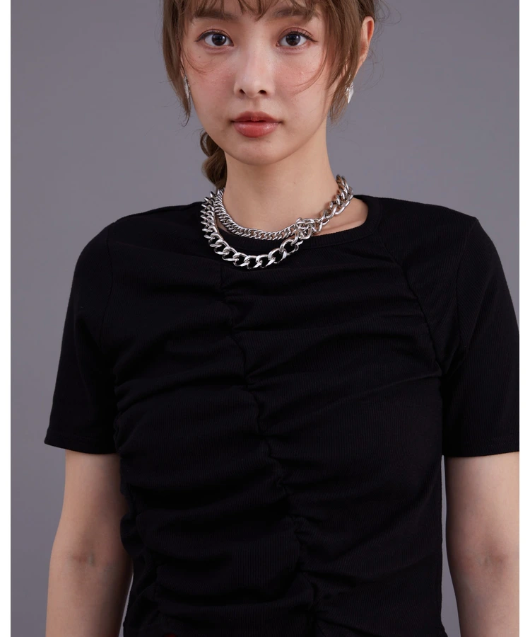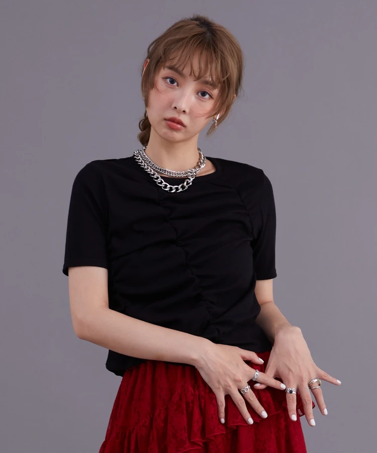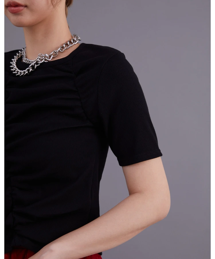 「フロントギャザーリブTシャツ」は、シンプルでありながらフロント部分のギャザーが特徴的なデザインのトップスです。ギャザーによるさりげない立体感が、女性らしいシルエットを美しく際立たせてくれます。さらに、リブ素材を使用しているため体のラインに自然になじみ、快適な着心地を提供します。