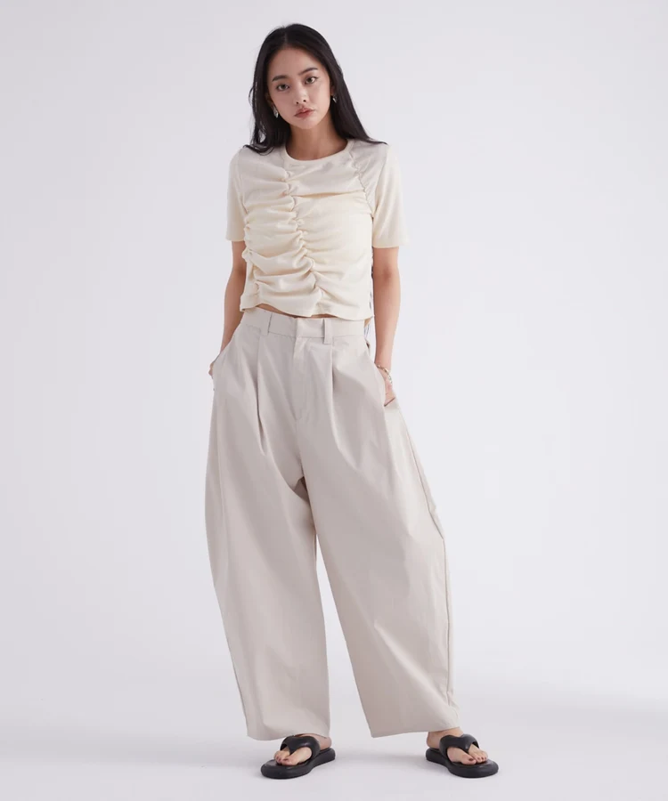 ポイント: トップスのギャザーを活かしつつ、シンプルなモノトーンアイテムでまとめると都会的な雰囲気に仕上がります。