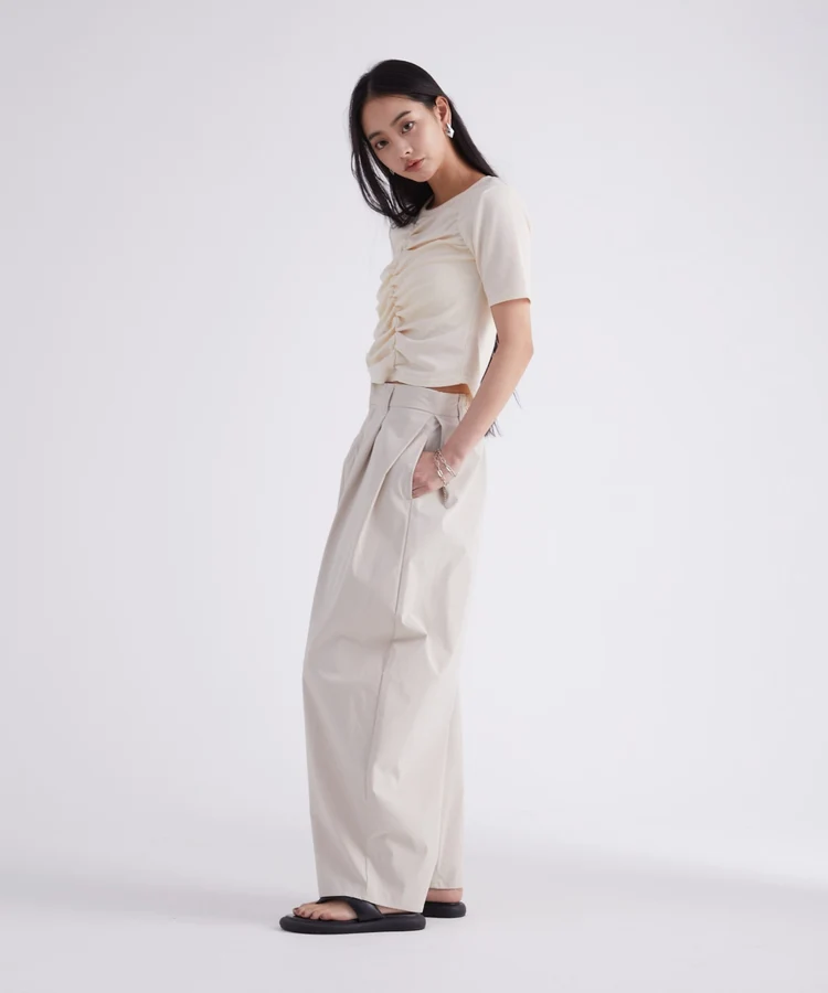 「フロントギャザーリブTシャツ」は、そのシンプルさの中に絶妙なデザインポイントを持つアイテム。ギャザーがナチュラルな立体感を与えており、着こなしにさりげない華やかさをプラスします。デイリー使いから特別なシーンまで幅広いスタイリングが可能で、ボトムスを選ばず合わせやすいところも魅力です。