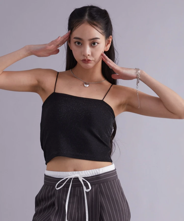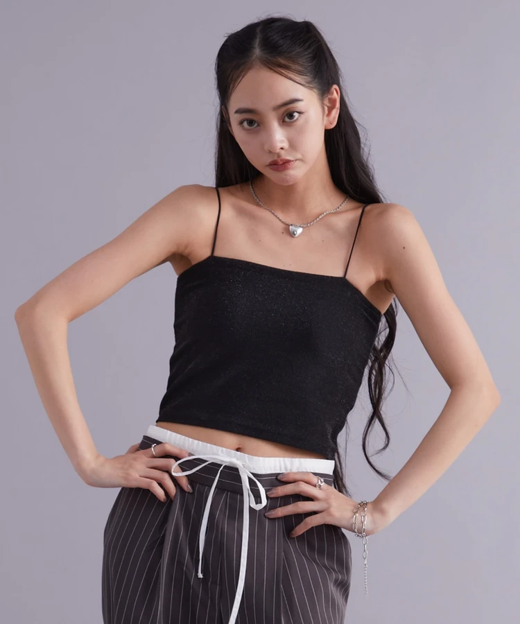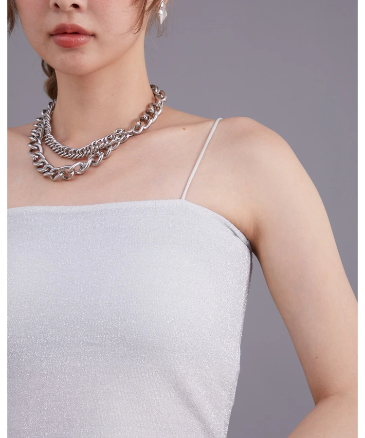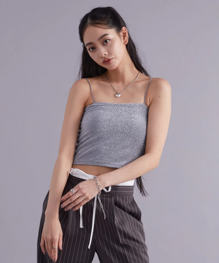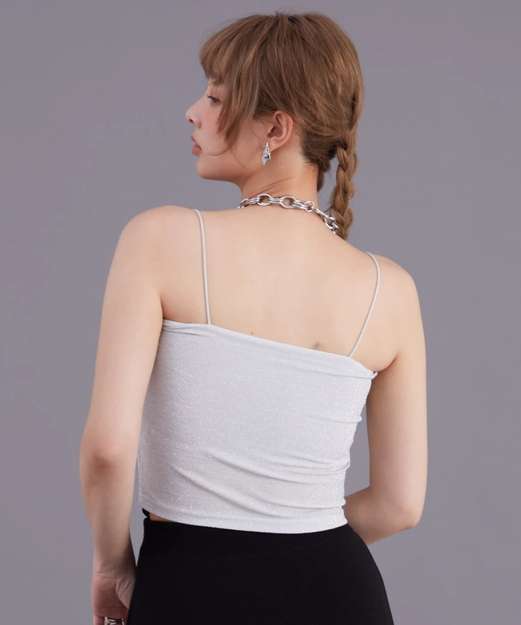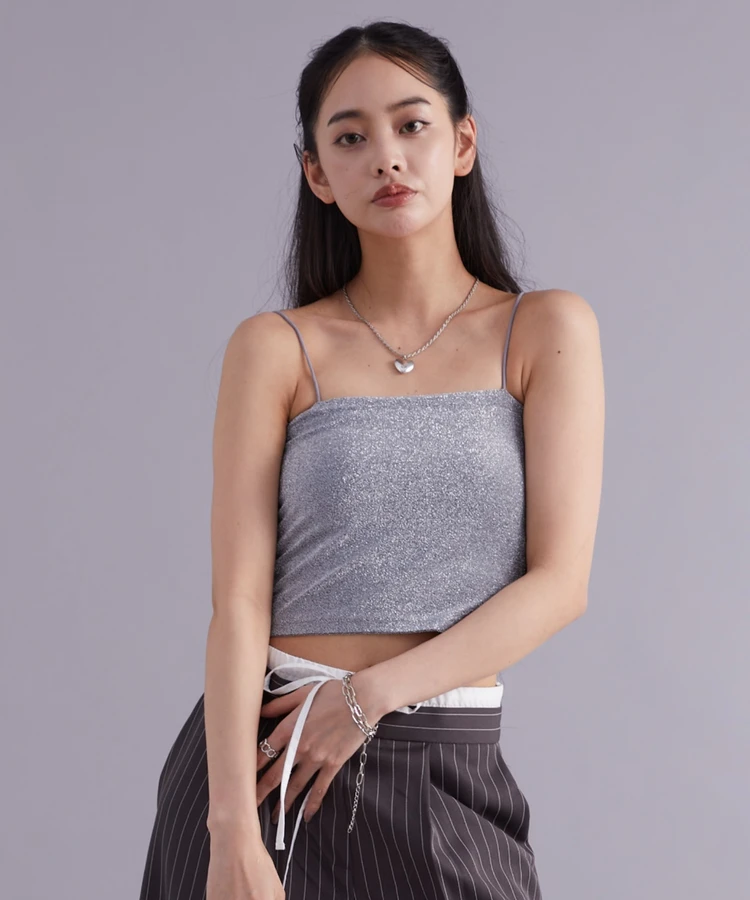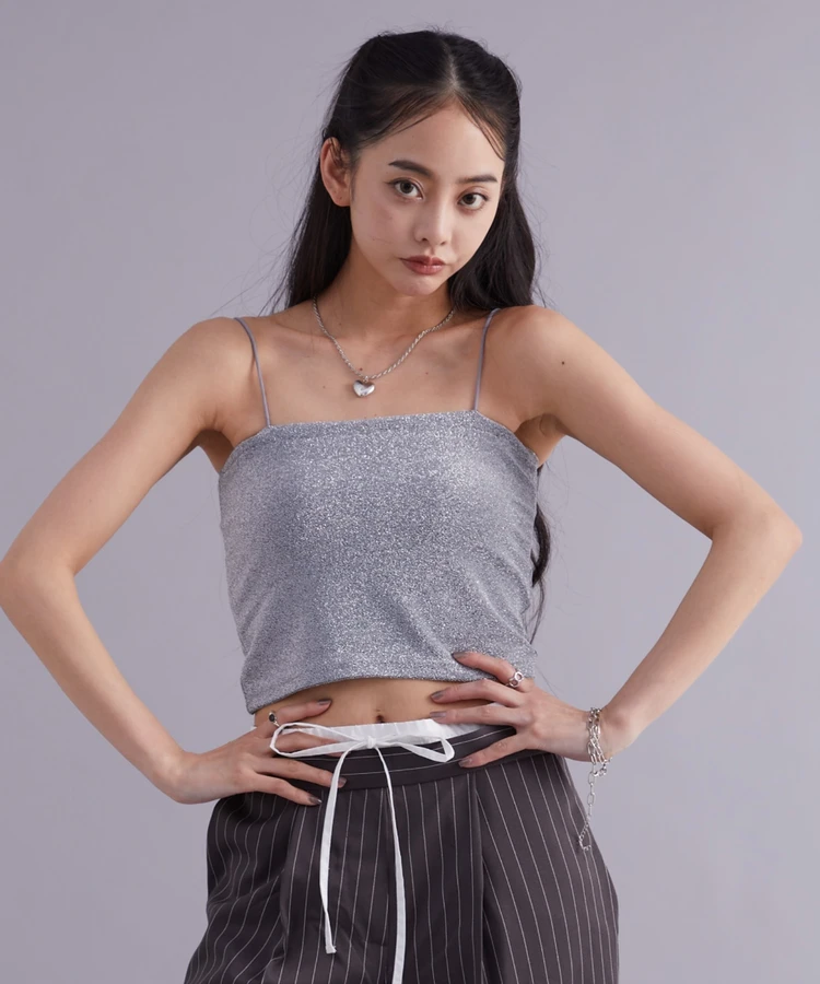 「ラメベアトップ」は、華やかなラメ素材が目を引くコンパクトなデザインのキャミソールです。上品な光沢感を備えたラメ仕上げが特徴で、シンプルながら存在感のあるアイテム。大胆なベアトップデザインがデコルテラインを美しく引き立て、女性らしい魅力を最大限に引き出してくれる一着です。