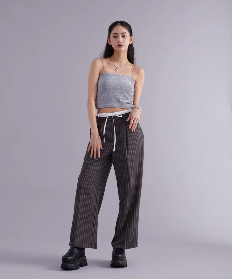 「ラメベアトップ」は、1枚で華やかな存在感を放つアイテムです。単体でパーティーシーンの主役にしたり、レイヤードスタイルでアクセントに使ったりと、多様なコーディネートが楽しめます。素材の光沢感がシンプルながらも高級感を演出し、どんなシーンでもおしゃれに映える万能アイテムです。