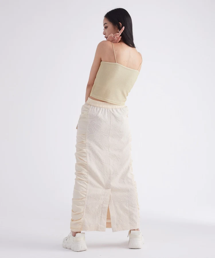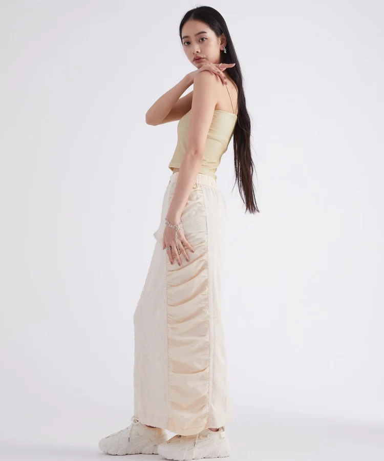 ボトムス: フレアスカートやプリーツスカートを合わせて華やかな雰囲気に。