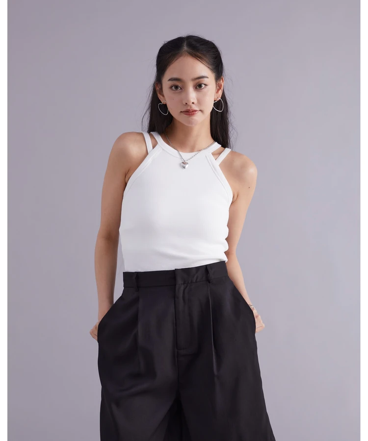 肩紐部分が華奢なストラップ仕様になっているため、すっきりとしたシルエットを楽しむことができます。単体で主役として、またはレイヤードスタイルのアクセントとしても使える汎用性の高いアイテムです。