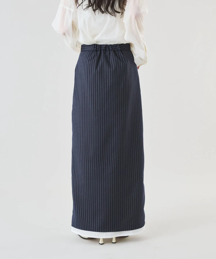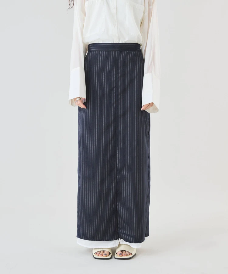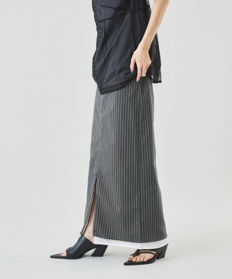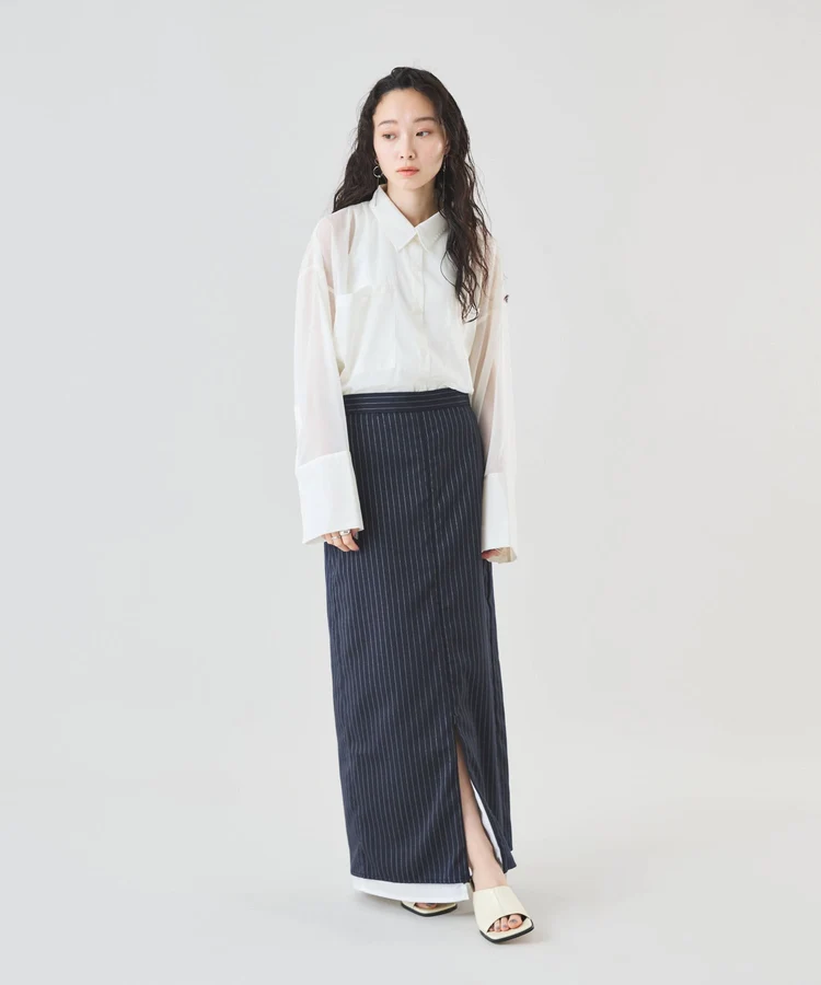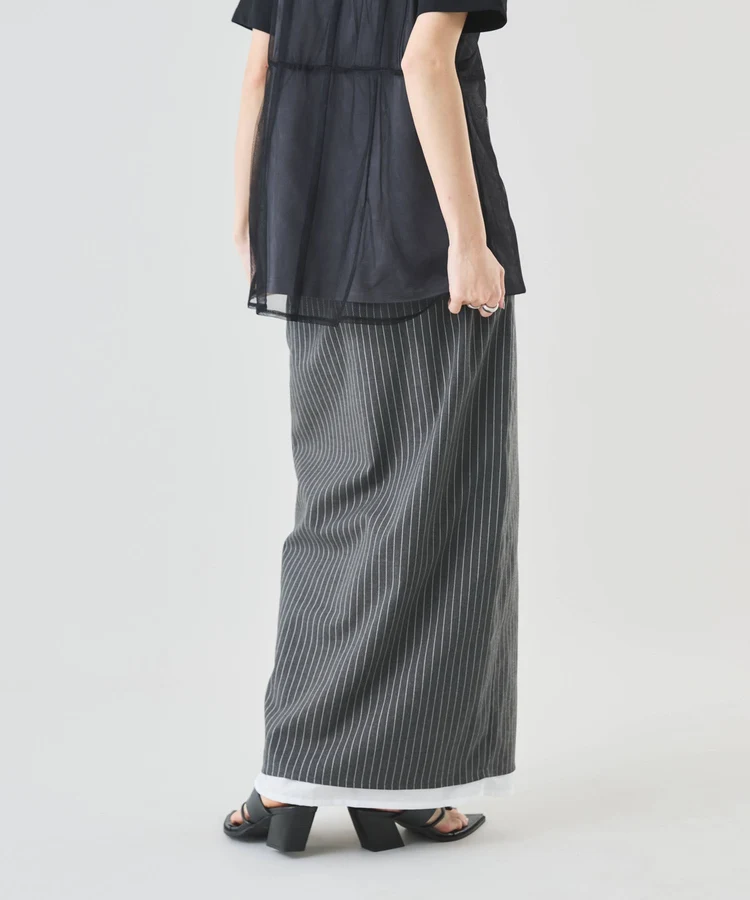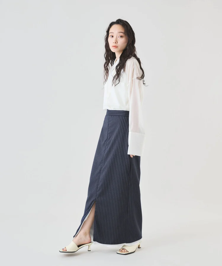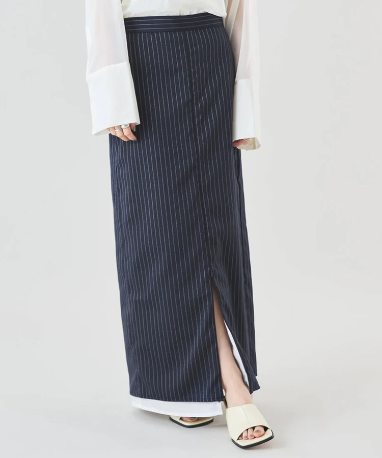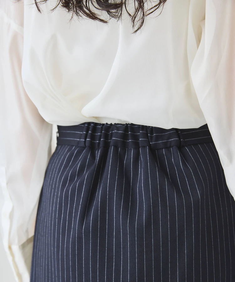 シャープなピンストライプ生地とストレートシルエットが美脚見えの大人なスカート。