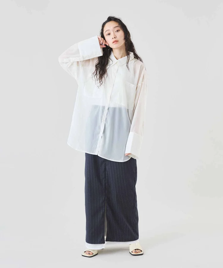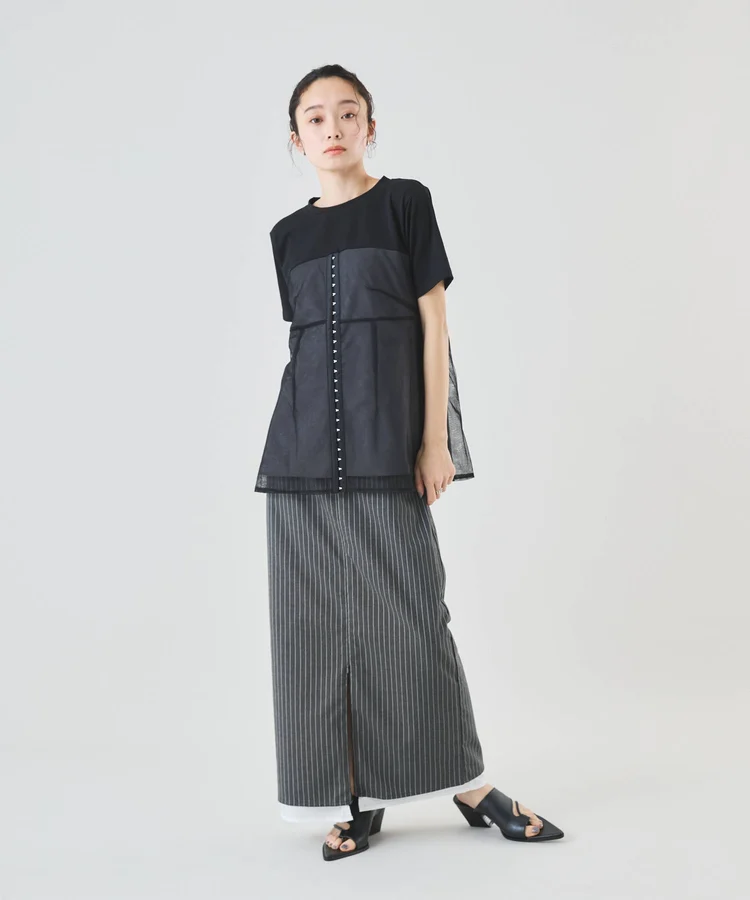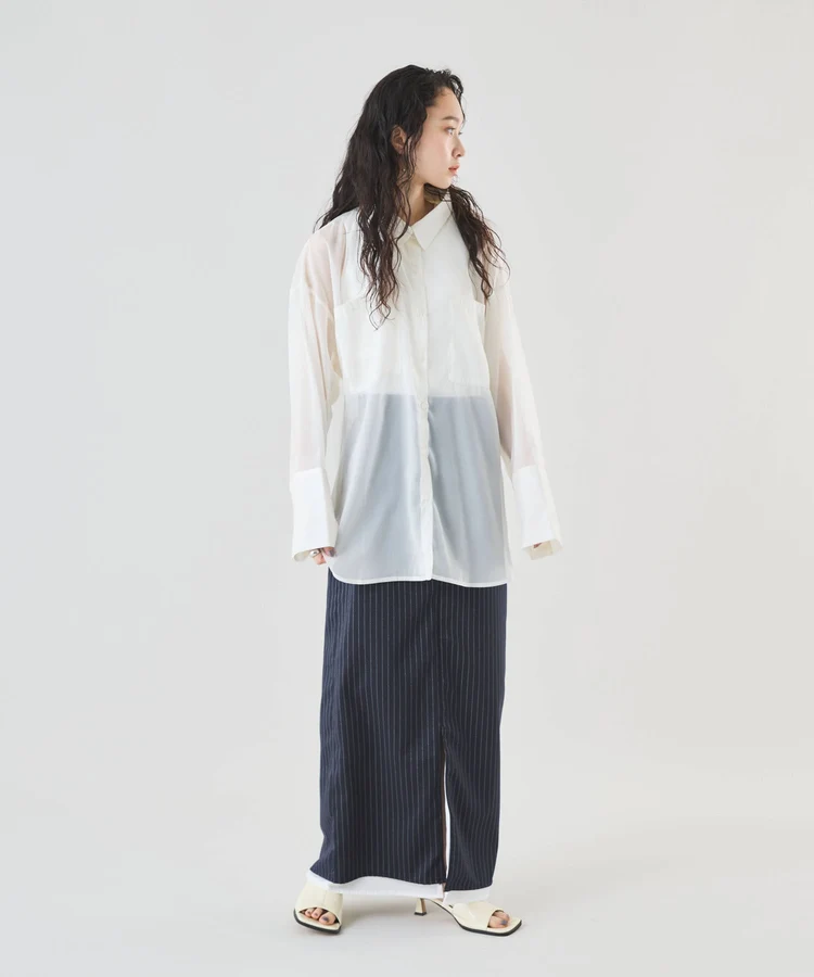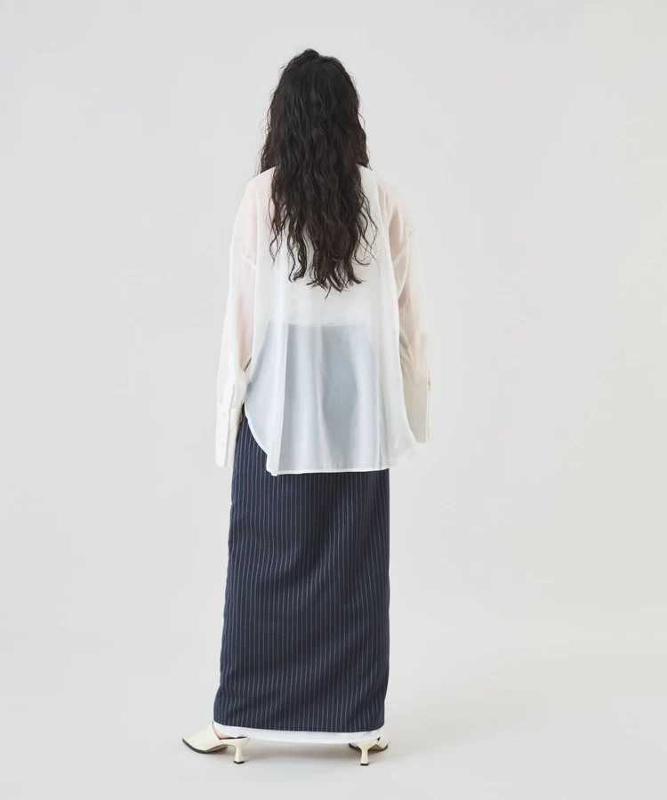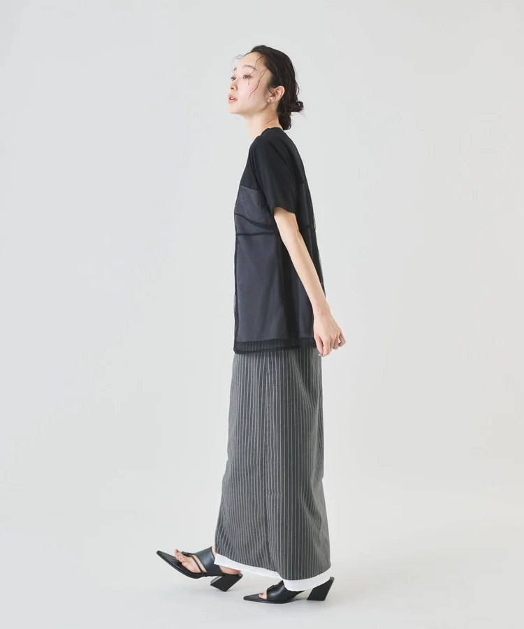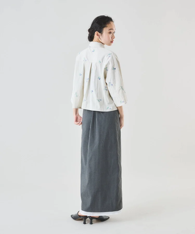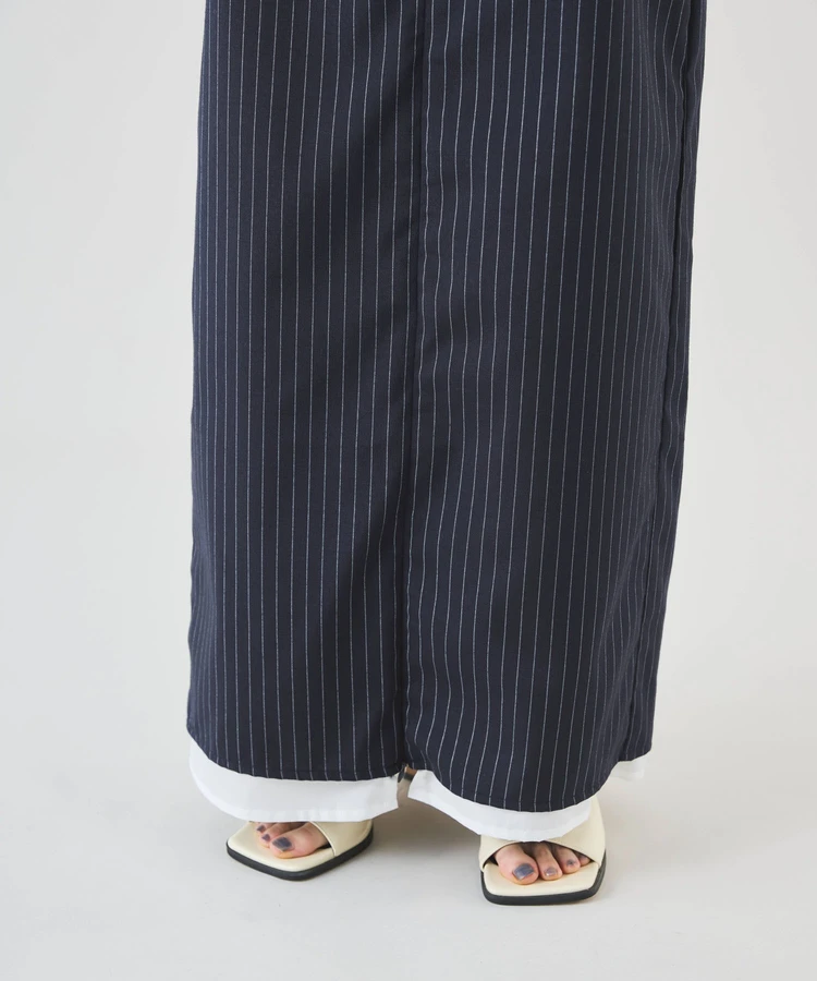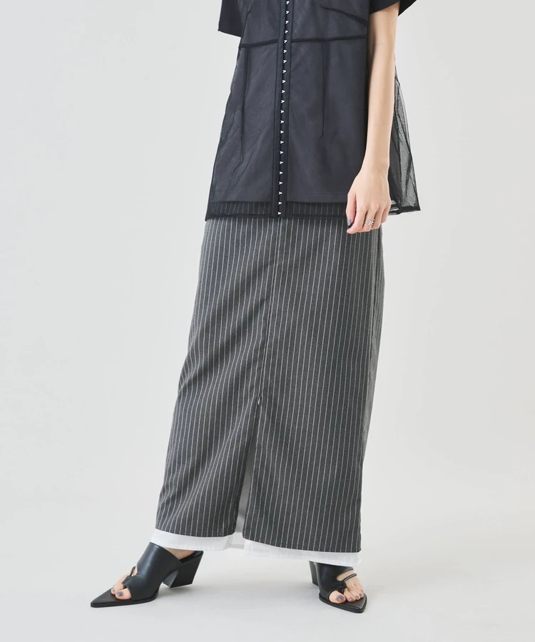 シャープなピンストライプ生地とストレートシルエットが美脚見えの大人なスカート。