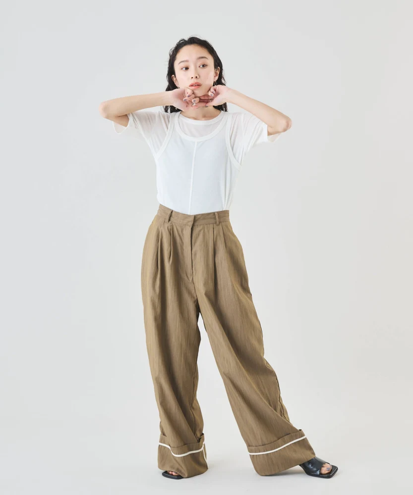 ・裾パイピングがさりげないアクセントになるので、トップスは単色にして足元に目が行くスタイルに