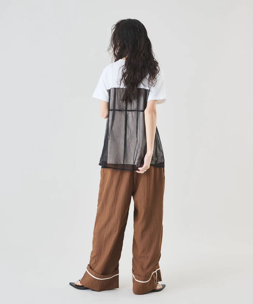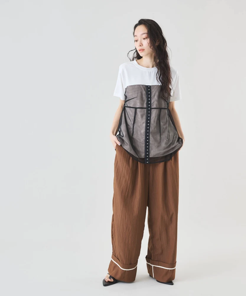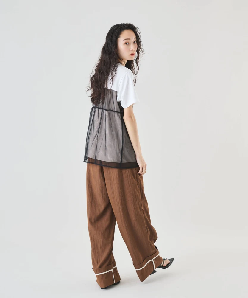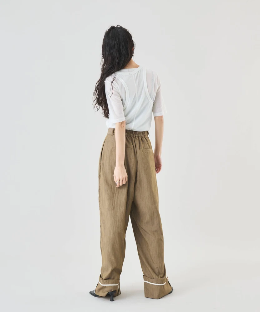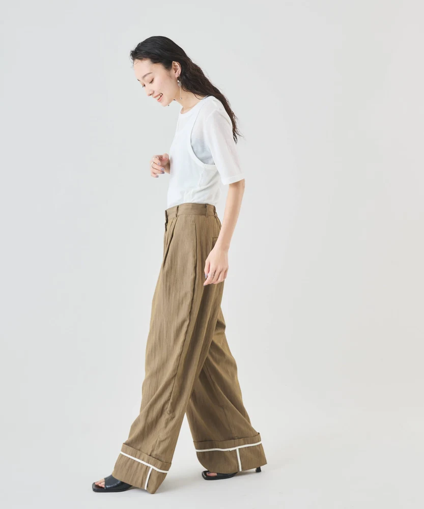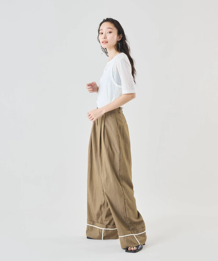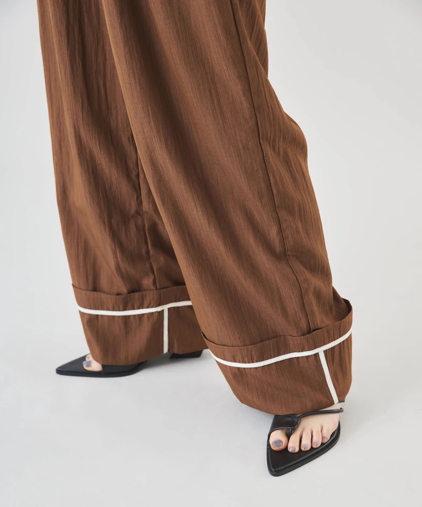 裾に入った配色パイピングデザインが特徴のワイドパンツ。