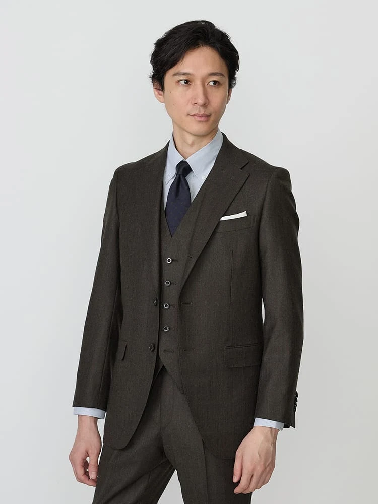 ウォーミー感のある質感の素材に乗せた小紋柄が、Vゾーンをクラシカルに彩ります。