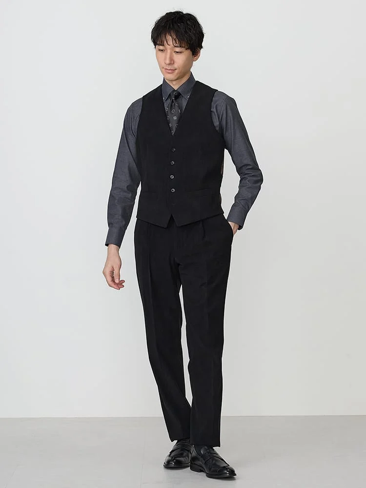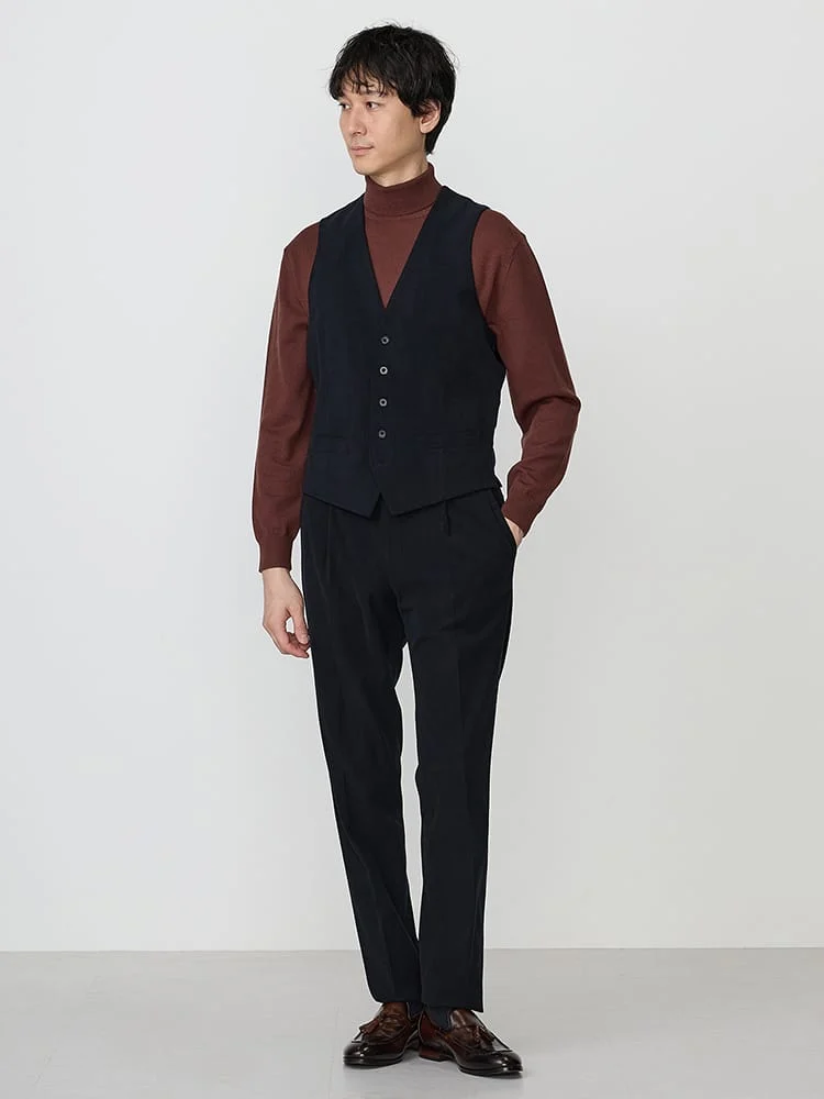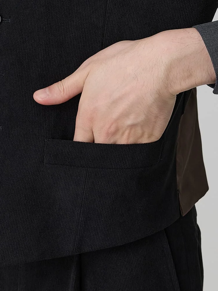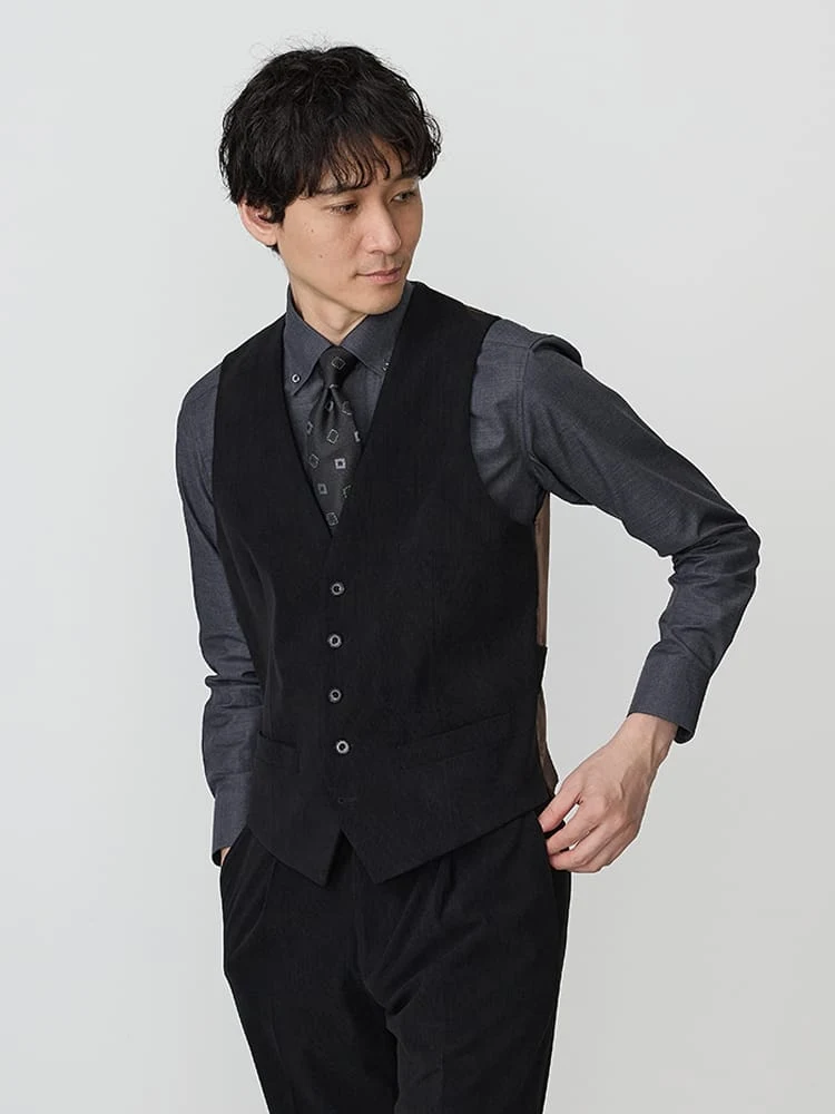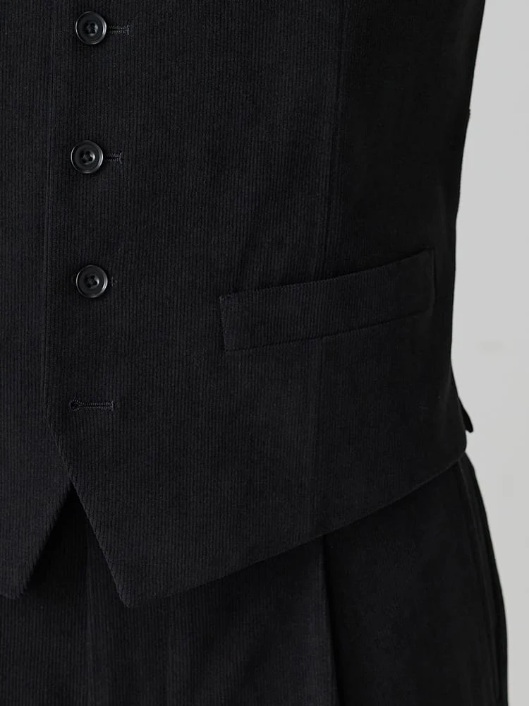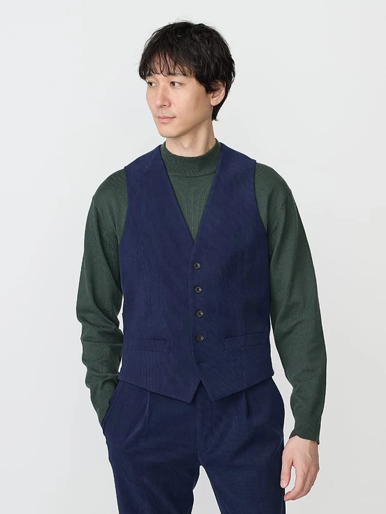 ポリエステルのトリコットコーデュロイ生地のセットアップベスト。